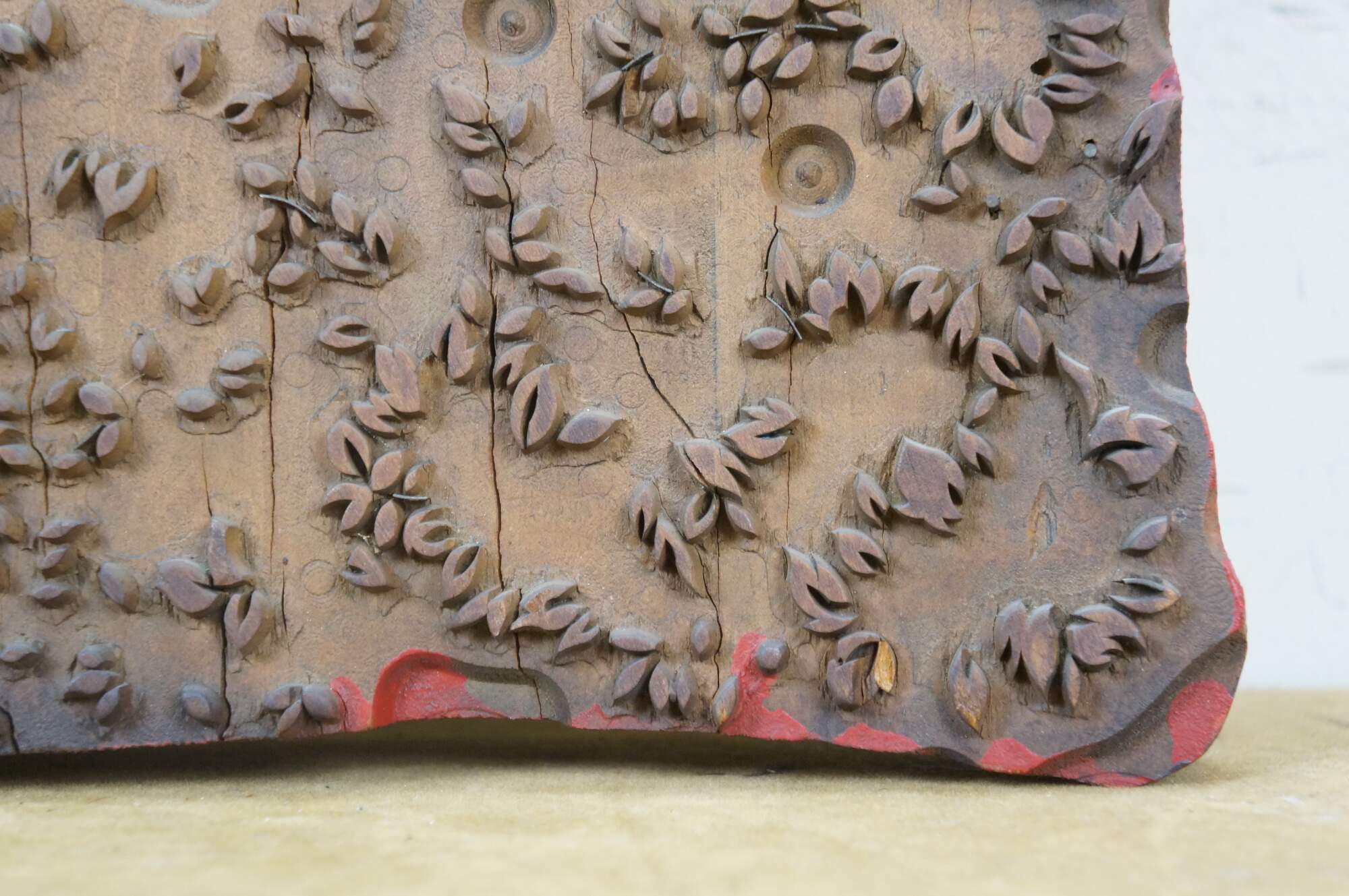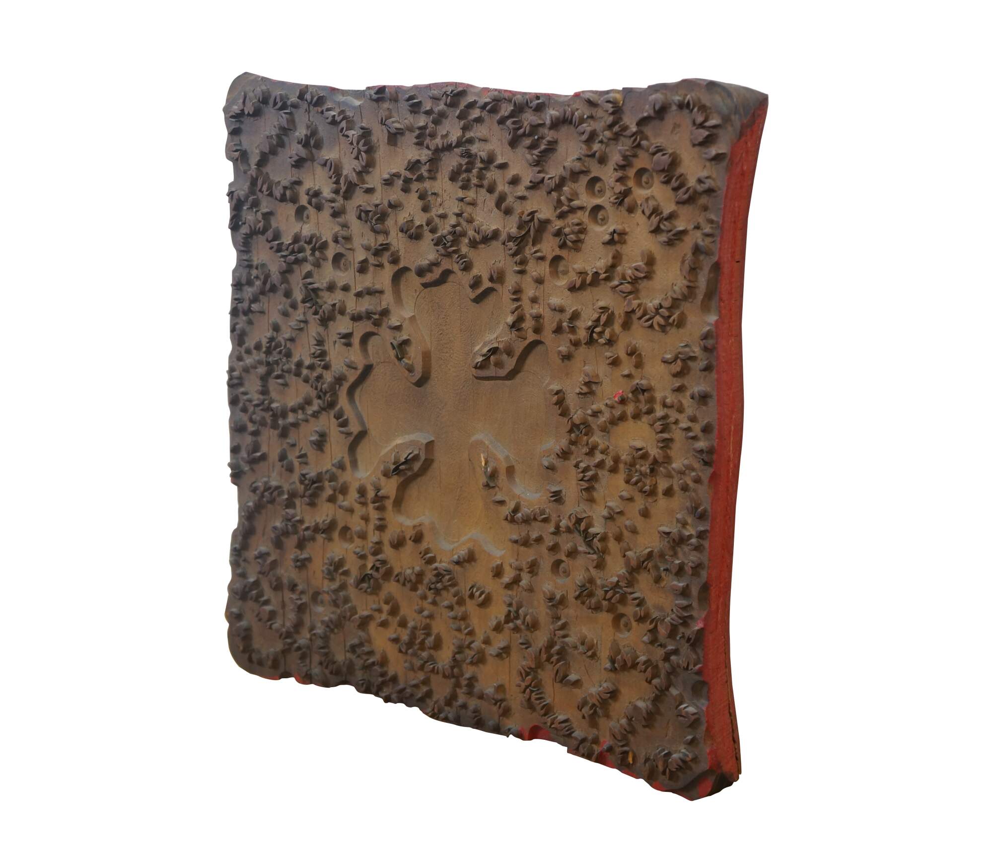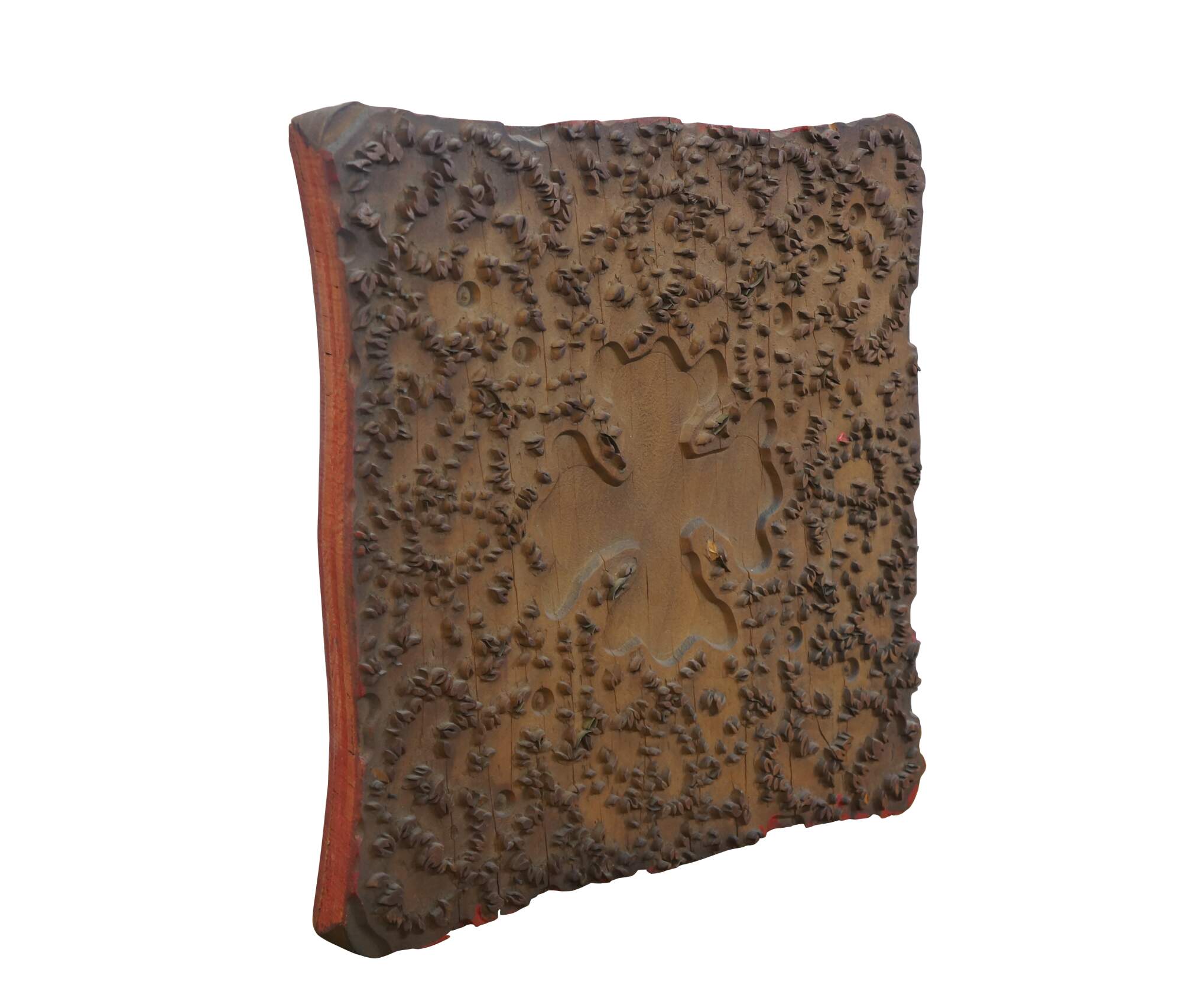 Antique French wallpaper pringing block featuring a Maltese Cross / clover shaped medallion surrounded by floral buds. Circa 1850, Made in France.