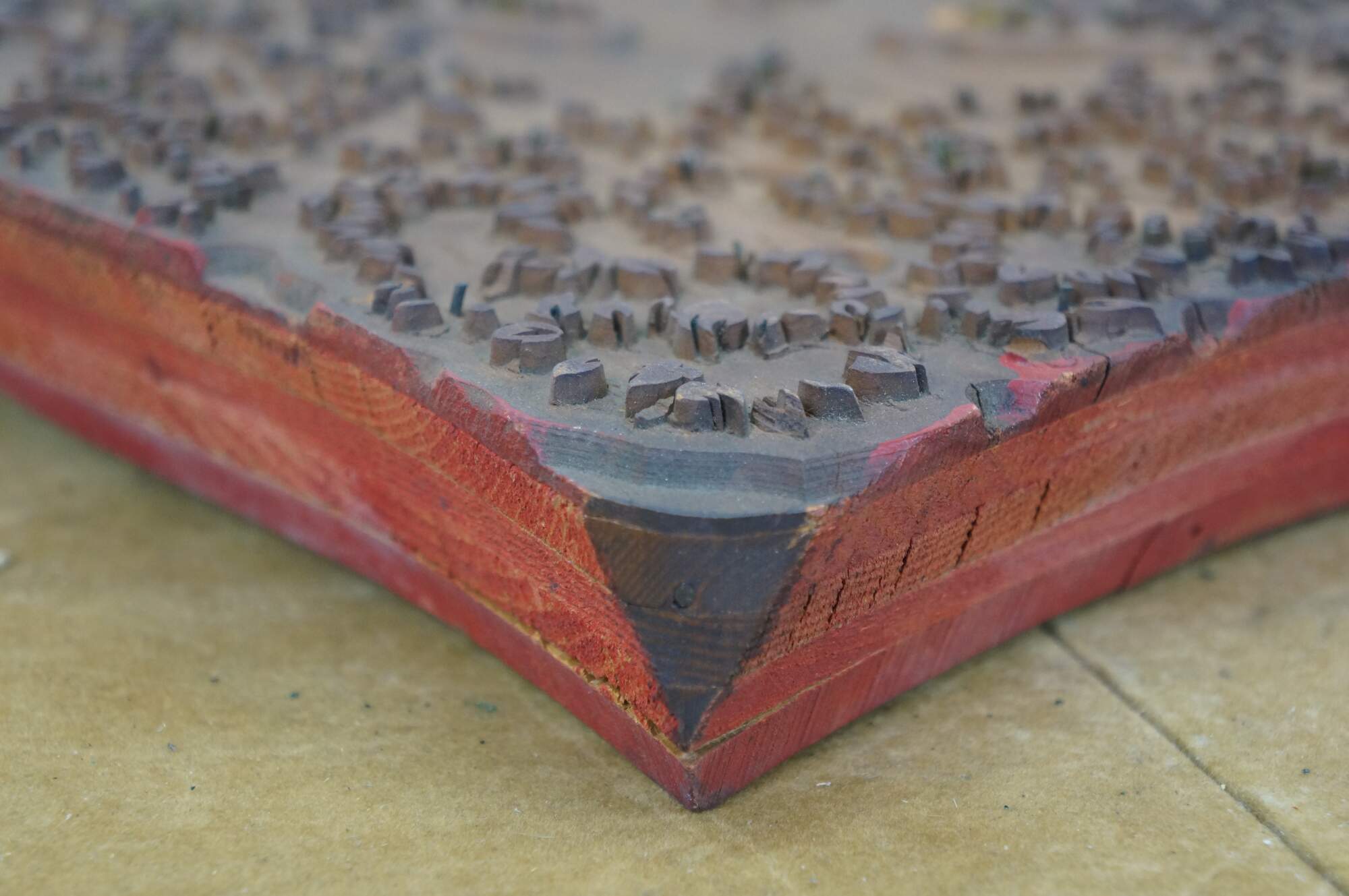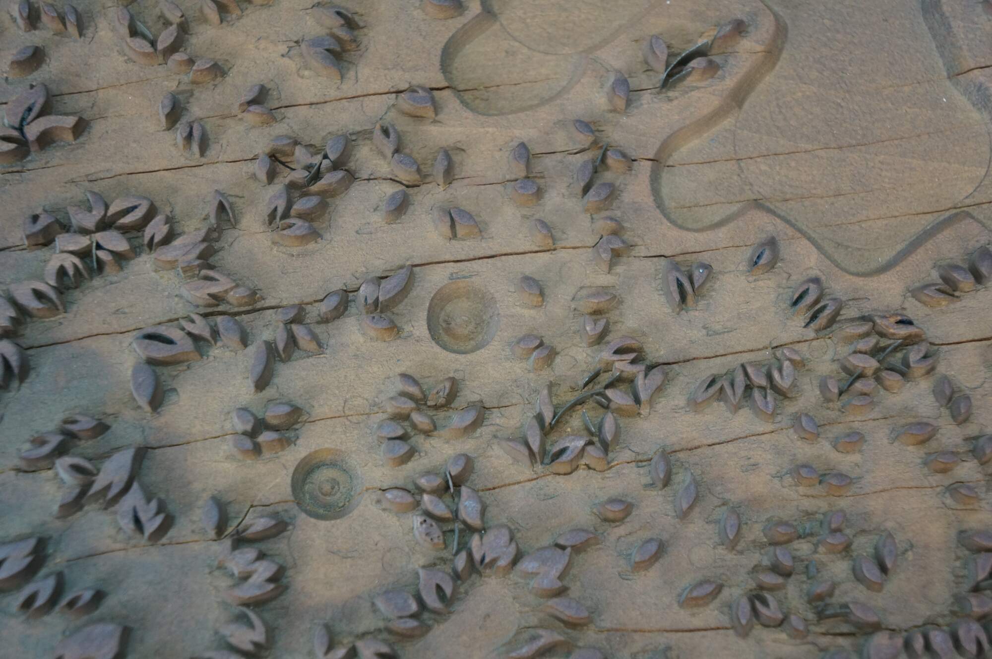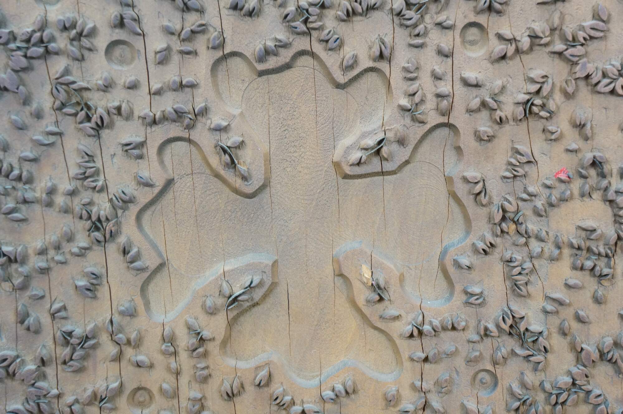 Antique French wallpaper pringing block featuring a Maltese Cross / clover shaped medallion surrounded by floral buds. Circa 1850, Made in France.