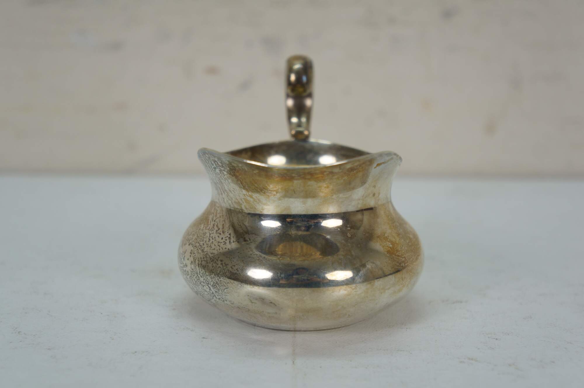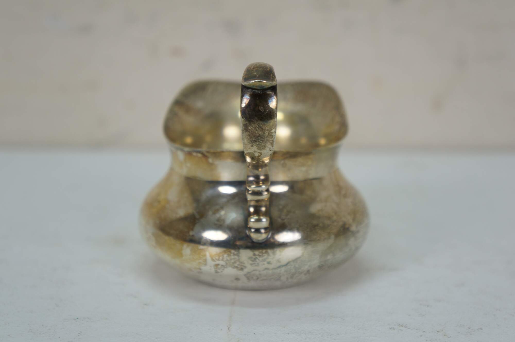 Vintage 20th century Poole sterling silver gravy / sauce boat and underplate. Georgian style with squat round shape and scrolling handle; underplate trimmed with rope twist edge.
