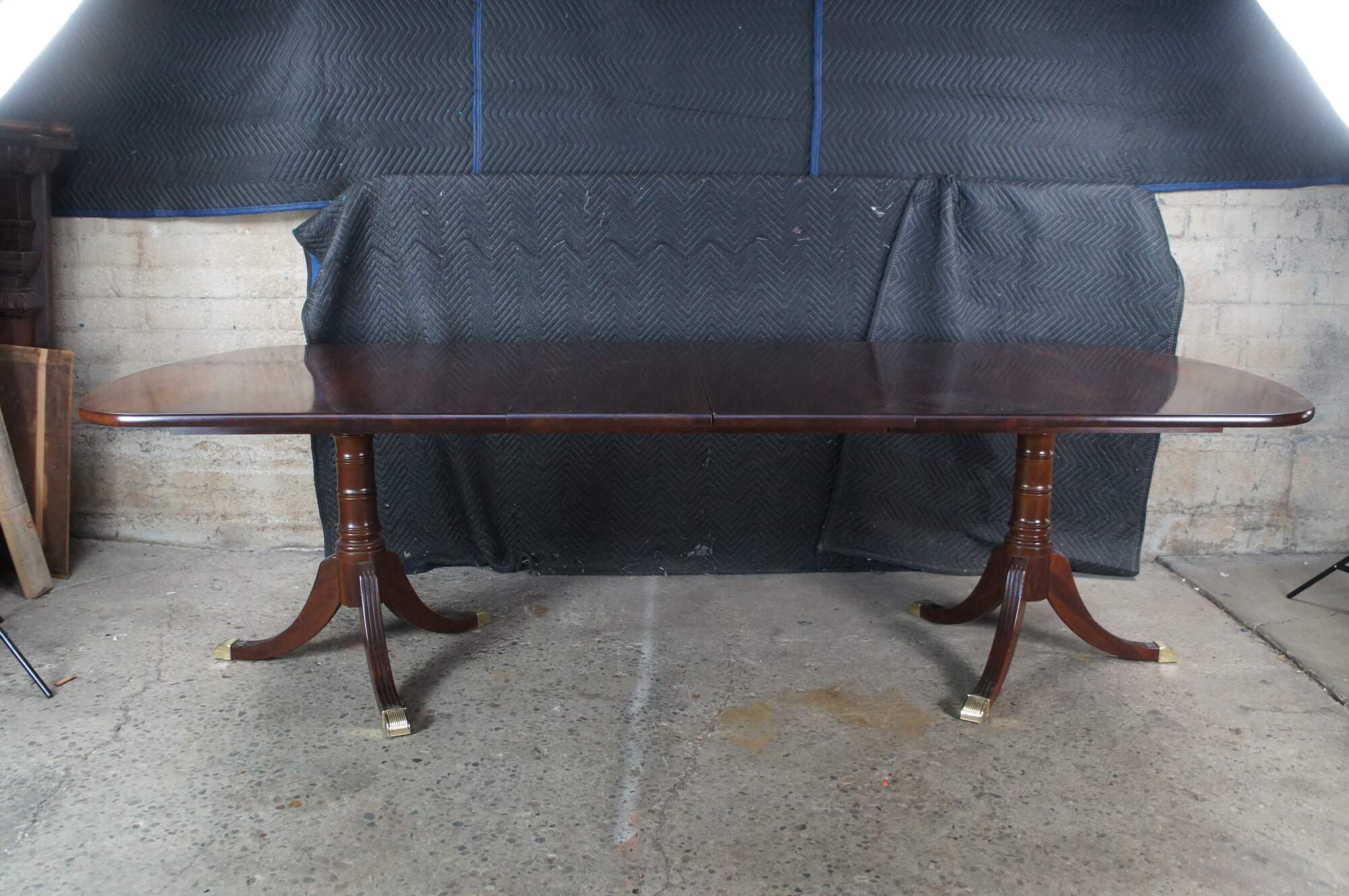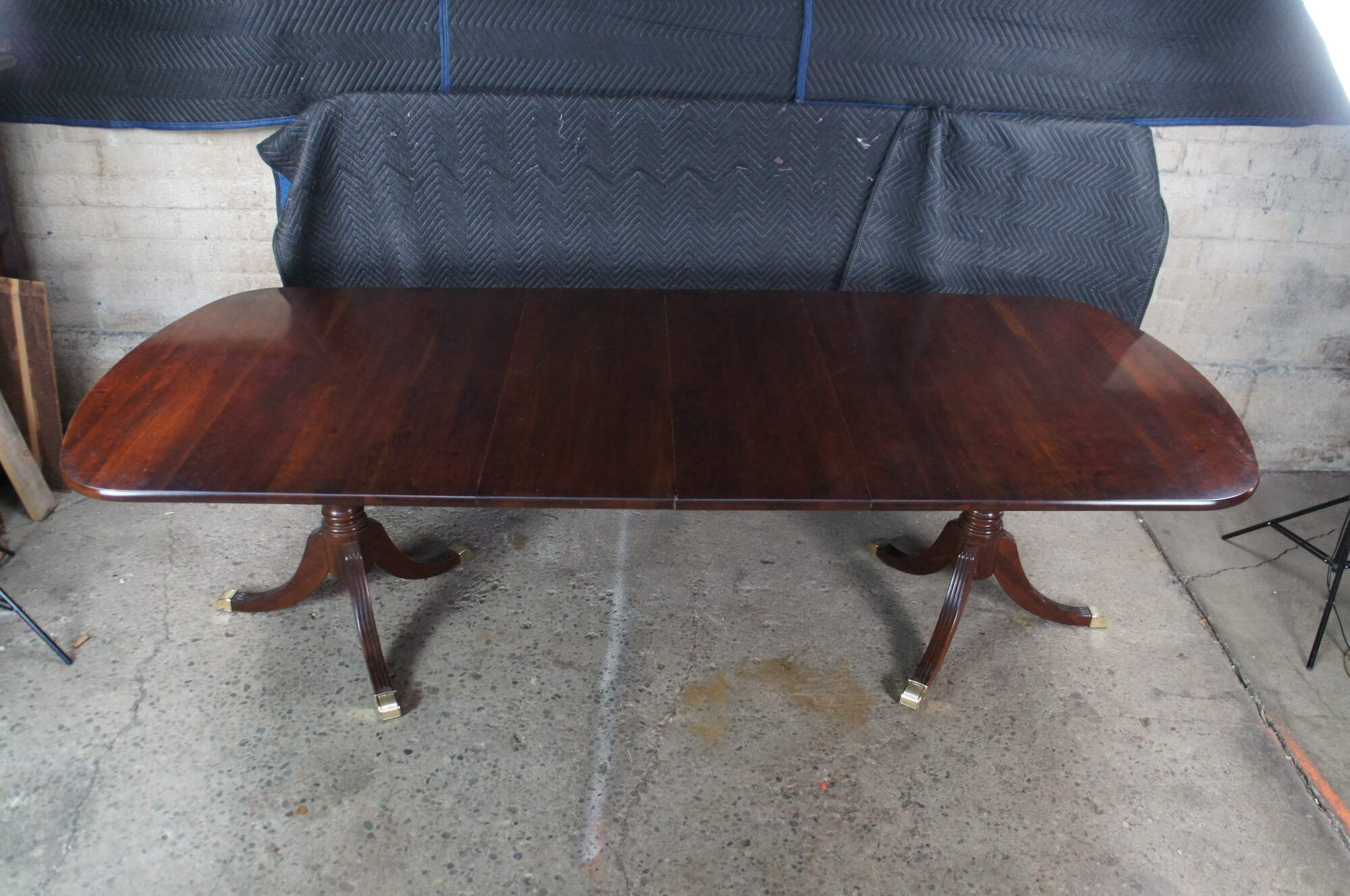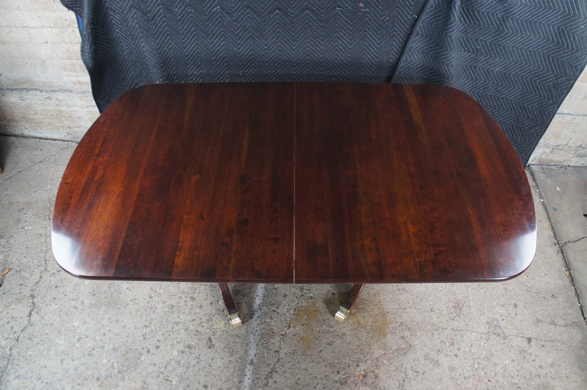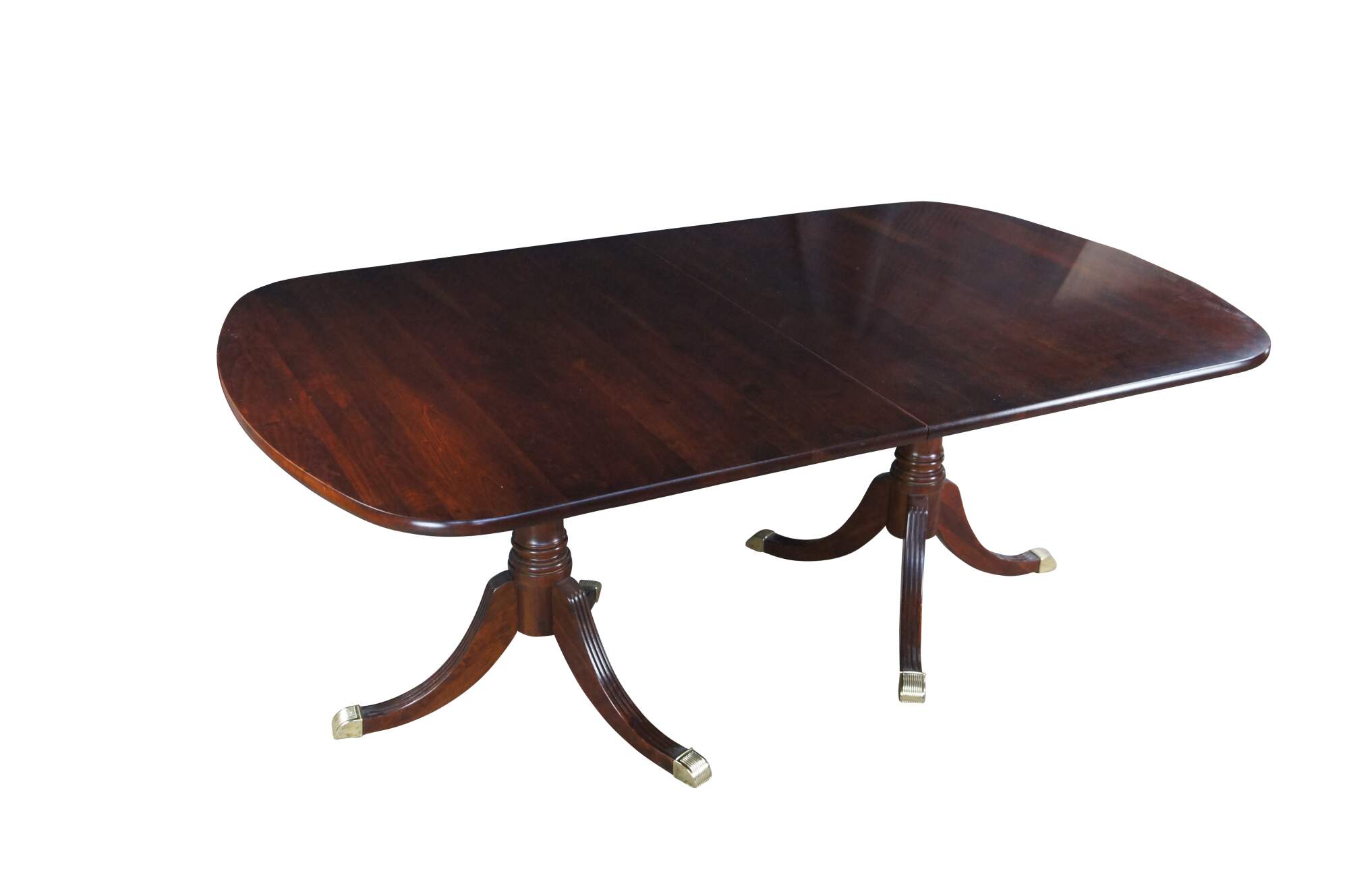 A stately solid cherry dining table by Williams Sonoma Home. Features a English Regency styling with a cherry top over ribbed double pedestals with downswept saber legs and brass capped feet. Includes three leaves for extension.