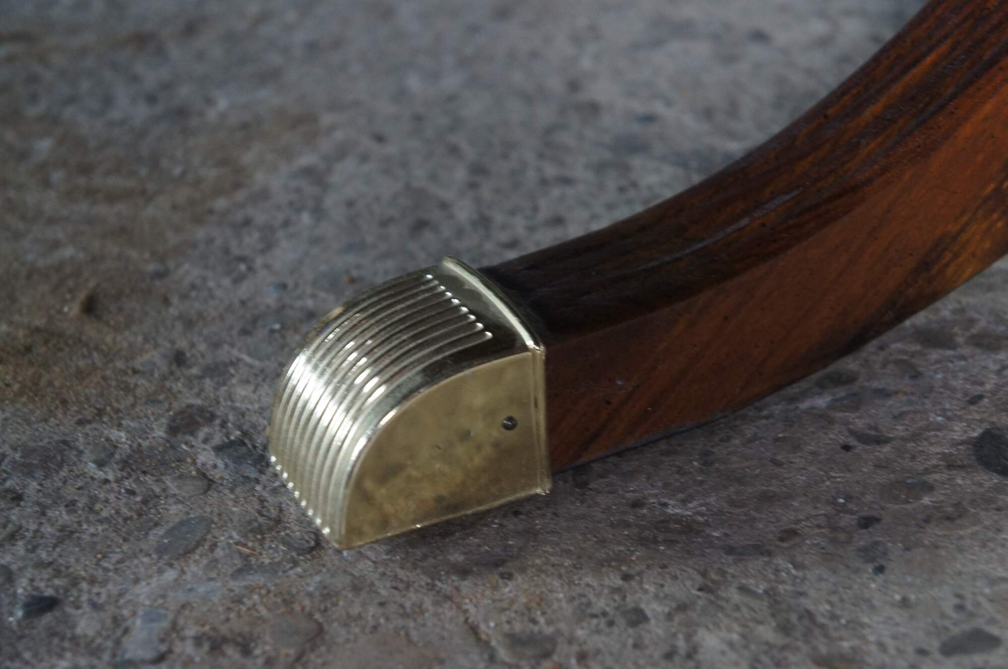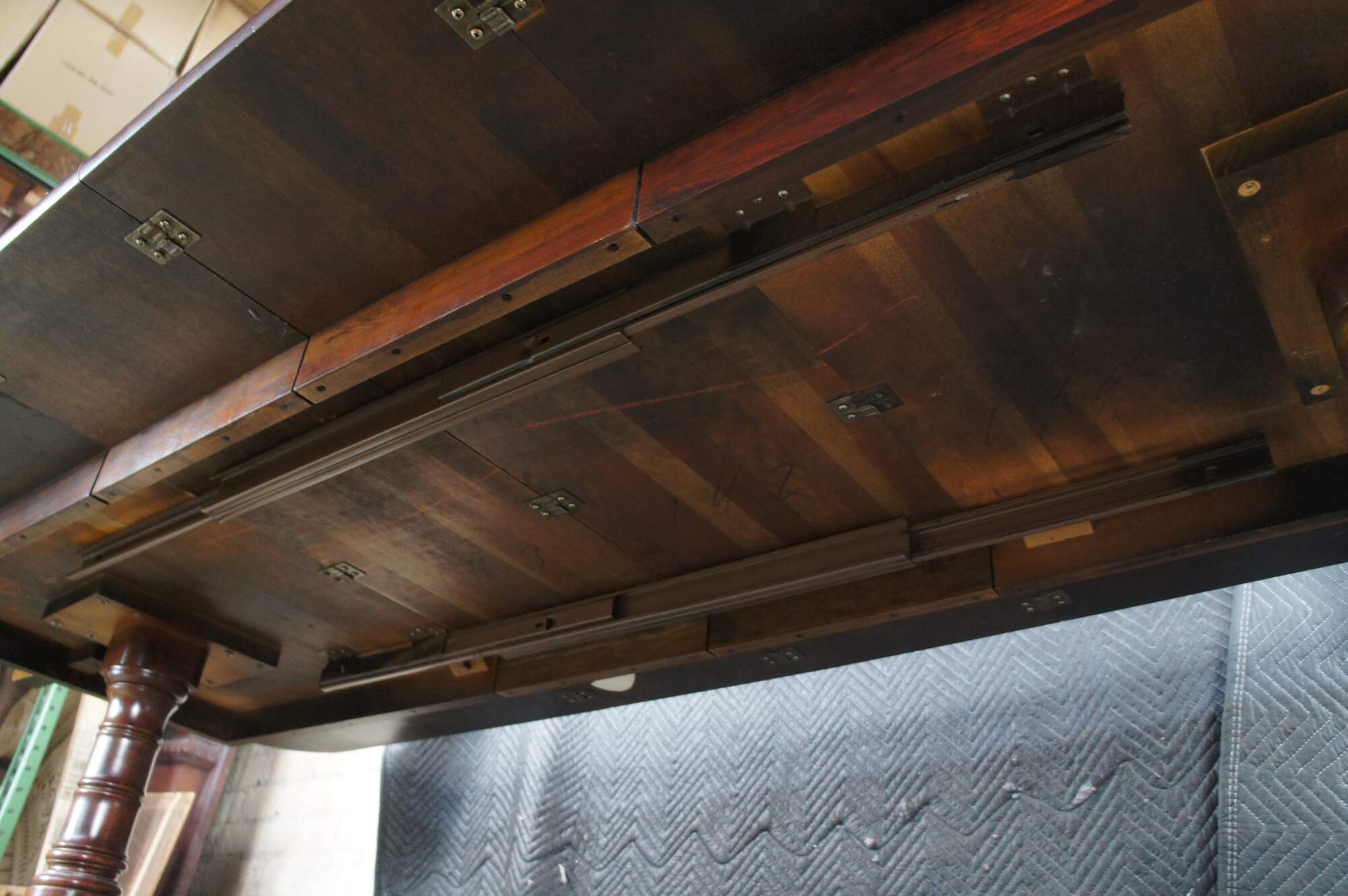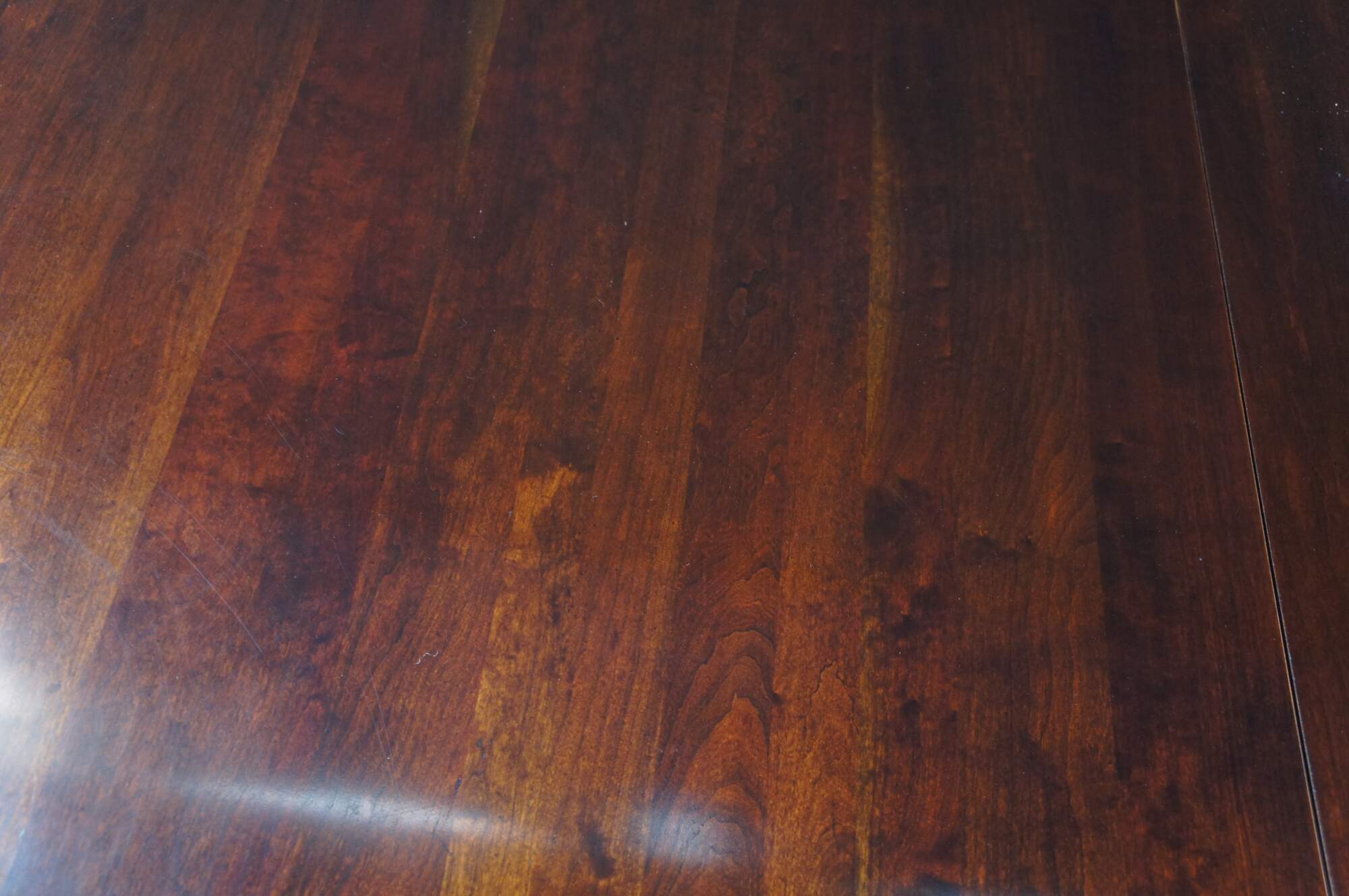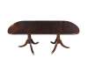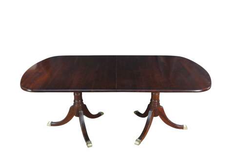 A stately solid cherry dining table by Williams Sonoma Home. Features a English Regency styling with a cherry top over ribbed double pedestals with downswept saber legs and brass capped feet. Includes three leaves for extension.