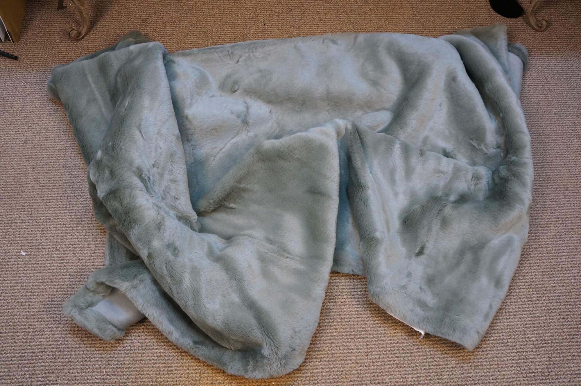 6 Available - Luxurious double sided faux fur and suede throw blanket, gray-green / light sage in color.