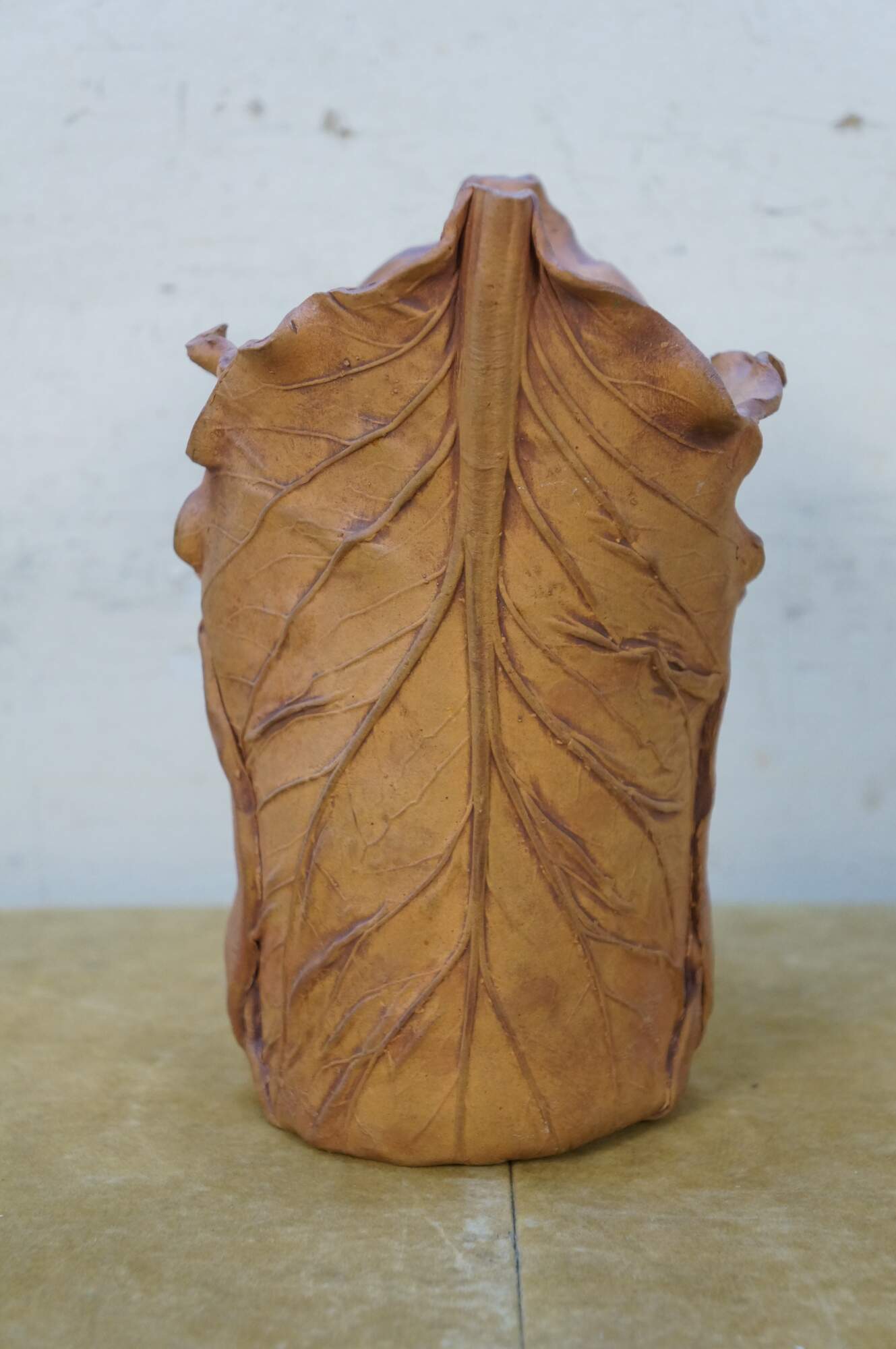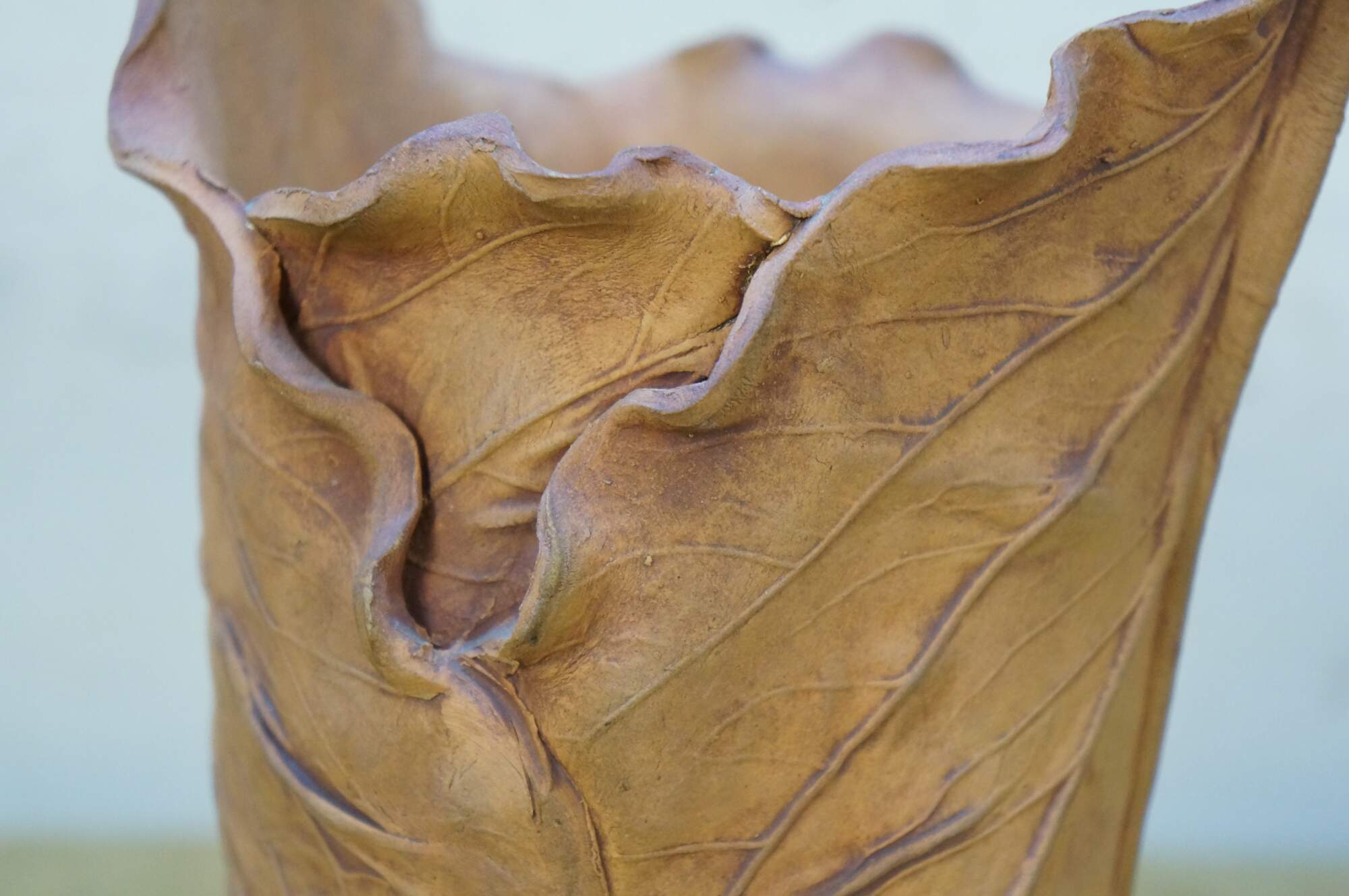 Vintage late 20th century brown unglazed ceramic vase - cylindrical form fashioned out of realistic looking leaves. Interior glazed for use as vase. Hand made by David Heger, NY, NY.