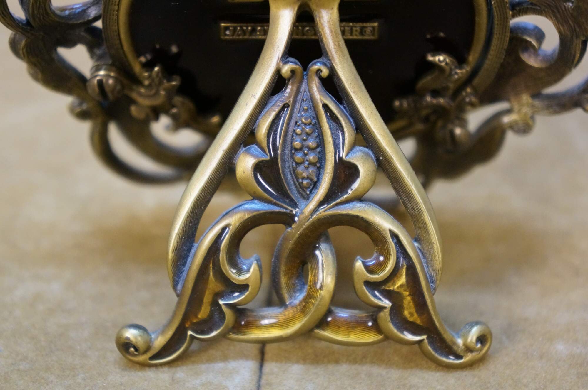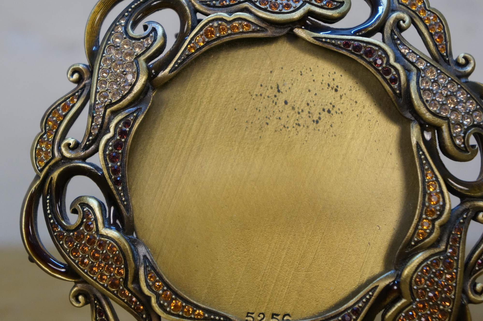 Late 20th century Jay Strongwater Carmela brass and Swarovski crystal miniature round picture frame. Swirling paisley design studded with garnet, copper, and gold crystals Enameled easel style back. Marked 5256.