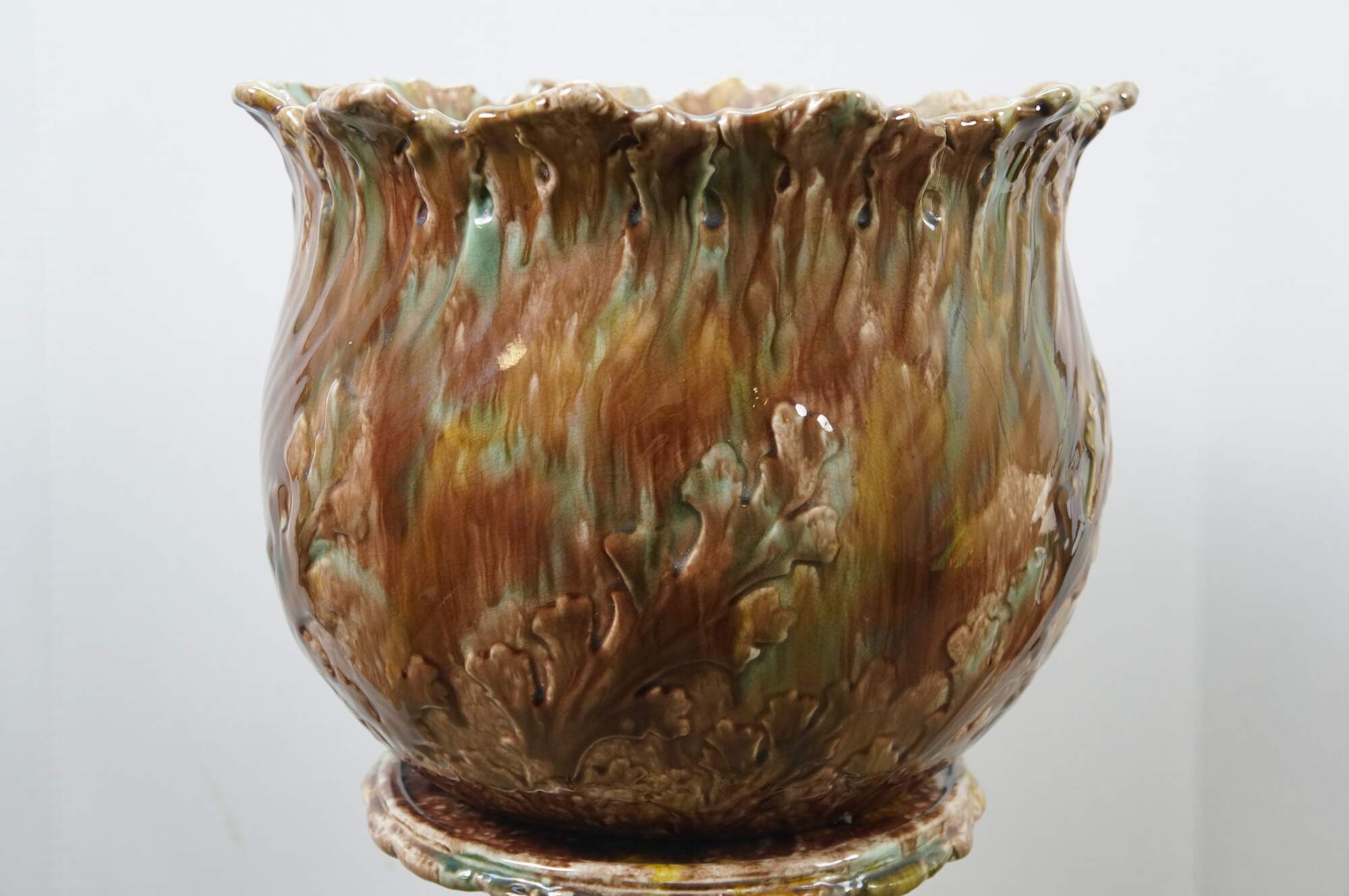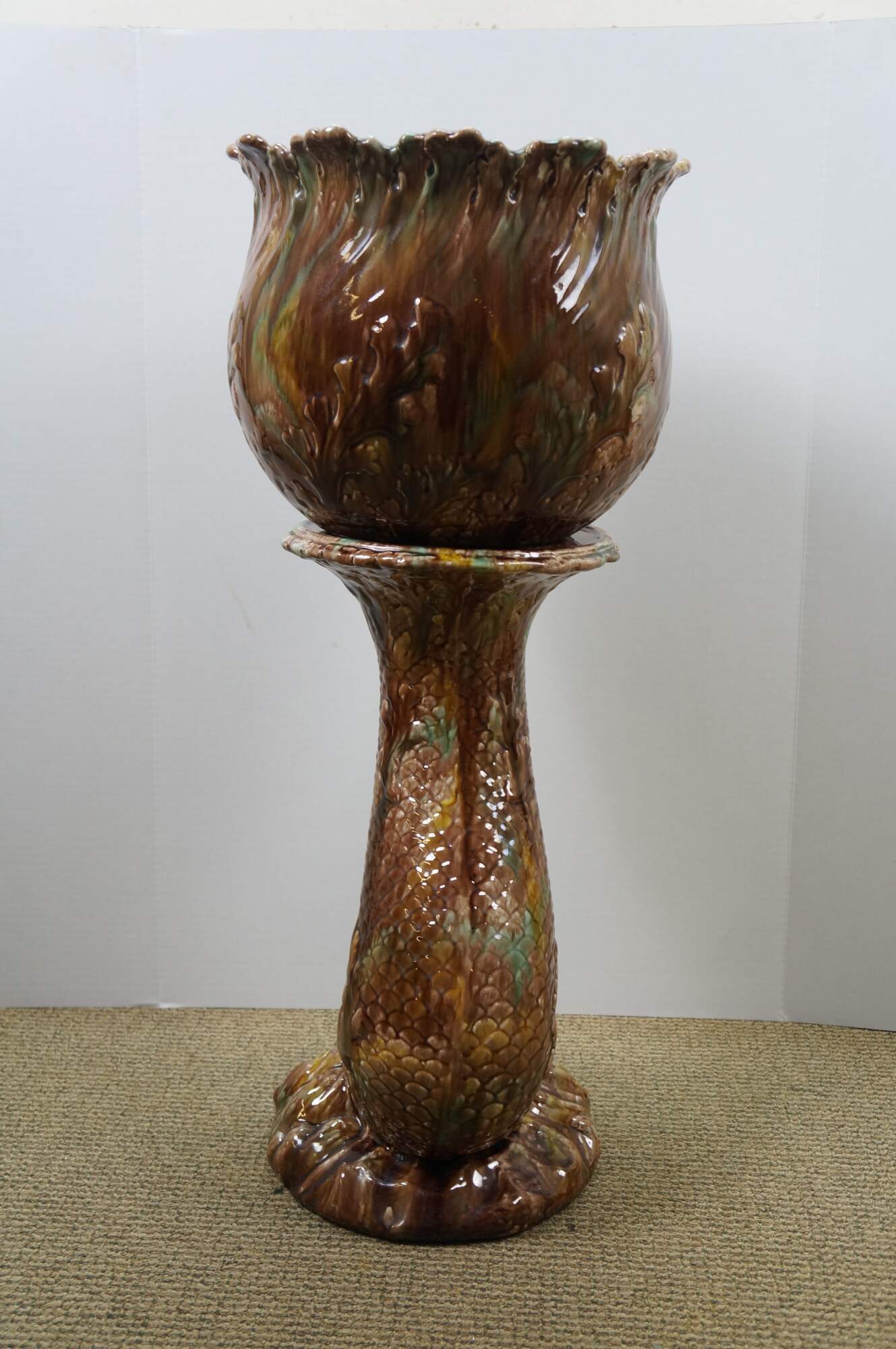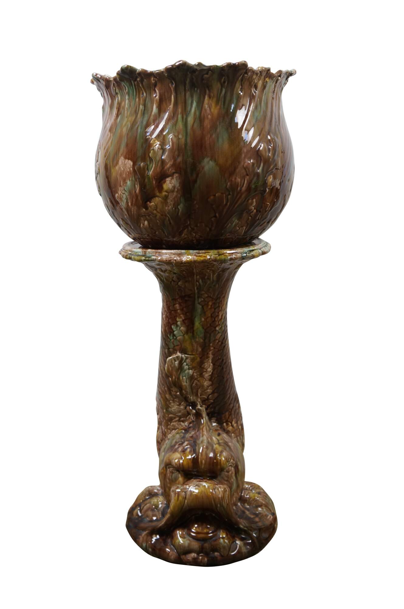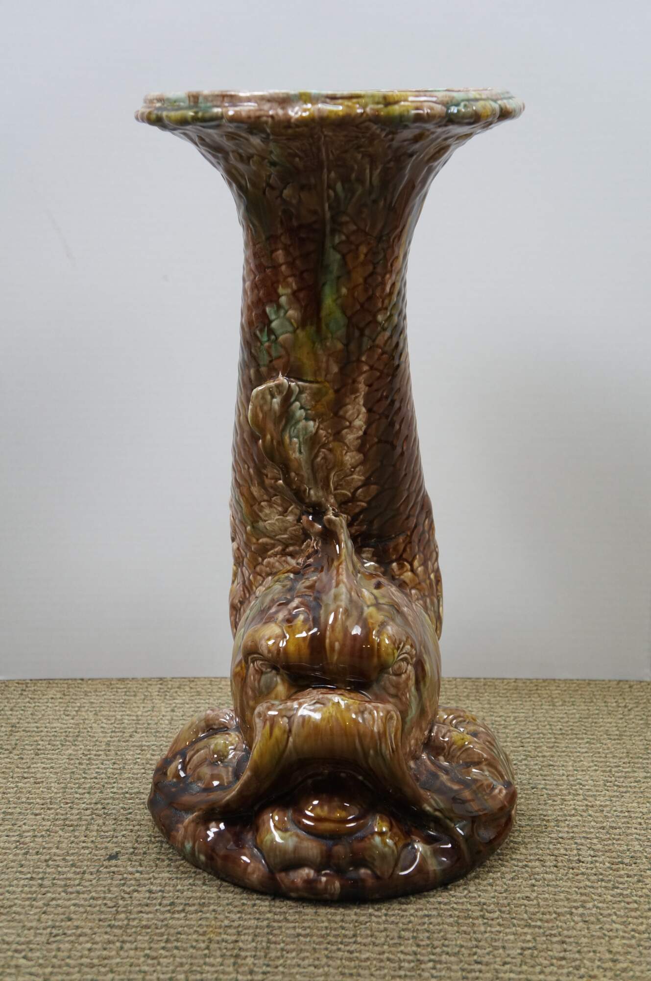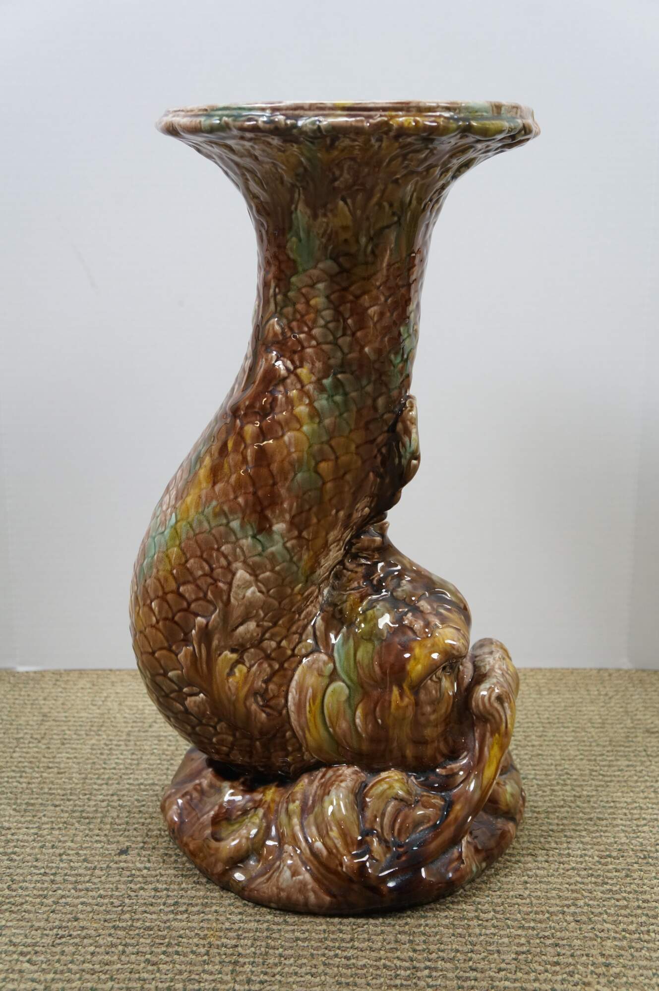 Late 19th to early 20th century majolica delphin garden planter by Wannopee Pottery Company. Pedestal in the shape of a classical delphin / dolphin, topped with a round leaf pattern planter / urn with scalloped upper edge. Brown and green mottled glaze. Incised mark on base of bowl.