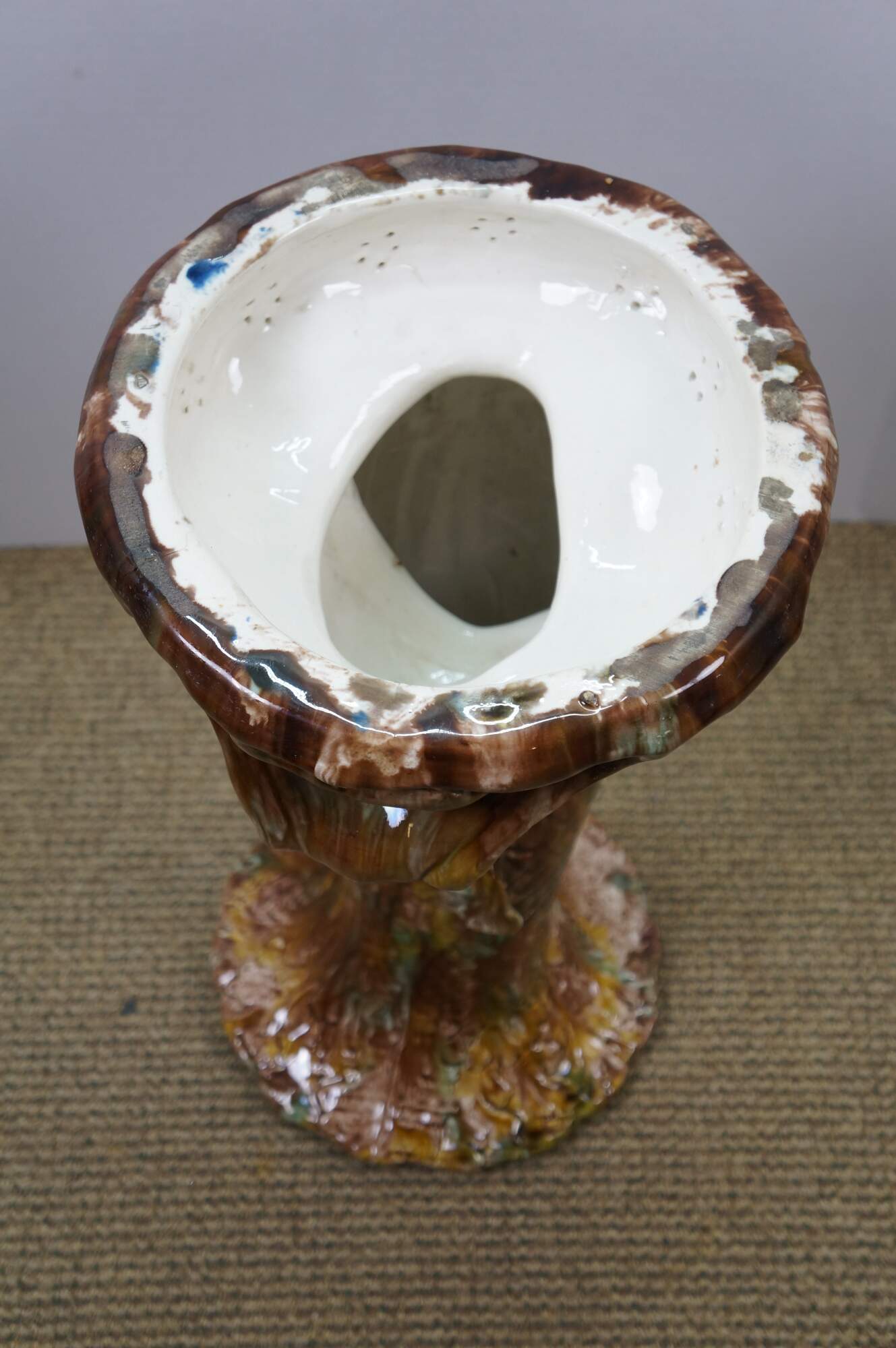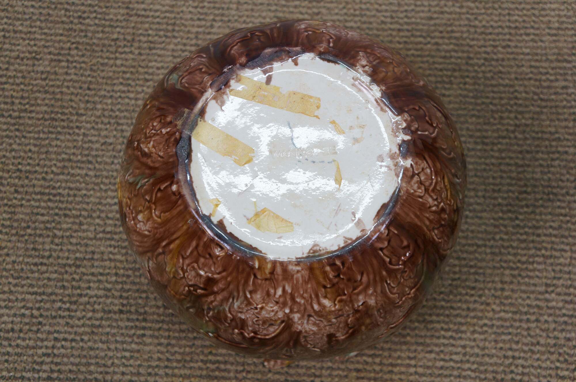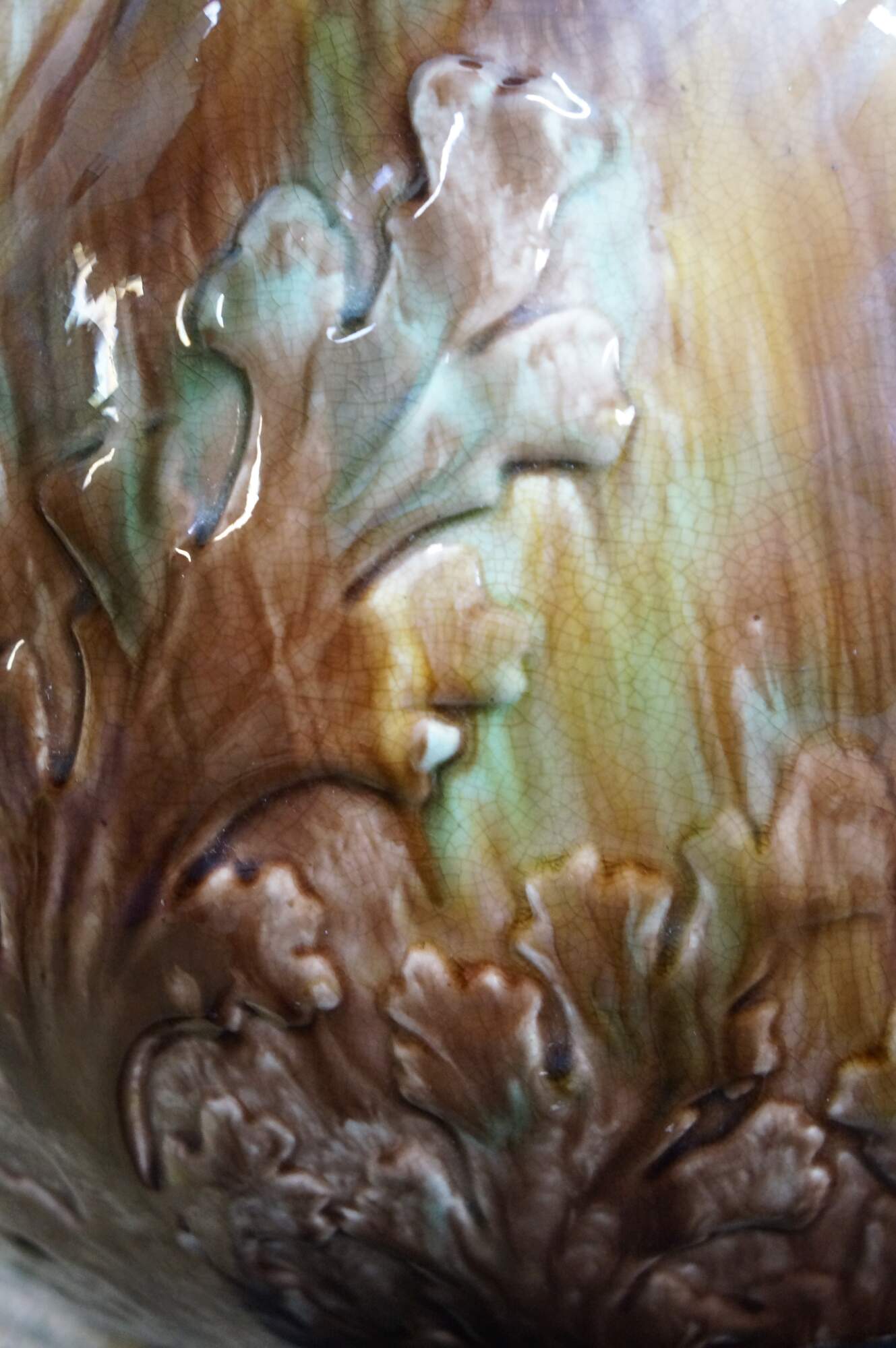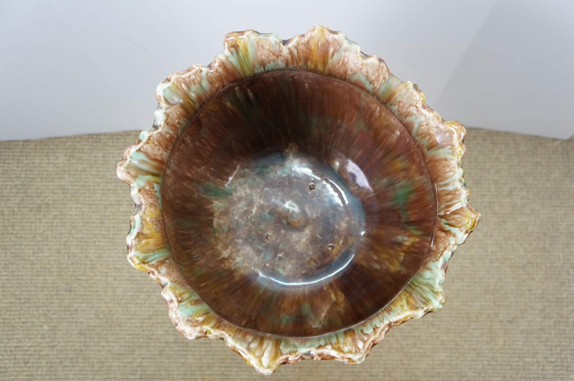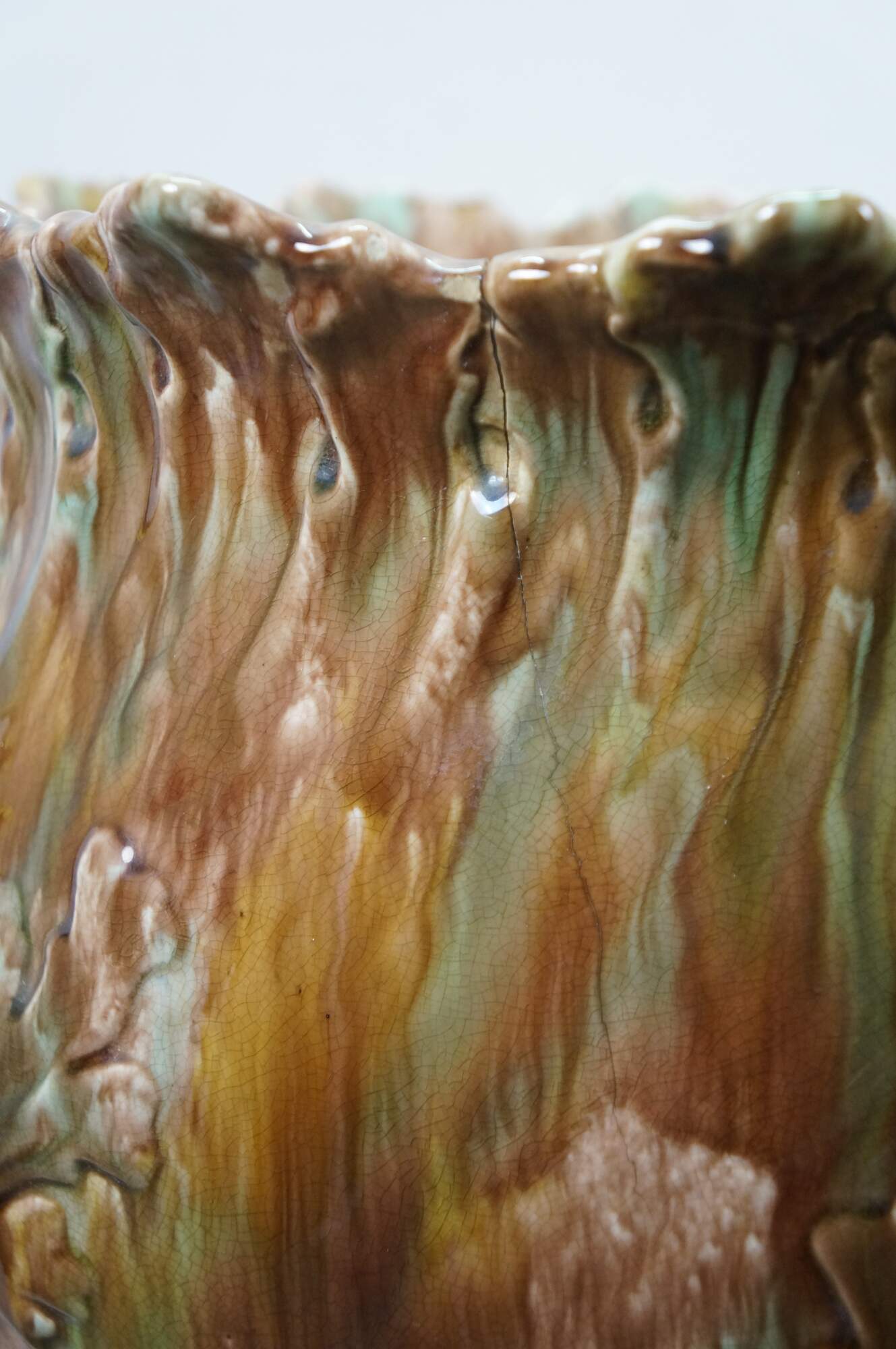 Late 19th to early 20th century majolica delphin garden planter by Wannopee Pottery Company. Pedestal in the shape of a classical delphin / dolphin, topped with a round leaf pattern planter / urn with scalloped upper edge. Brown and green mottled glaze. Incised mark on base of bowl.