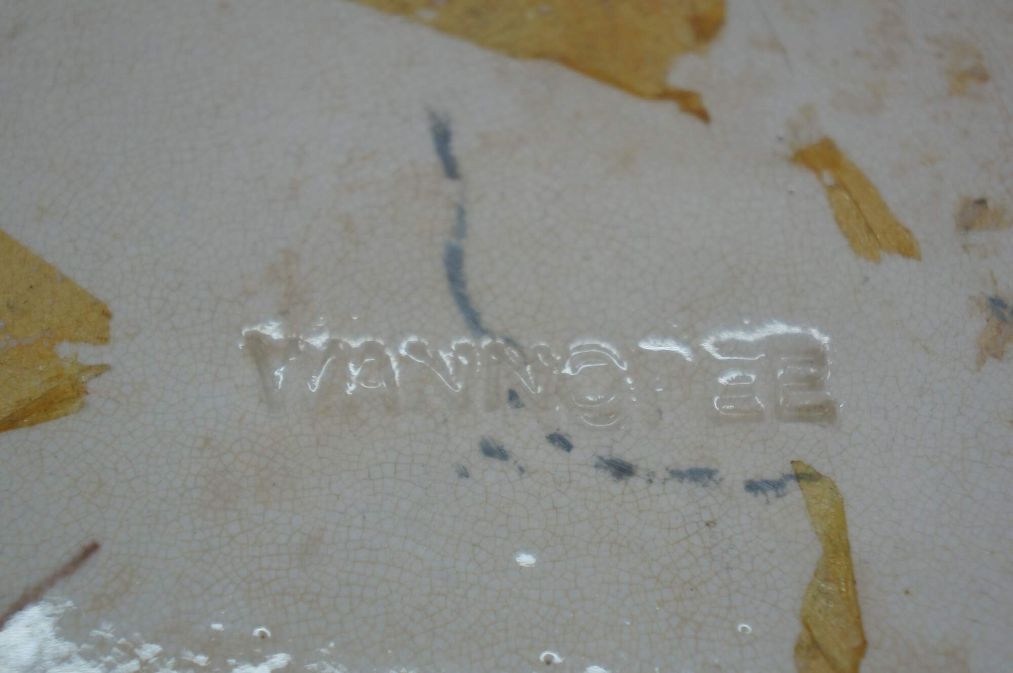 "The Wannopee Pottery Company was established as The New Milford Pottery Co. in New Milford, Conn., in 1887. The factory produced utilitarian pieces in restrained colors. In 1892, with the reorganization of the company and called Wannopee, the factory brought forth a French faience pattern, Lettuce Leaf, in majolica. Its number of different shapes brought to mind those of GSH, and it added items such as olive dishes, asparagus plates, chop plates, square, rectangular or ovoid plates, tobacco jars and large candlesticks. The firm was successful until 1904, when it failed. It soon was reestablished in Trenton using original molds from New Milford. Jacqueline Kennedy Onassis was a collector of the Green Lettuce Leaf Pattern, (which is still very sought after by collectors today)." (New Milford Historical Society / Majolica Society)