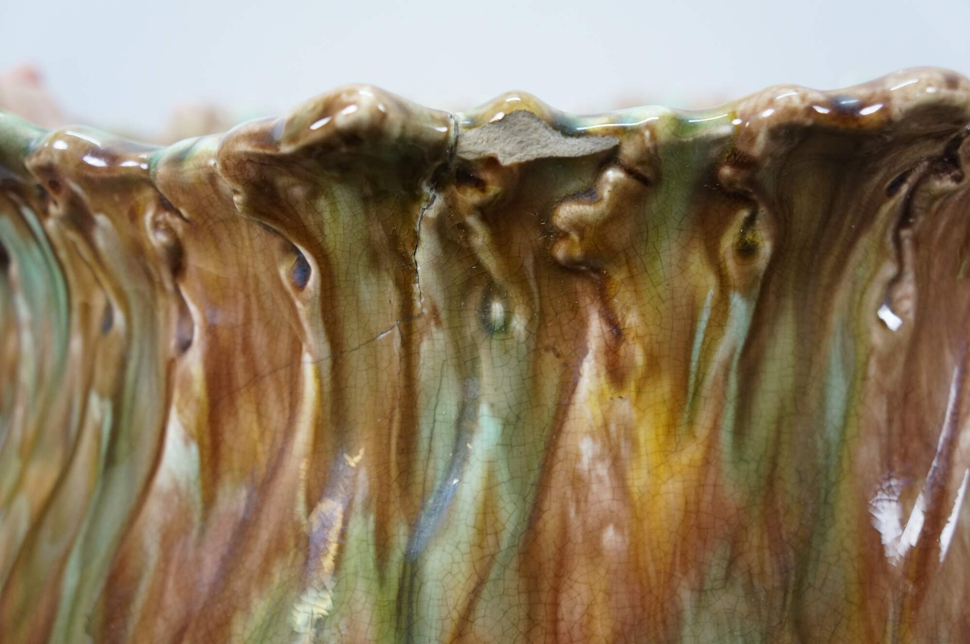 Structurally solid, distressing from age and use, crazing / fading, edge wear / chipping / cracks / hairlines to planter