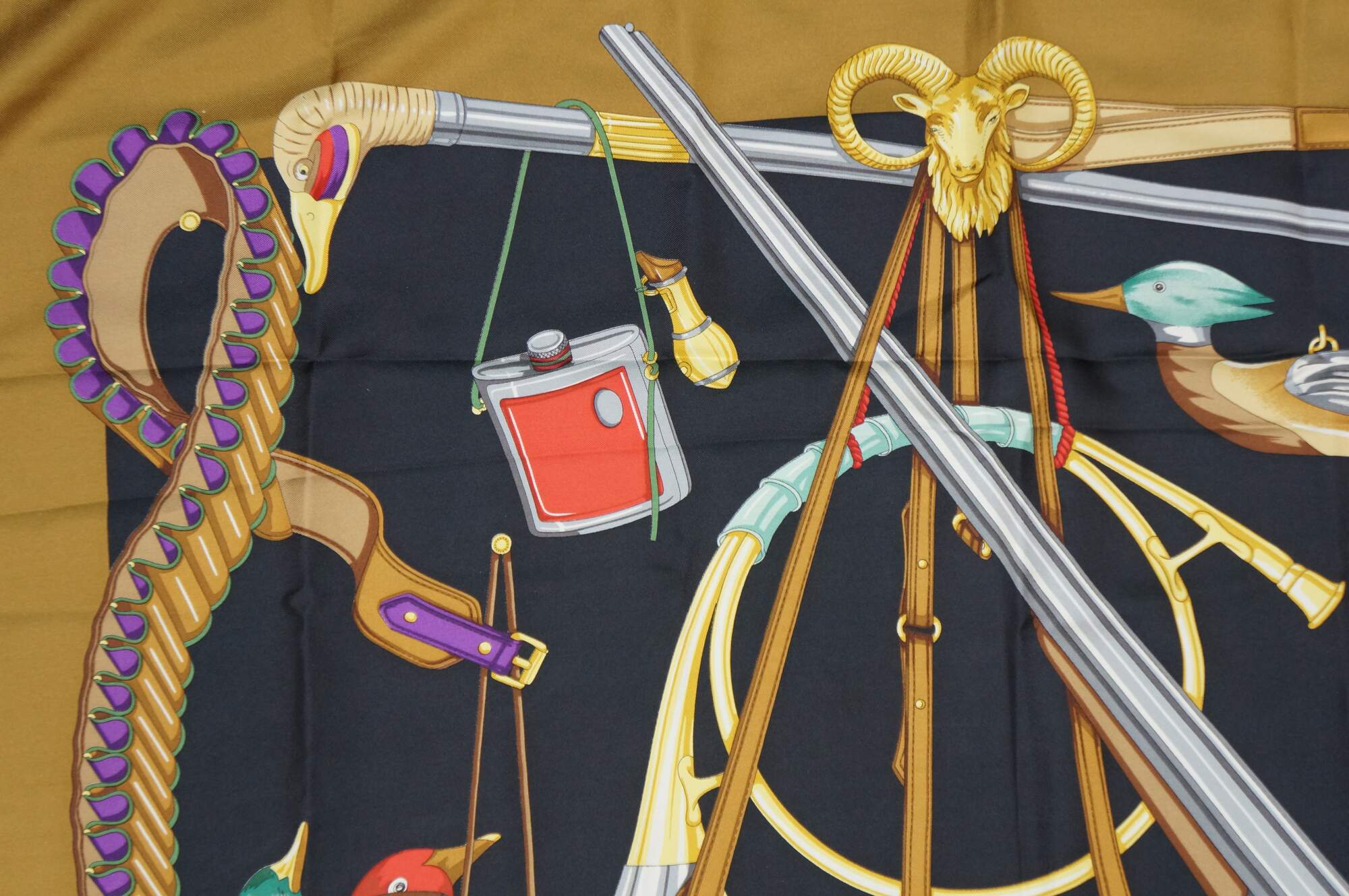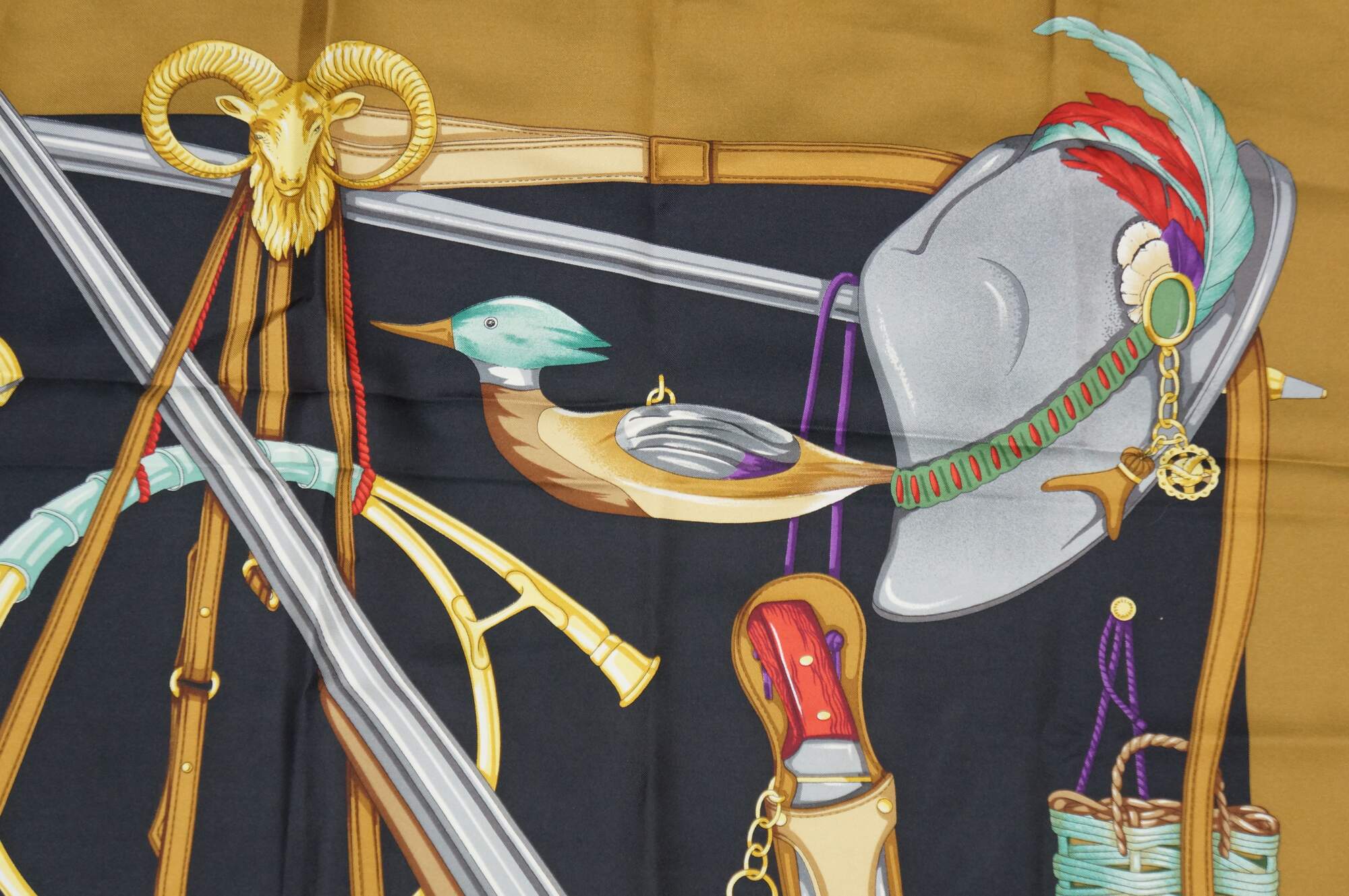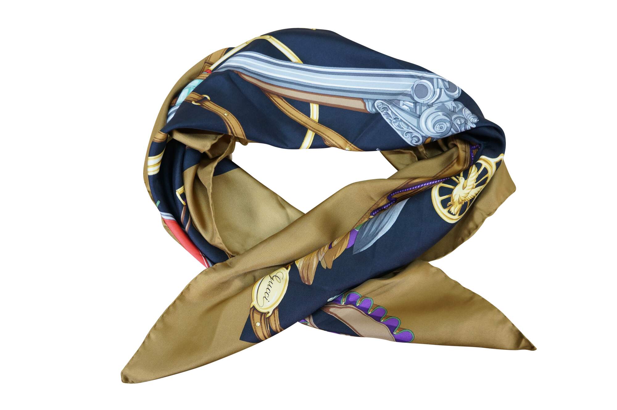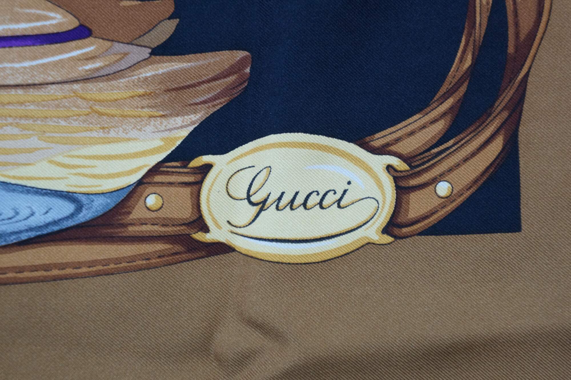 Vintage Gucci 100% silk square scarf featuring a golden border around an array of hunting objects - ducks, shotgun / bullets / holster, bugle horn, duck callers, flask, cane, bags etc. Made in Italy.
