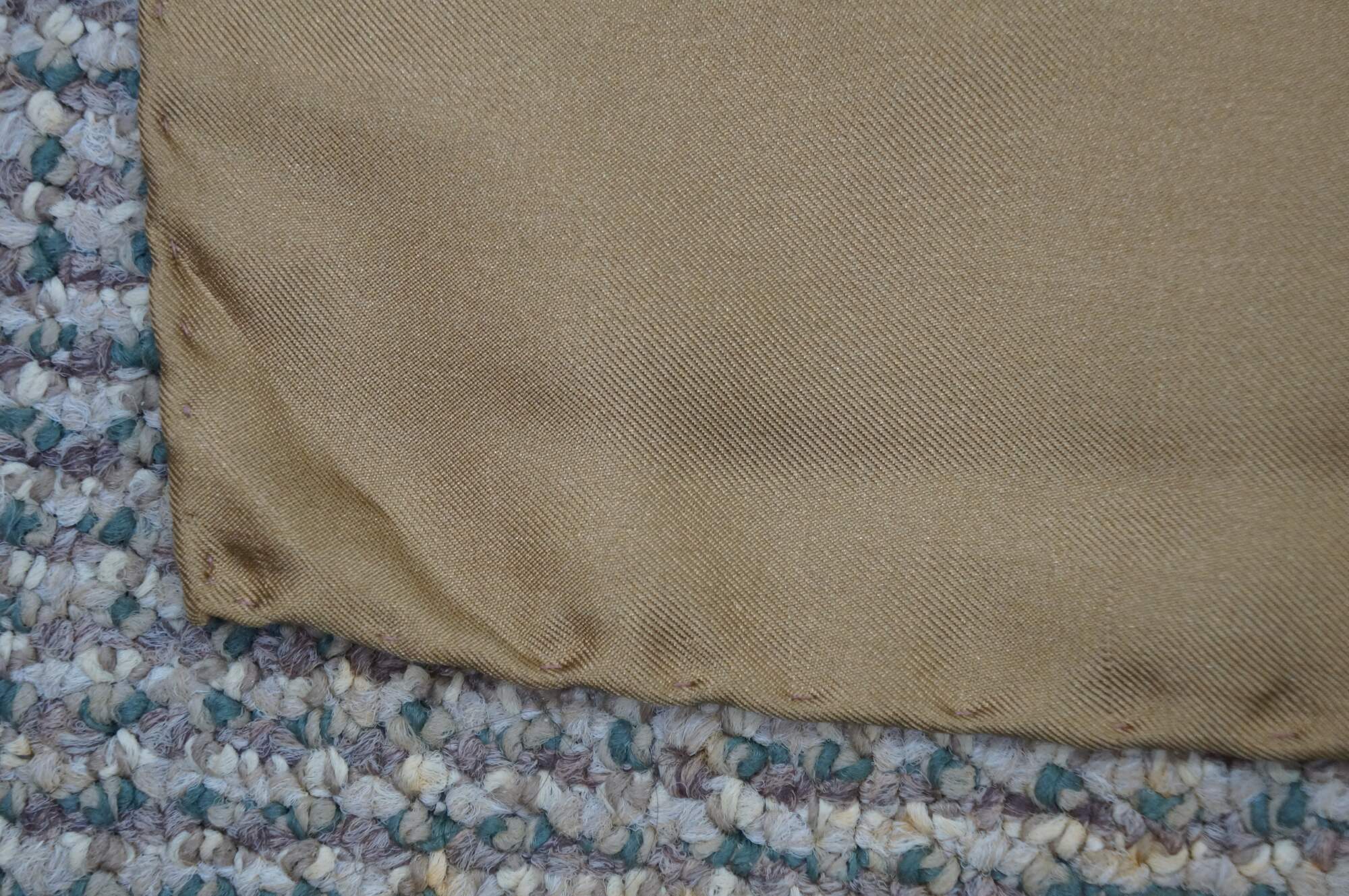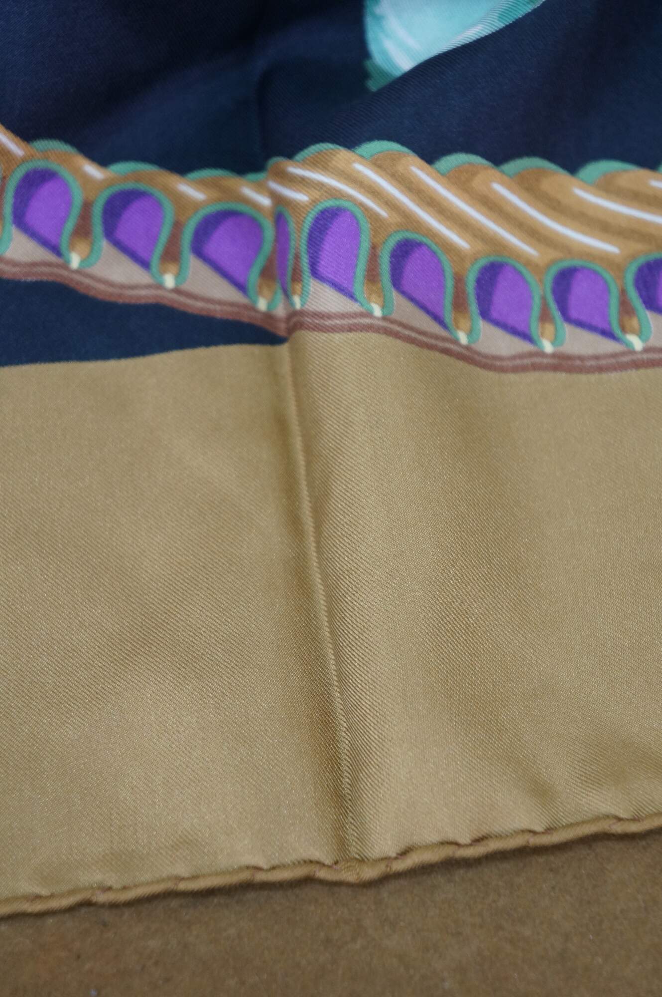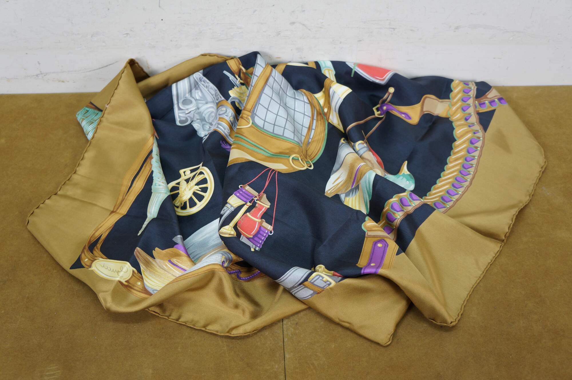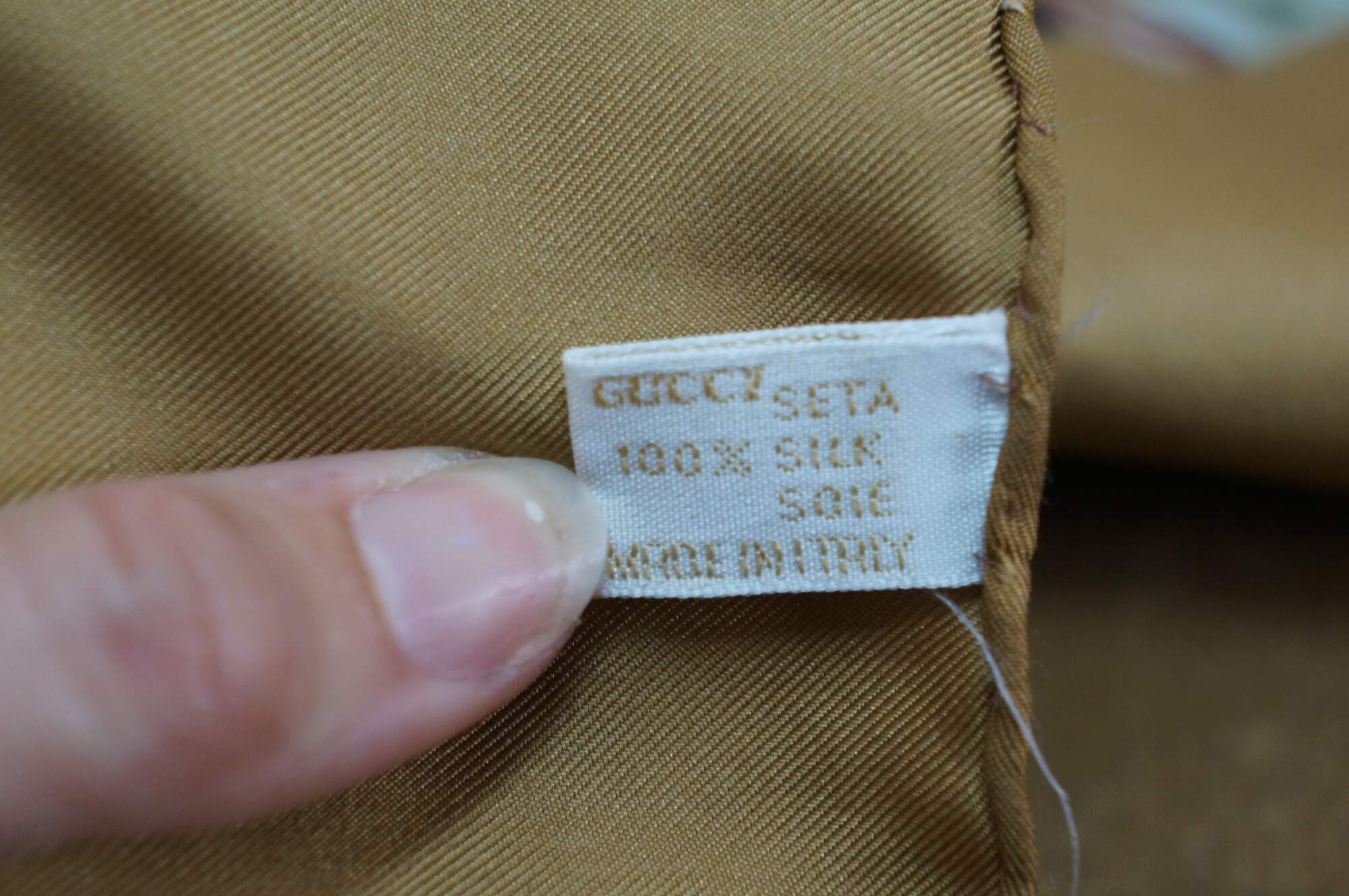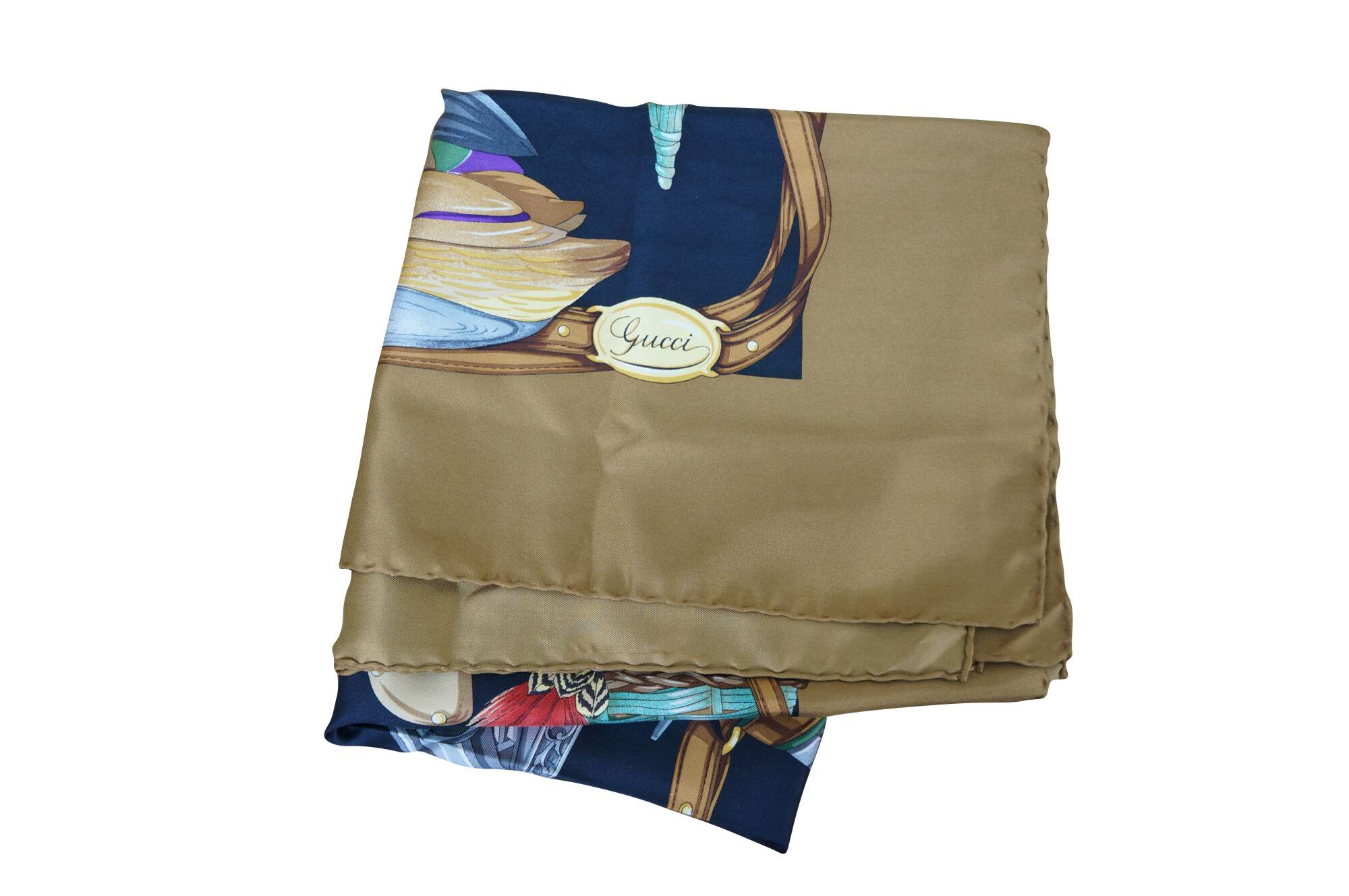 Vintage Gucci 100% silk square scarf featuring a golden border around an array of hunting objects - ducks, shotgun / bullets / holster, bugle horn, duck callers, flask, cane, bags etc. Made in Italy.