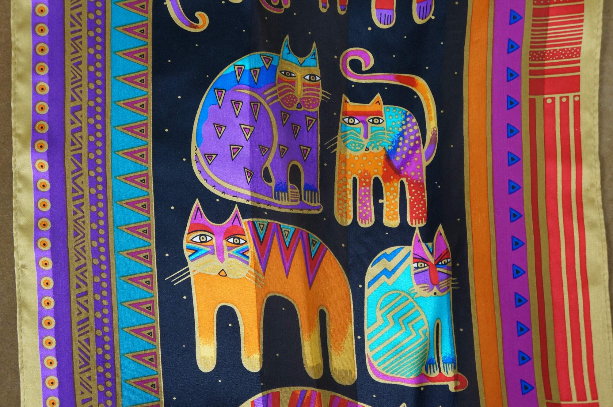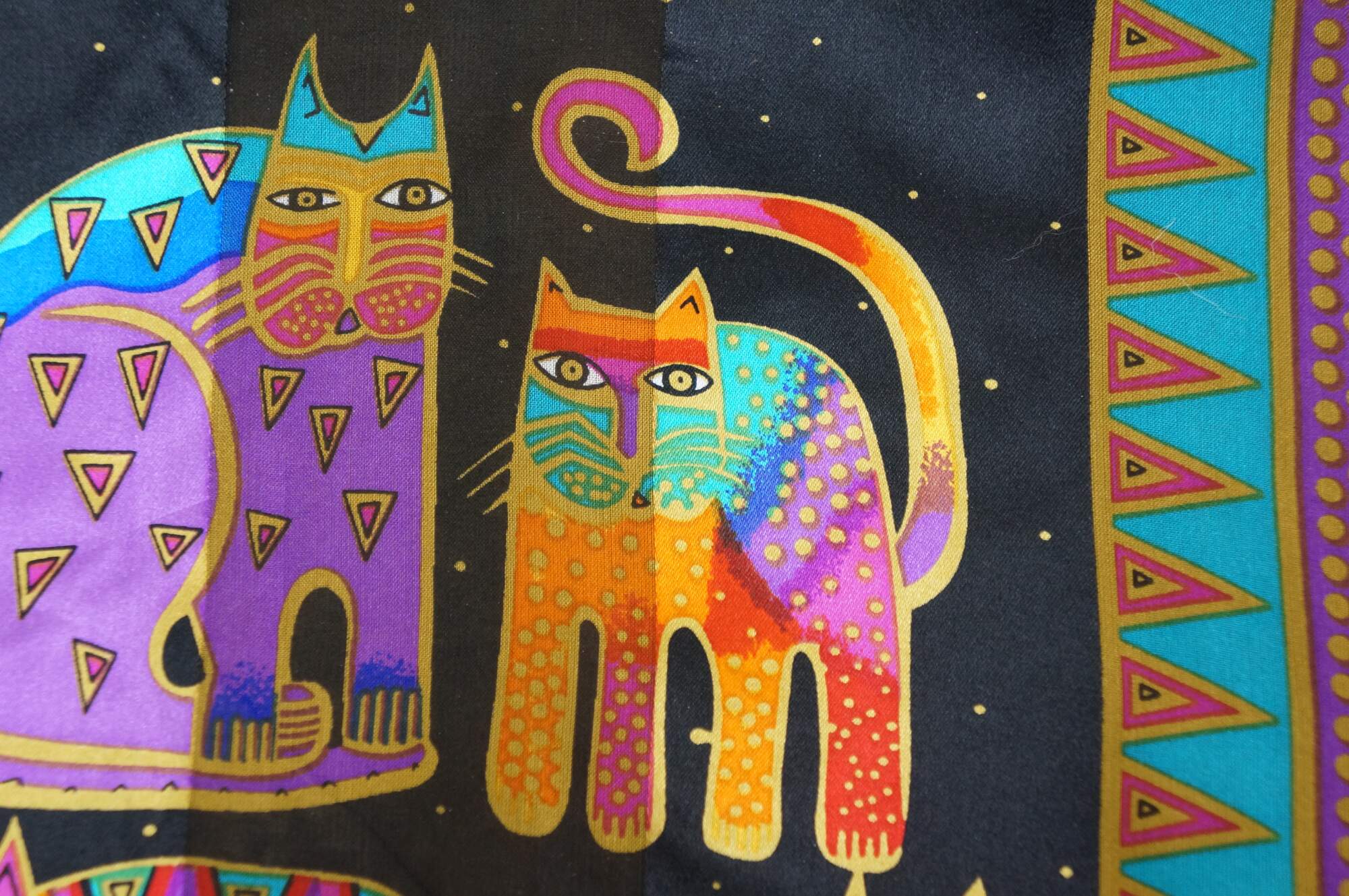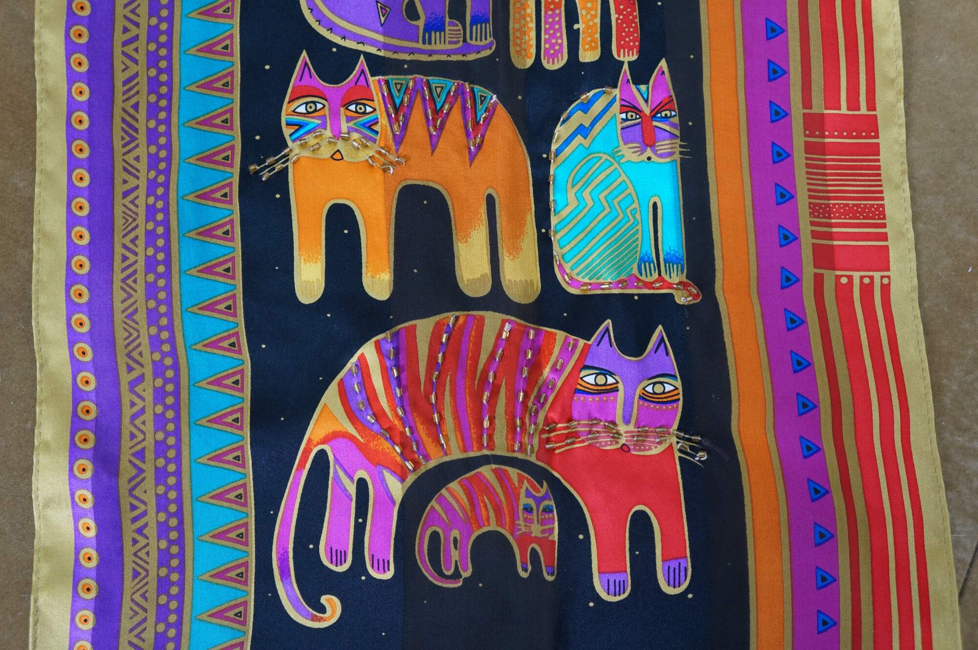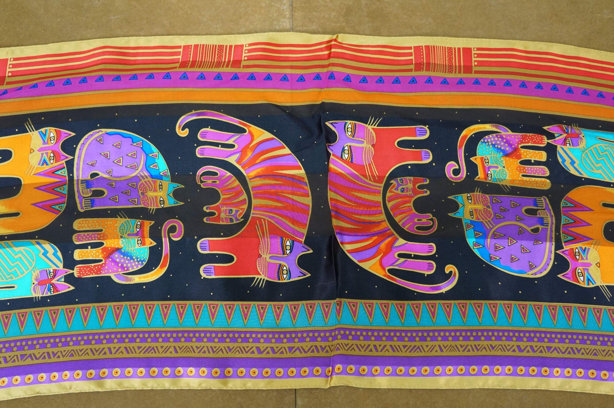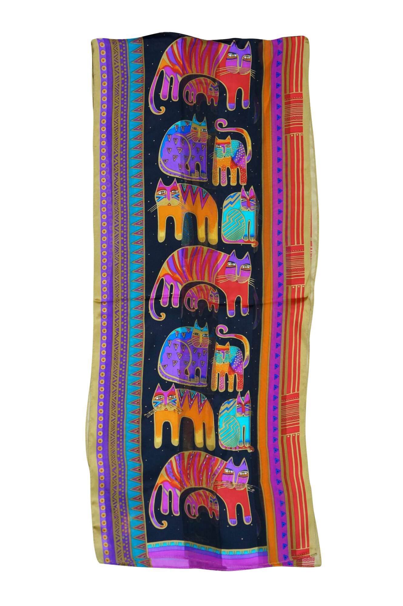 Late 20th century Laurel Burch Cat's Lovers 100% silk scarf. Long rectangular crepe silk scarf decorated with a repeating pattern of Burch's iconic brightly colored cats, framed in geometric designs and accented at the ends with beads. Sun and Sand Accessories Inc. Made in China. Tag still attached.