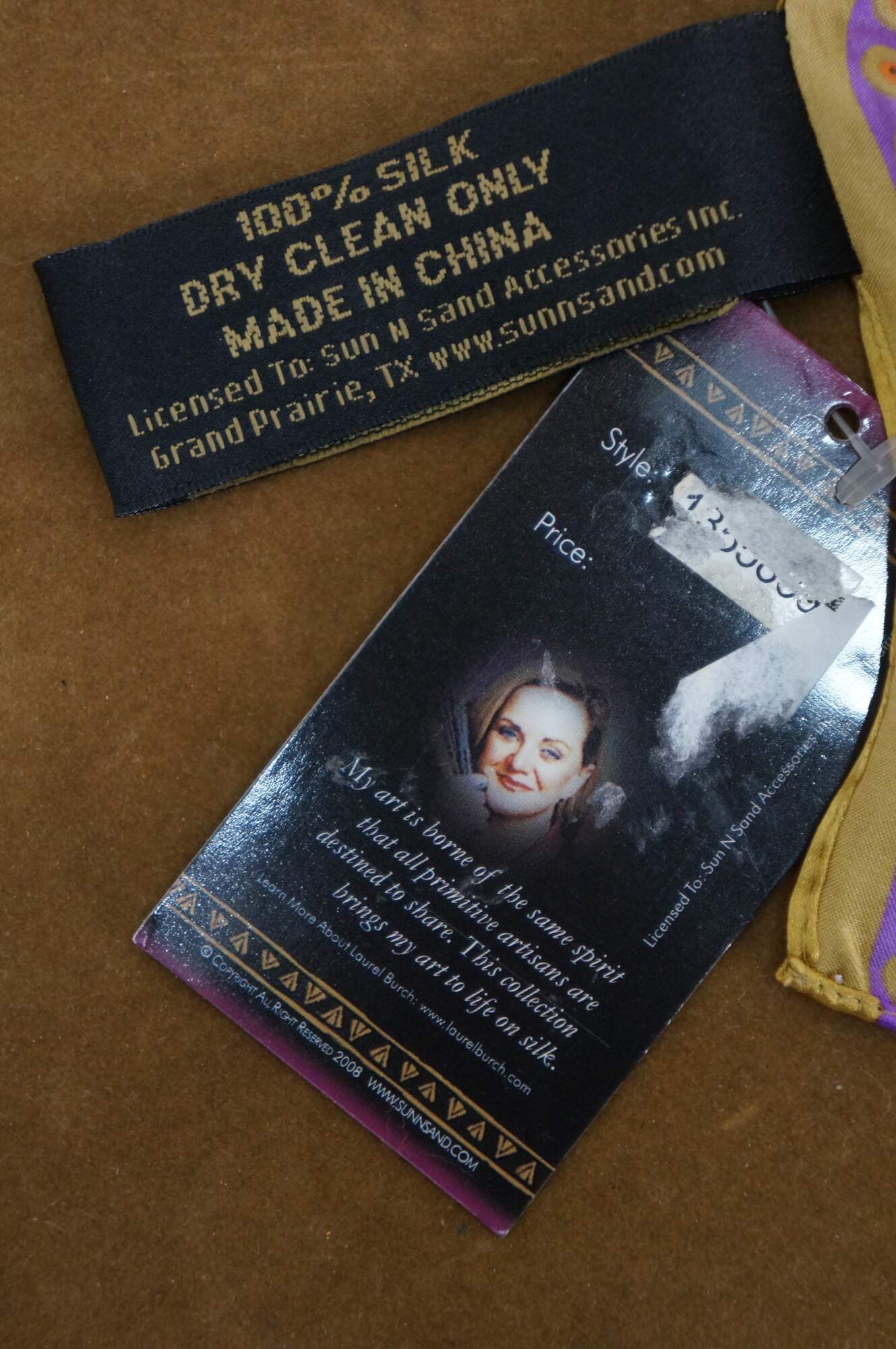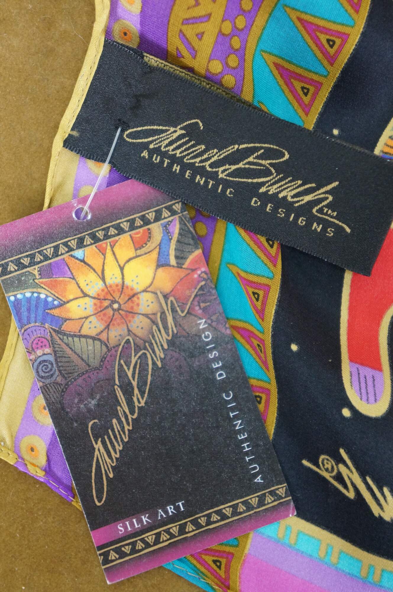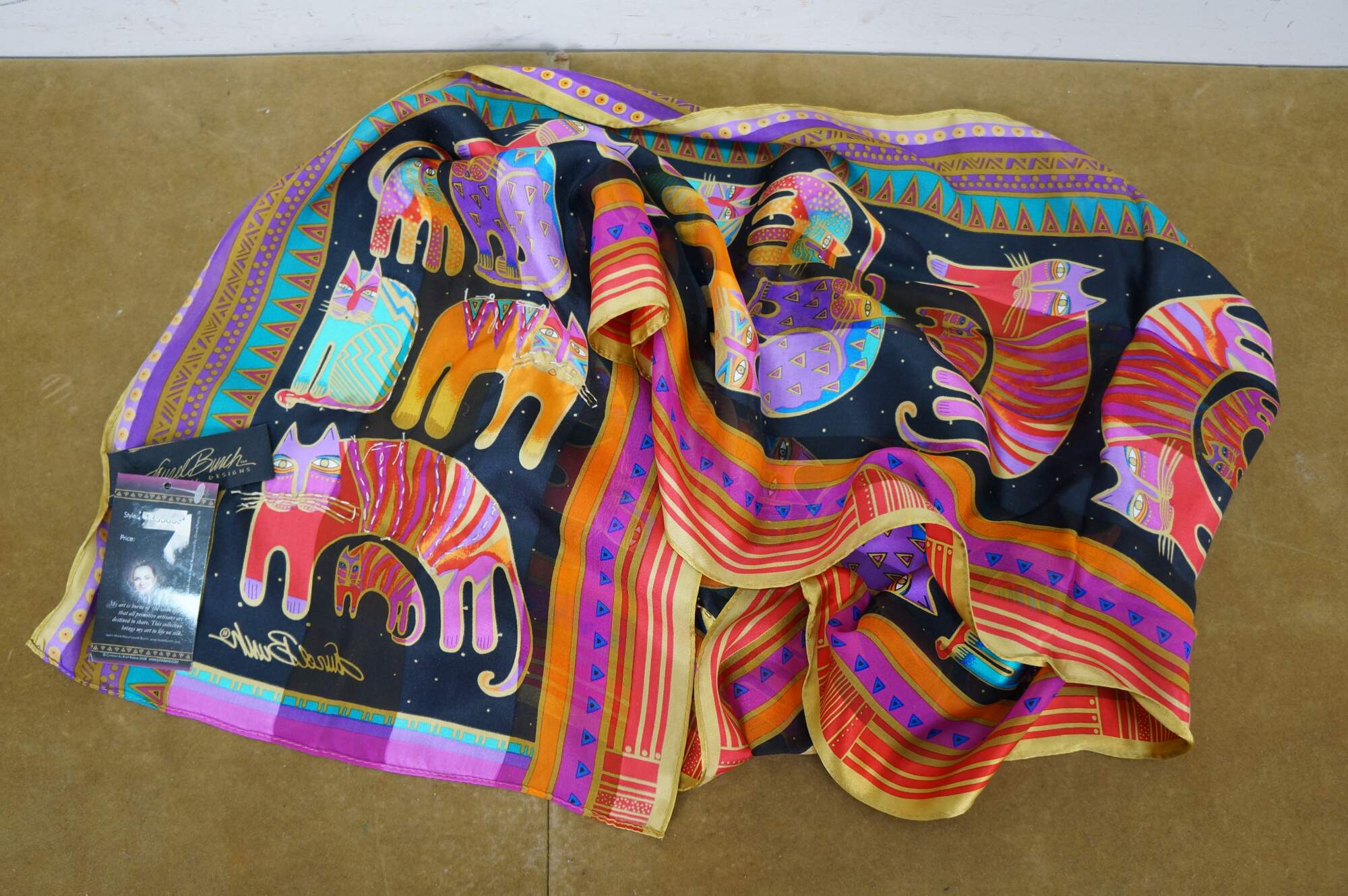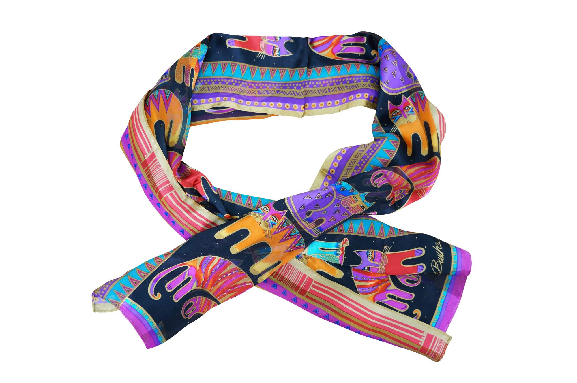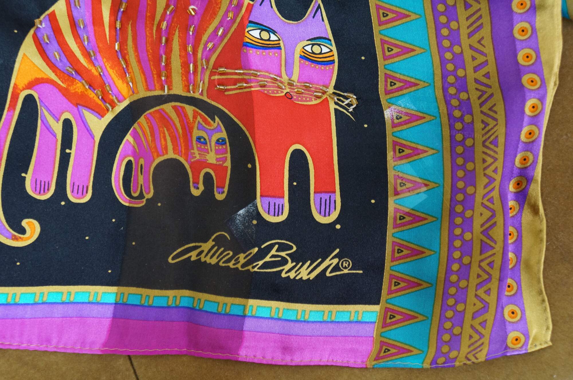 Late 20th century Laurel Burch Cat's Lovers 100% silk scarf. Long rectangular crepe silk scarf decorated with a repeating pattern of Burch's iconic brightly colored cats, framed in geometric designs and accented at the ends with beads. Sun and Sand Accessories Inc. Made in China. Tag still attached.
