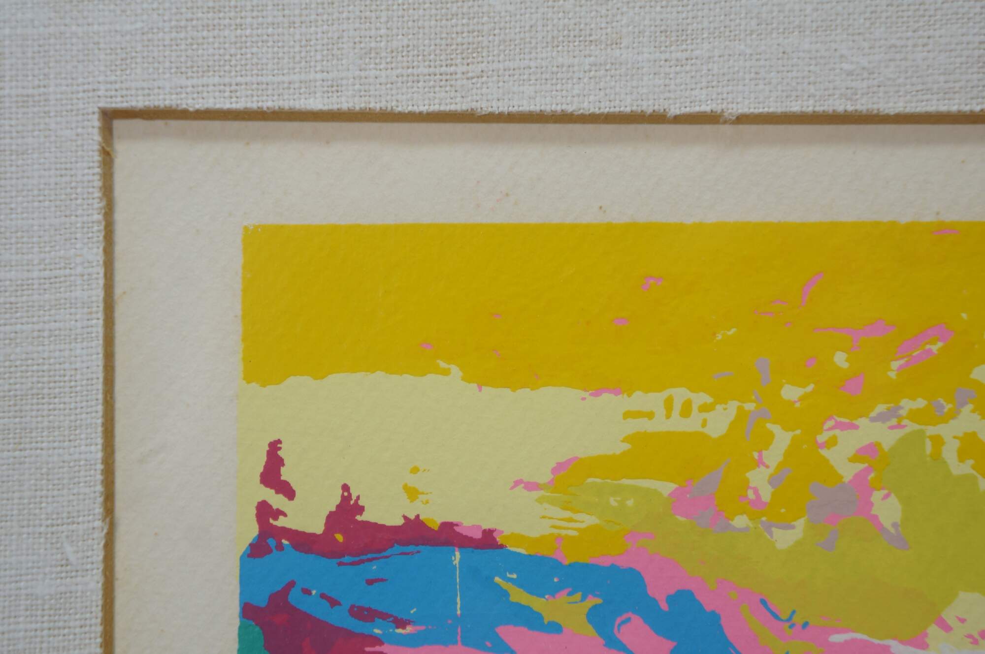 1973 serigraph print titled "Downhill" by LeRoy Neiman. Depicts a brightly colored Olympic skier coasting through red and yellow flags. Pencil signed and numbered 287/300, lower edge. Includes Certificate of Authenticity. Beveled giltwood frame; white linen mat.