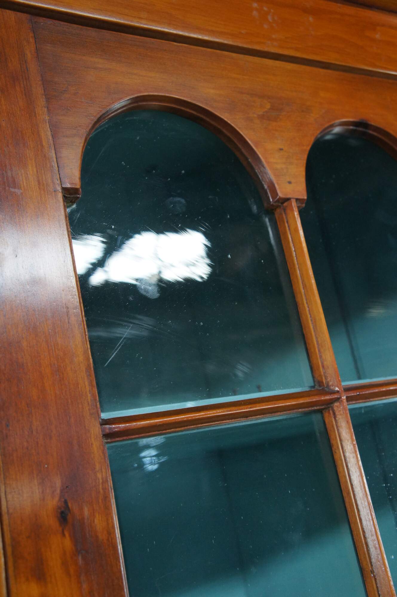 An antique early 19th century American primitive country farmhouse corner cabinet. Made of pine featuring a large 12 pane rolled glass arcaded door that opens to a blue painted interior with four shelves and plate grooves, supported by a lower cabinet with a central drawer.