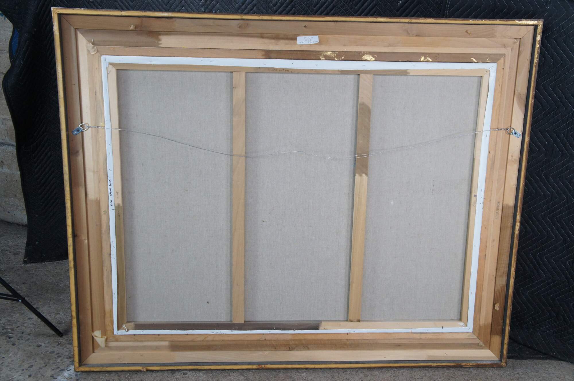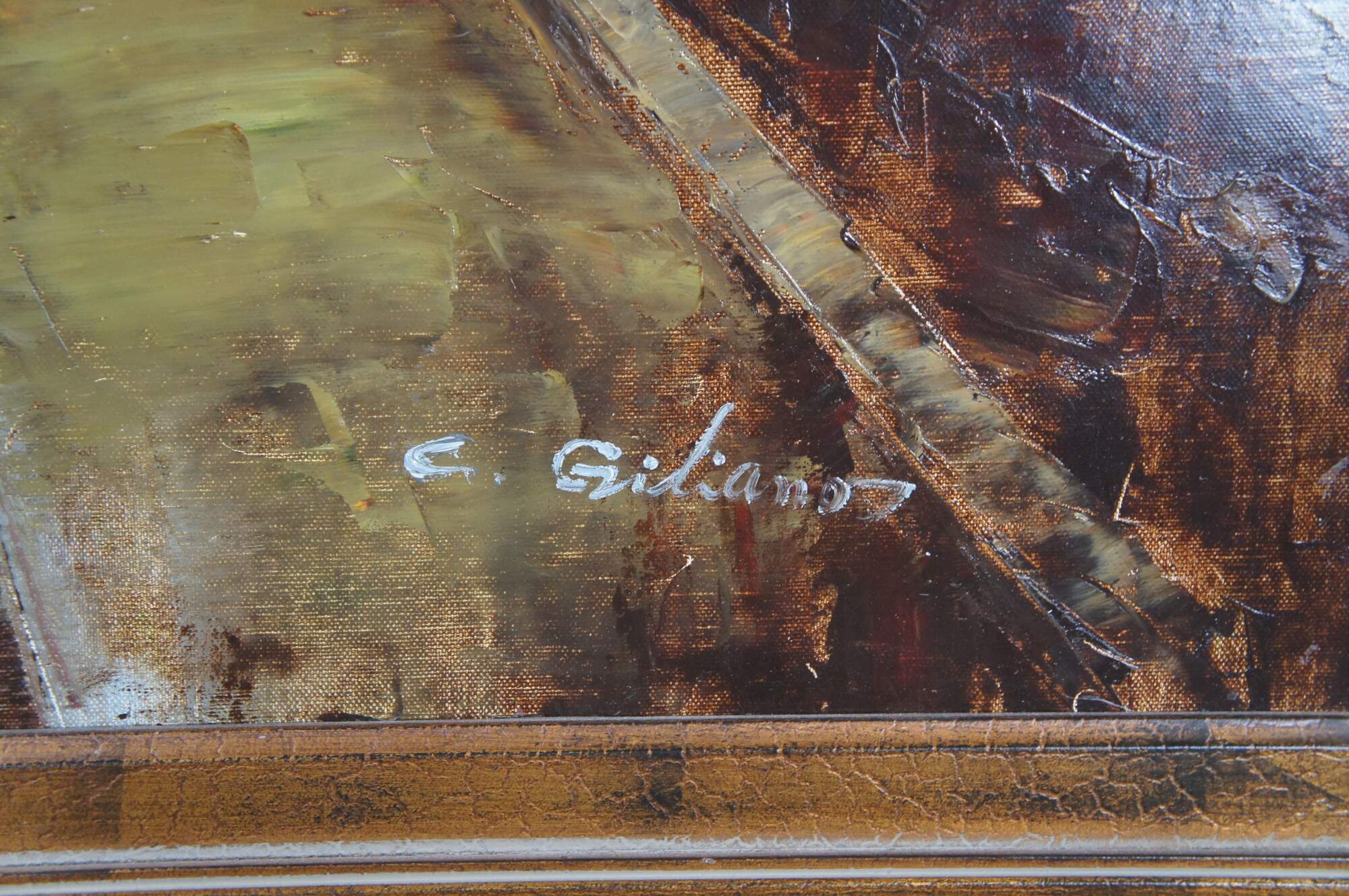 A beautiful Parisian cityscape painting by the Italian Contemporary painter C. Giliano. Features a view down the river near an arcaded bridge flanked by colorful buildnigs and steeples. The oil painting is on canvas and signed along the lower right. The canvas is framed in gold and black with a natural craquelure. A beautiful addition to any space.