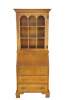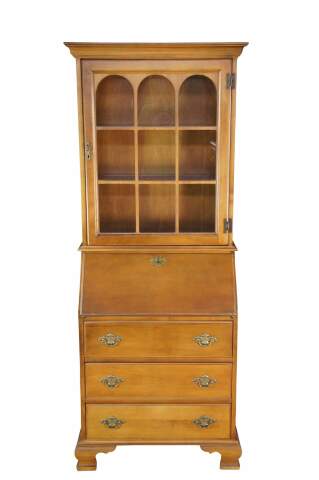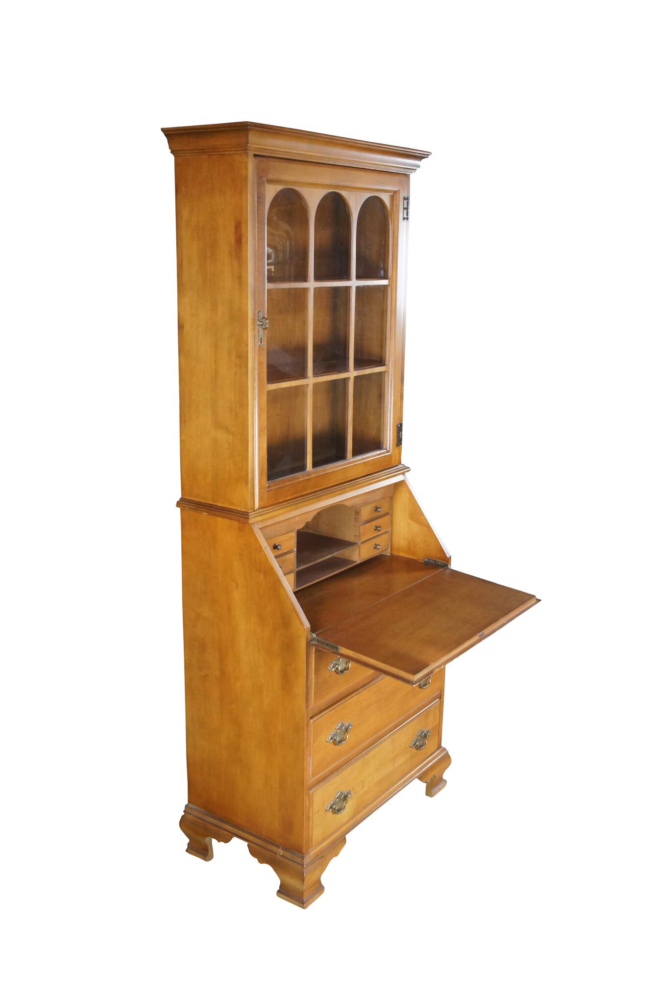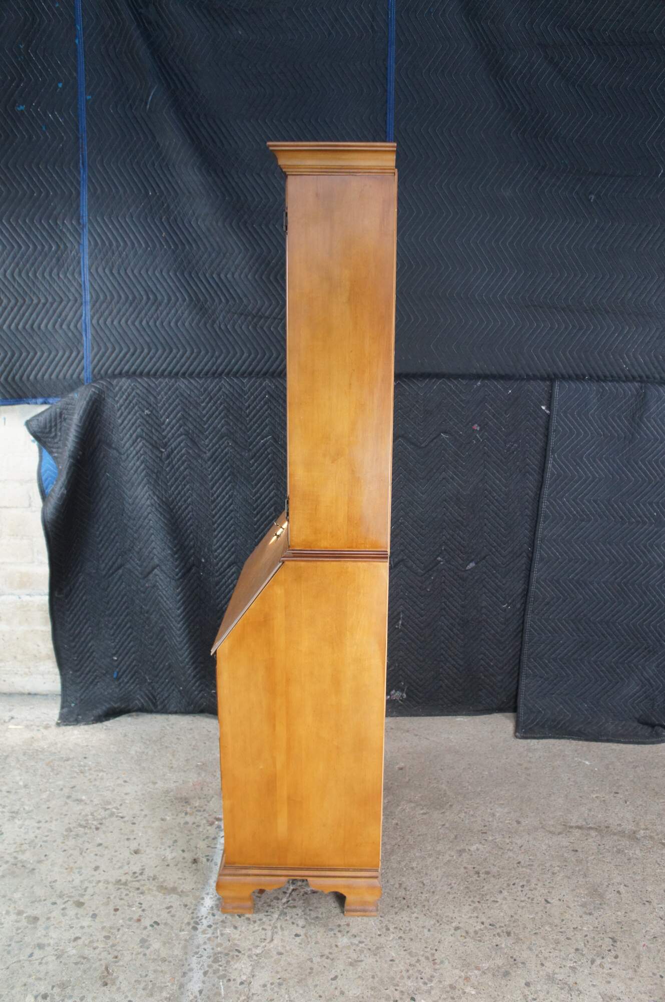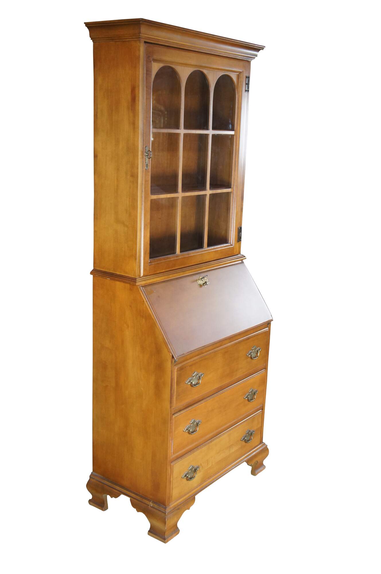 A Petite Secretary Desk & Bookcase by Jasper Cabinet Company of Indiana. Circa 1980s. Features a maple case crafted in colonial styling with an arcaded glass front door opening to three shelves over a drop front secretary with six drawers and two cubies. The lower portion of the case has three dovetailed drawers with colonial style brass bale hardware. The secretary is supported by bracket feet. Great for use in a library, office or study.
