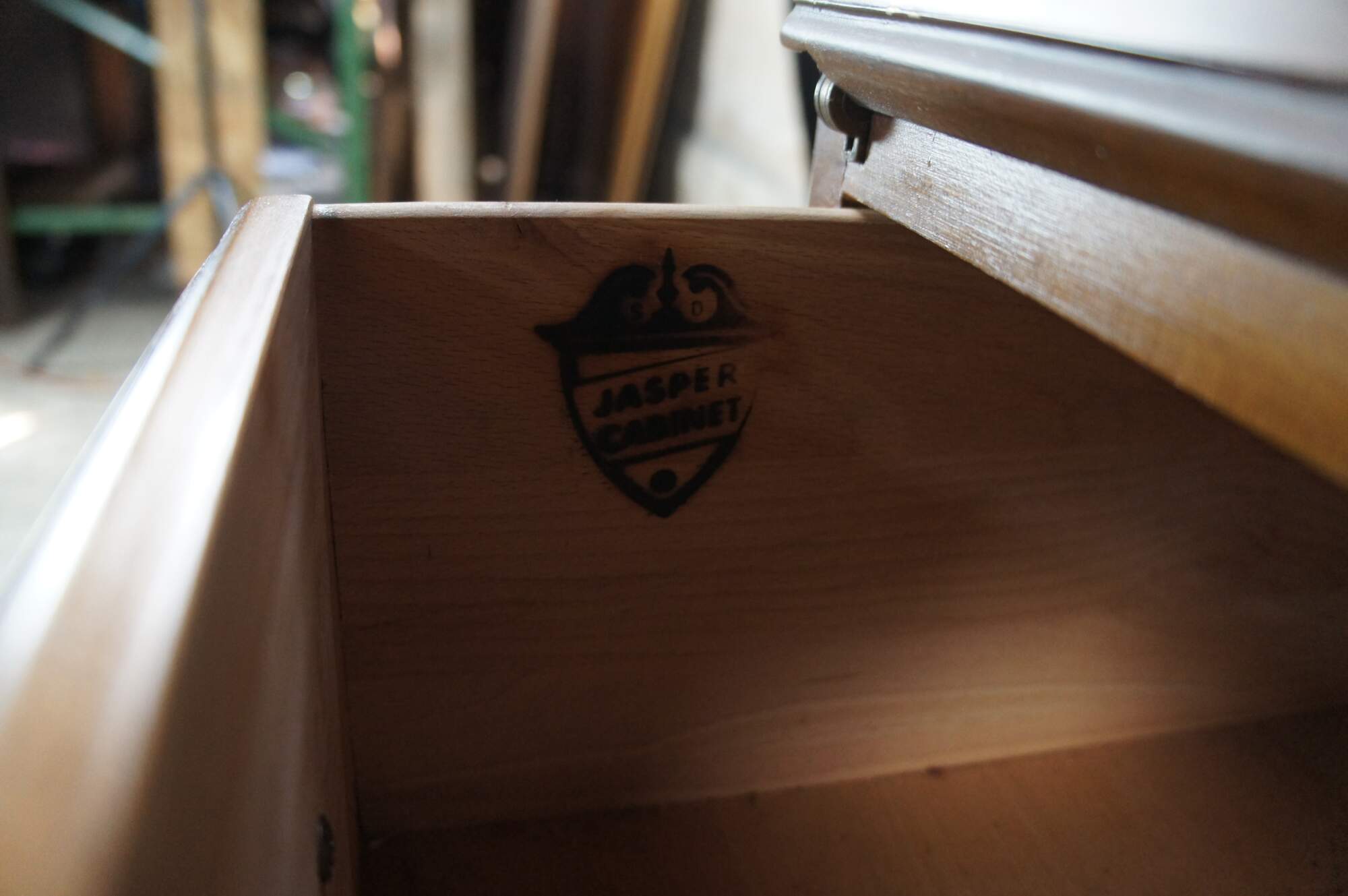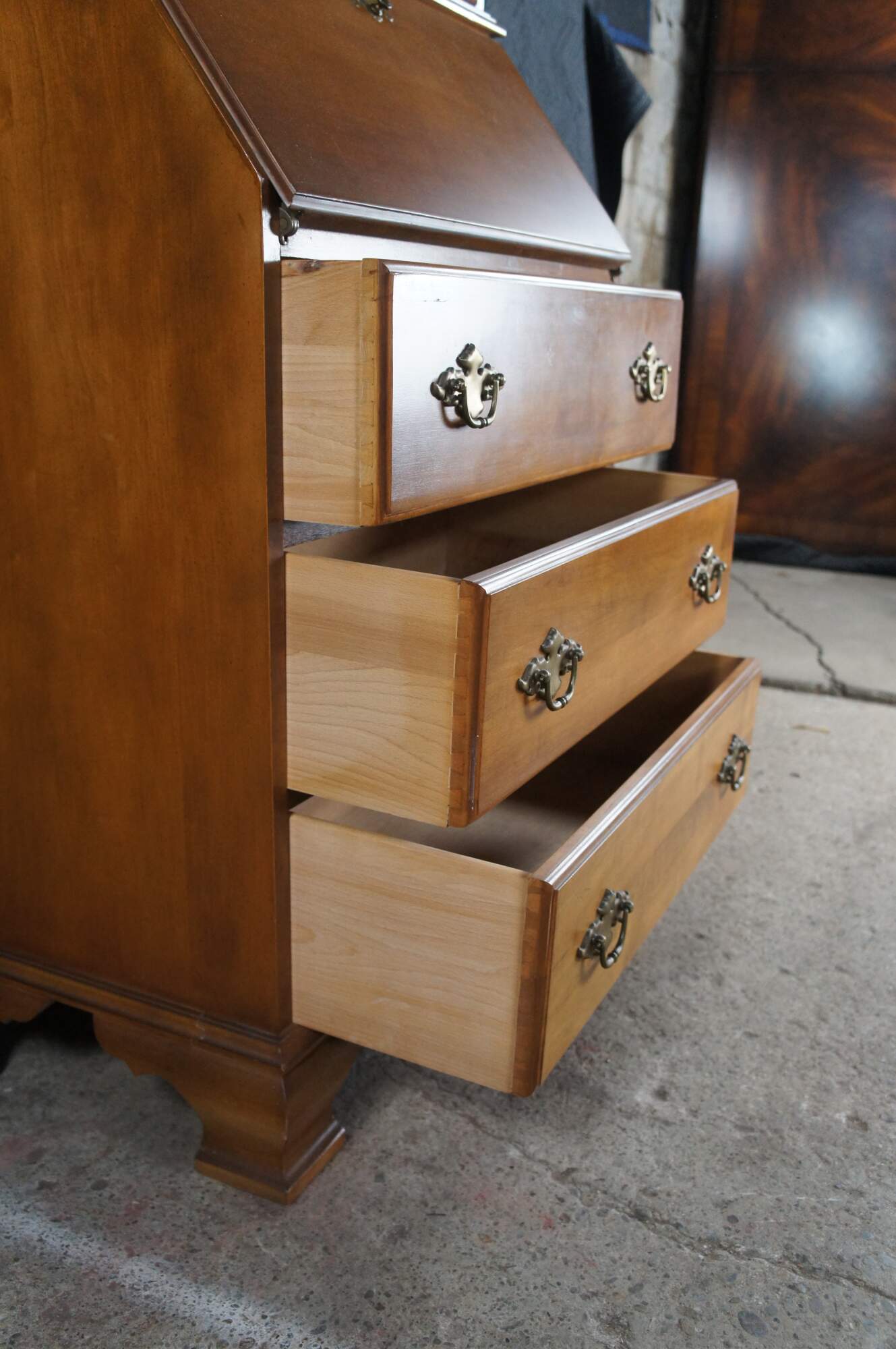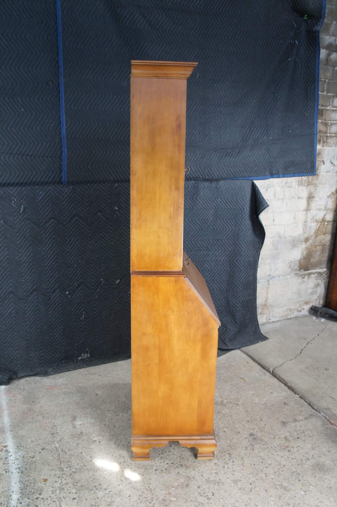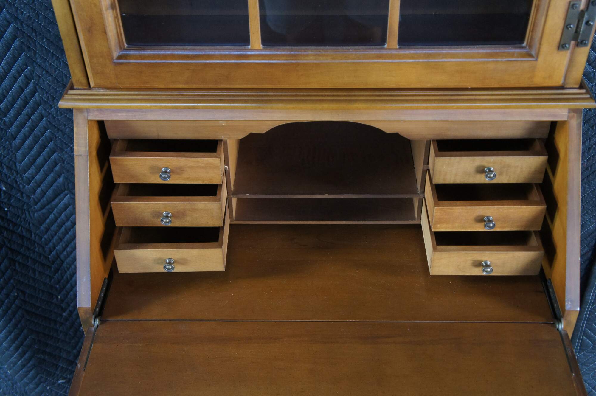 A Petite Secretary Desk & Bookcase by Jasper Cabinet Company of Indiana. Circa 1980s. Features a maple case crafted in colonial styling with an arcaded glass front door opening to three shelves over a drop front secretary with six drawers and two cubies. The lower portion of the case has three dovetailed drawers with colonial style brass bale hardware. The secretary is supported by bracket feet. Great for use in a library, office or study.