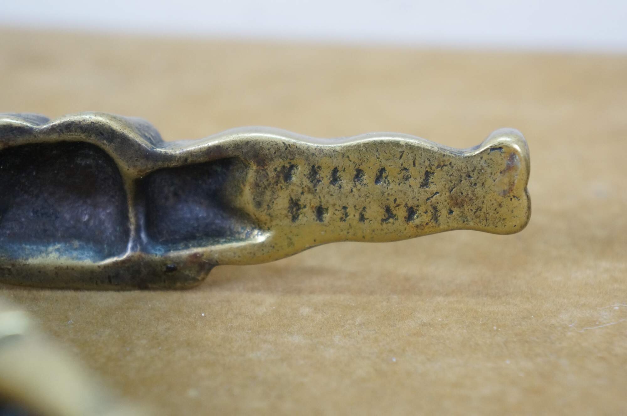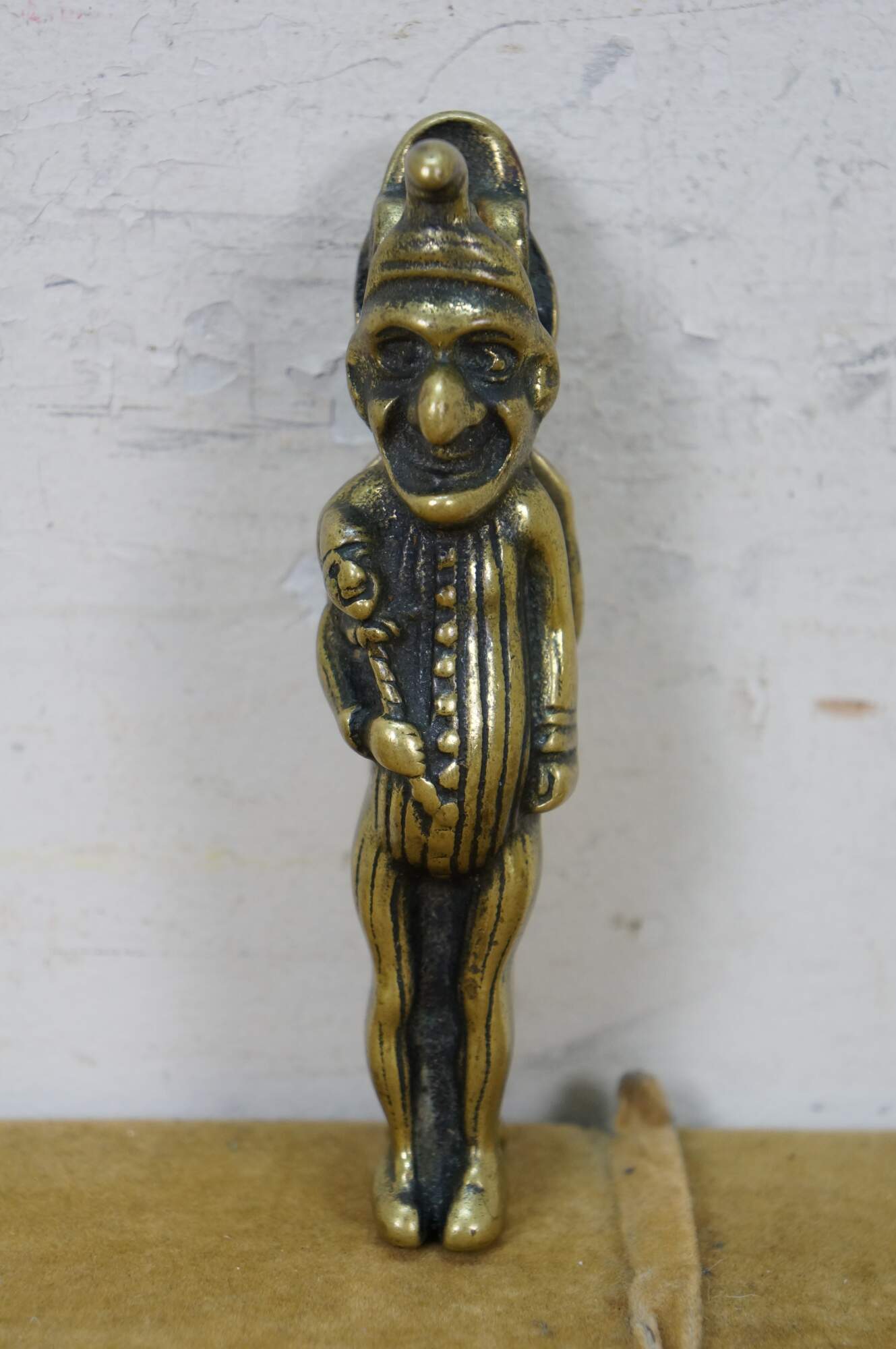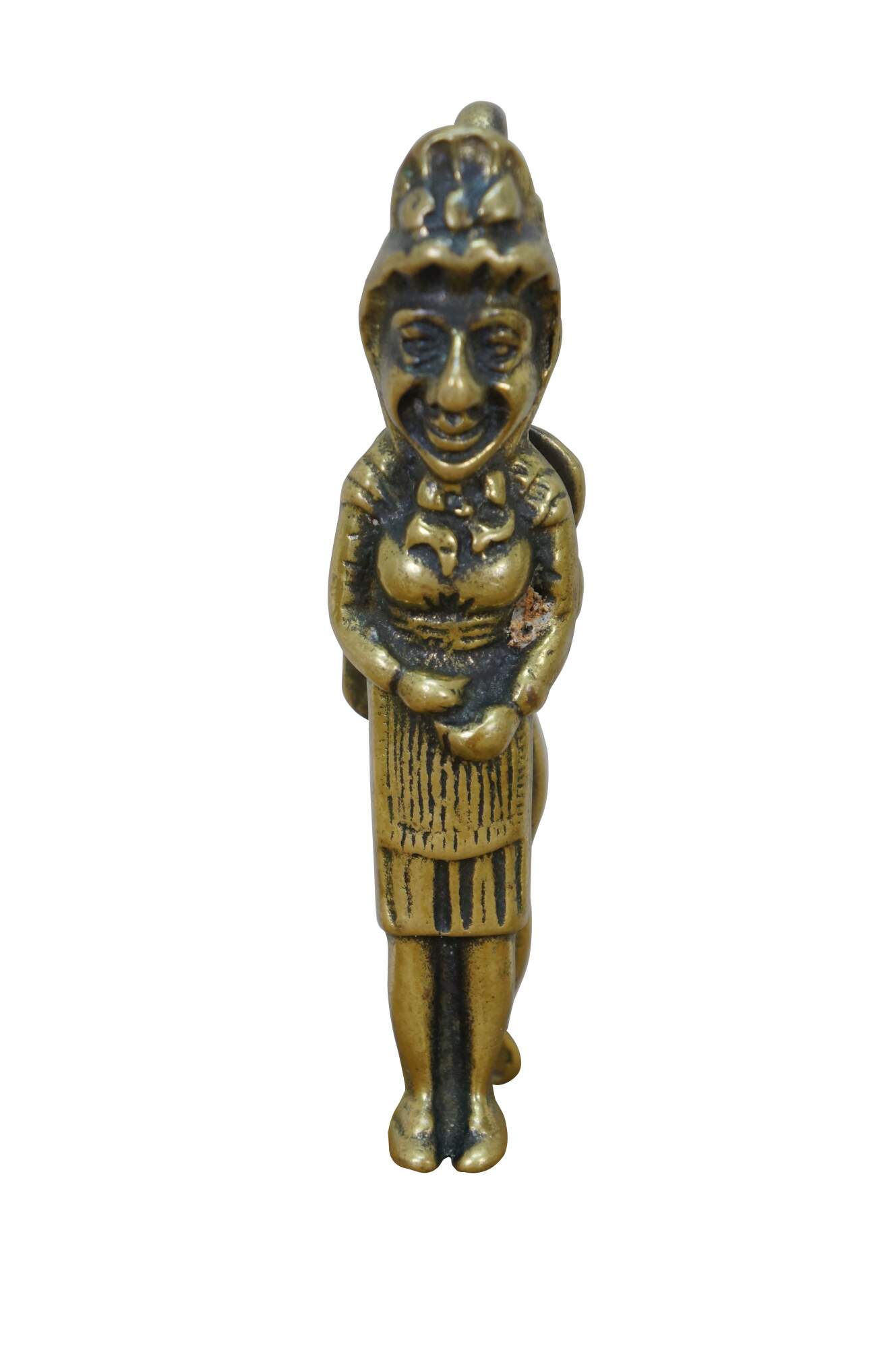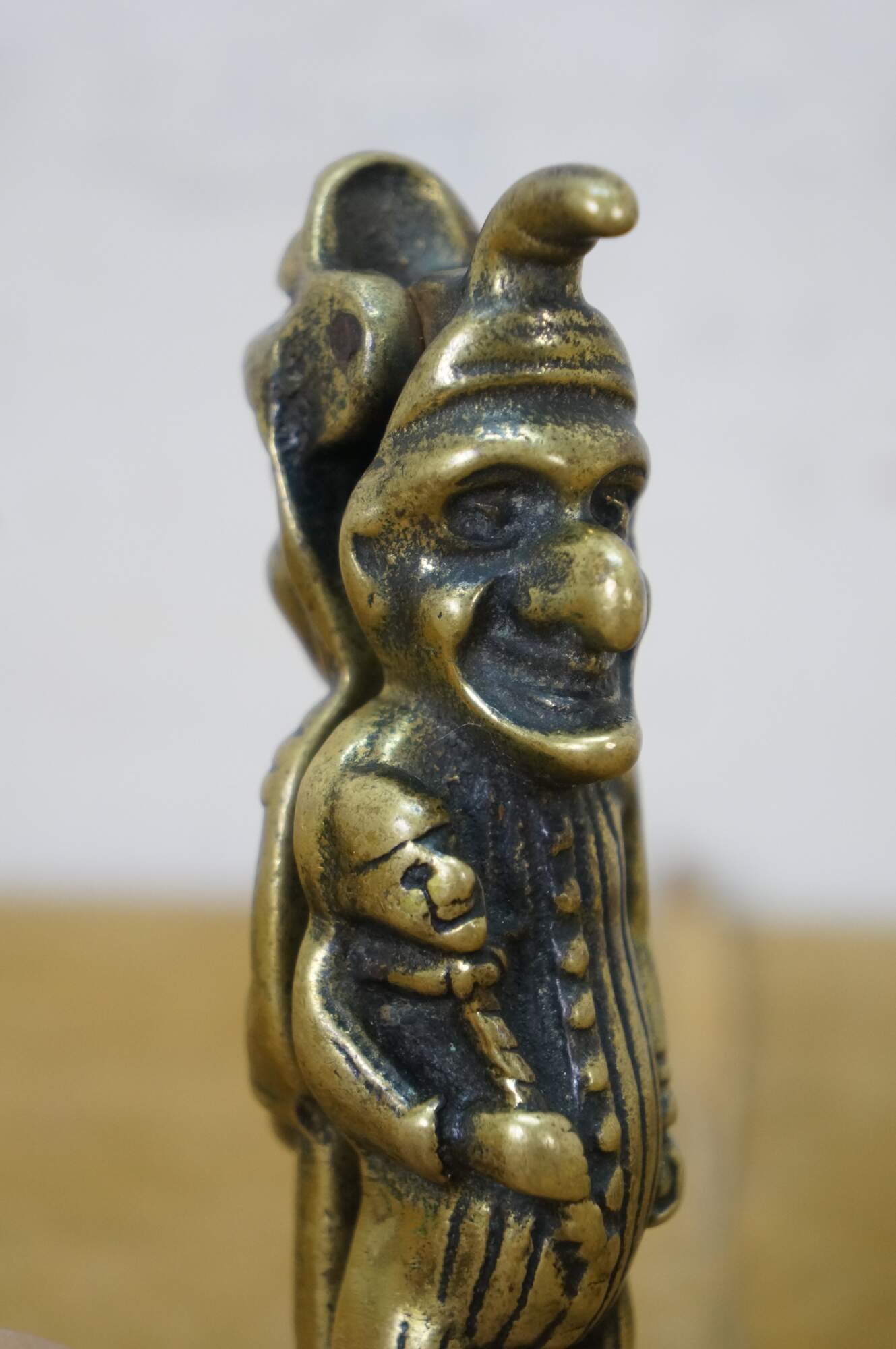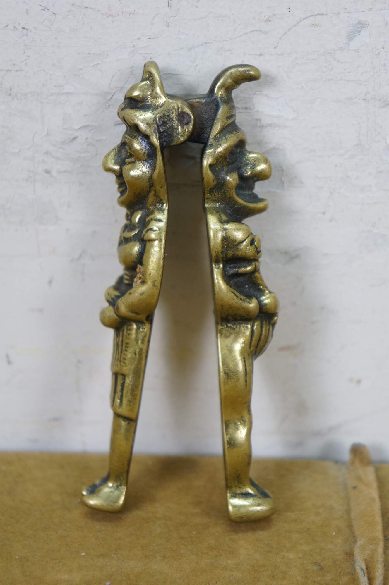Pair of vintage 20th Peerage brass nutcrackers. One features traditional British puppet show characters Mr. Punch and Judy. the other features an anthropomorphic goat standing over the legend "Trusty Servant" one one side and a armorial design over "Winchester" on the other.
