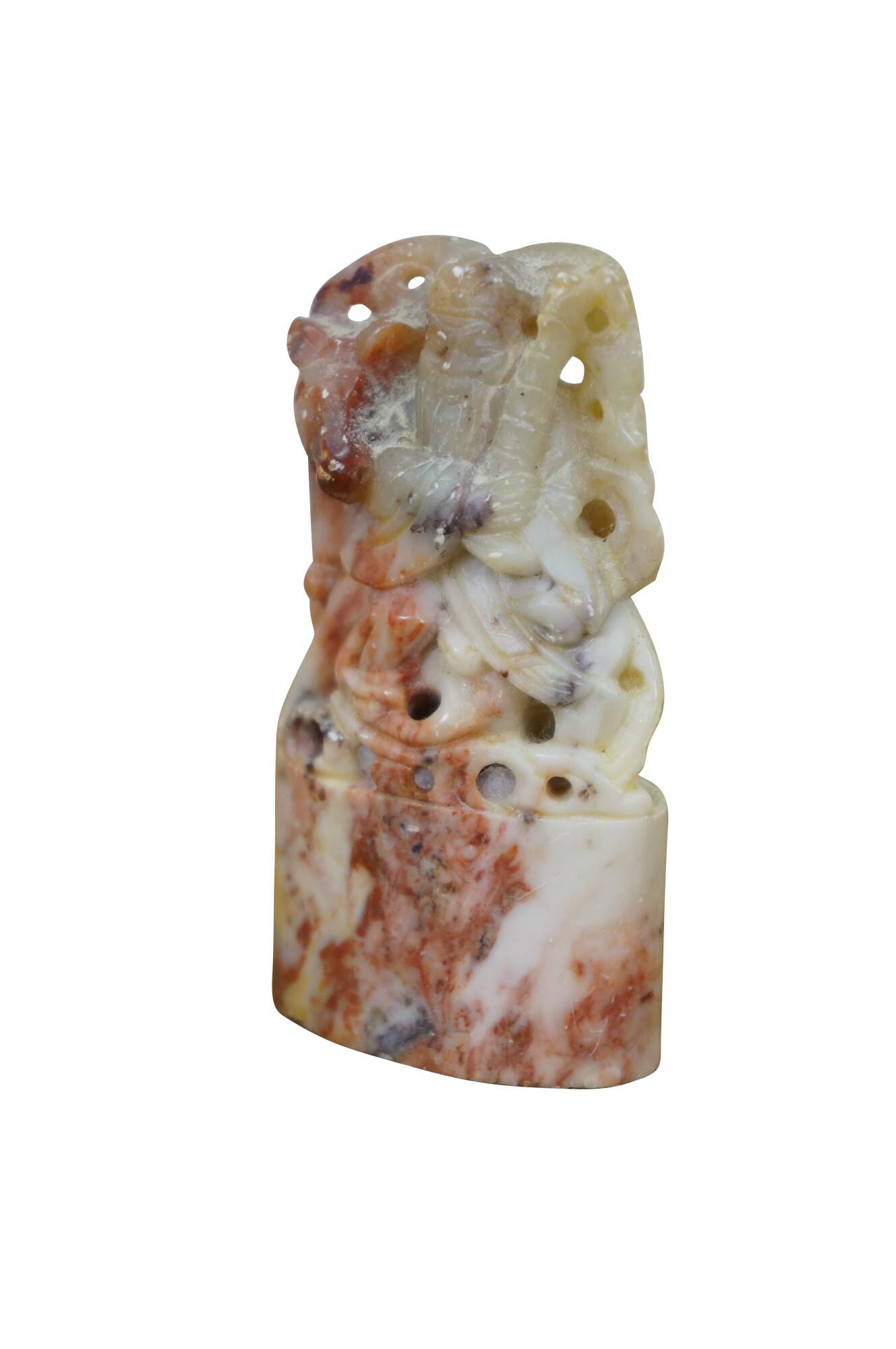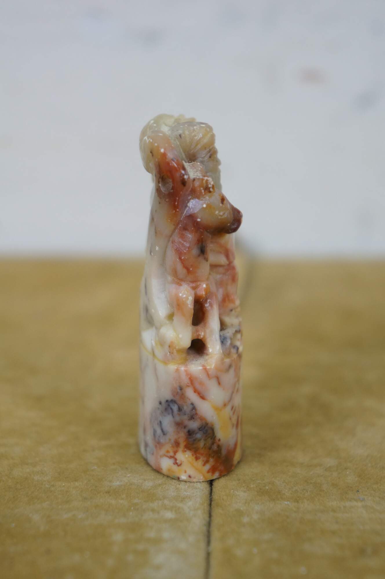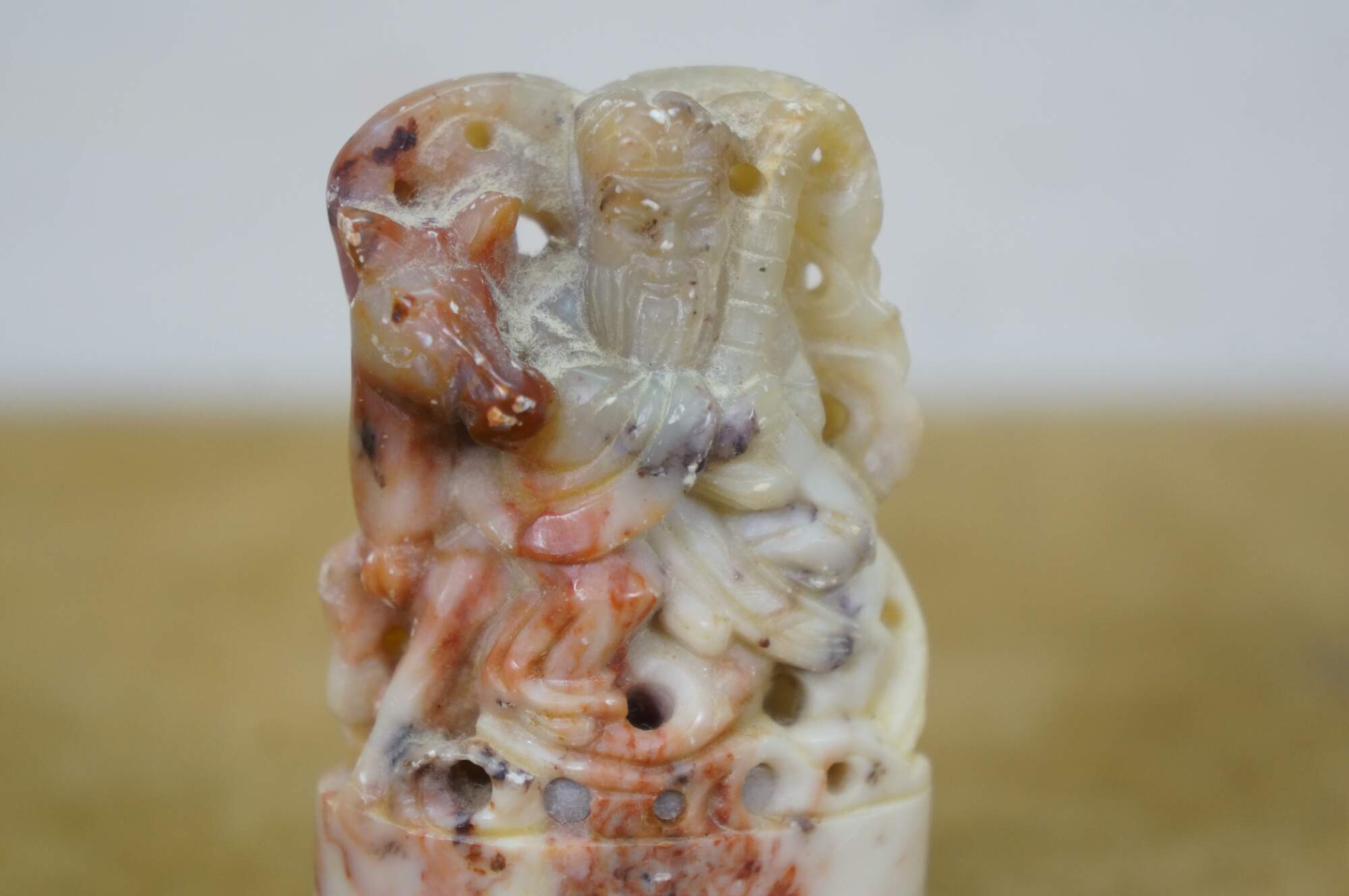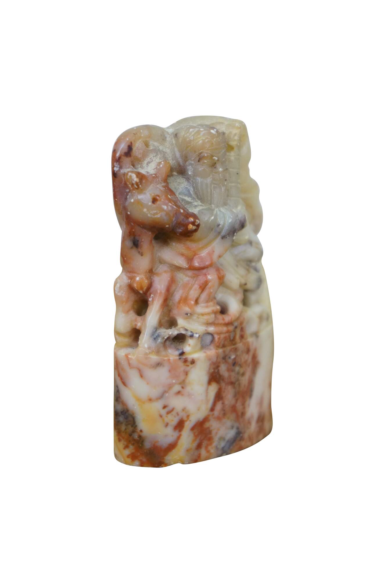 Vintage Chinese soapstone signature seal. Made of mottles red and white soapstone, carved in the shape of a man with a beard, holding a staff, seated on a horse. Base is oval shaped with two lines of engraved characters.