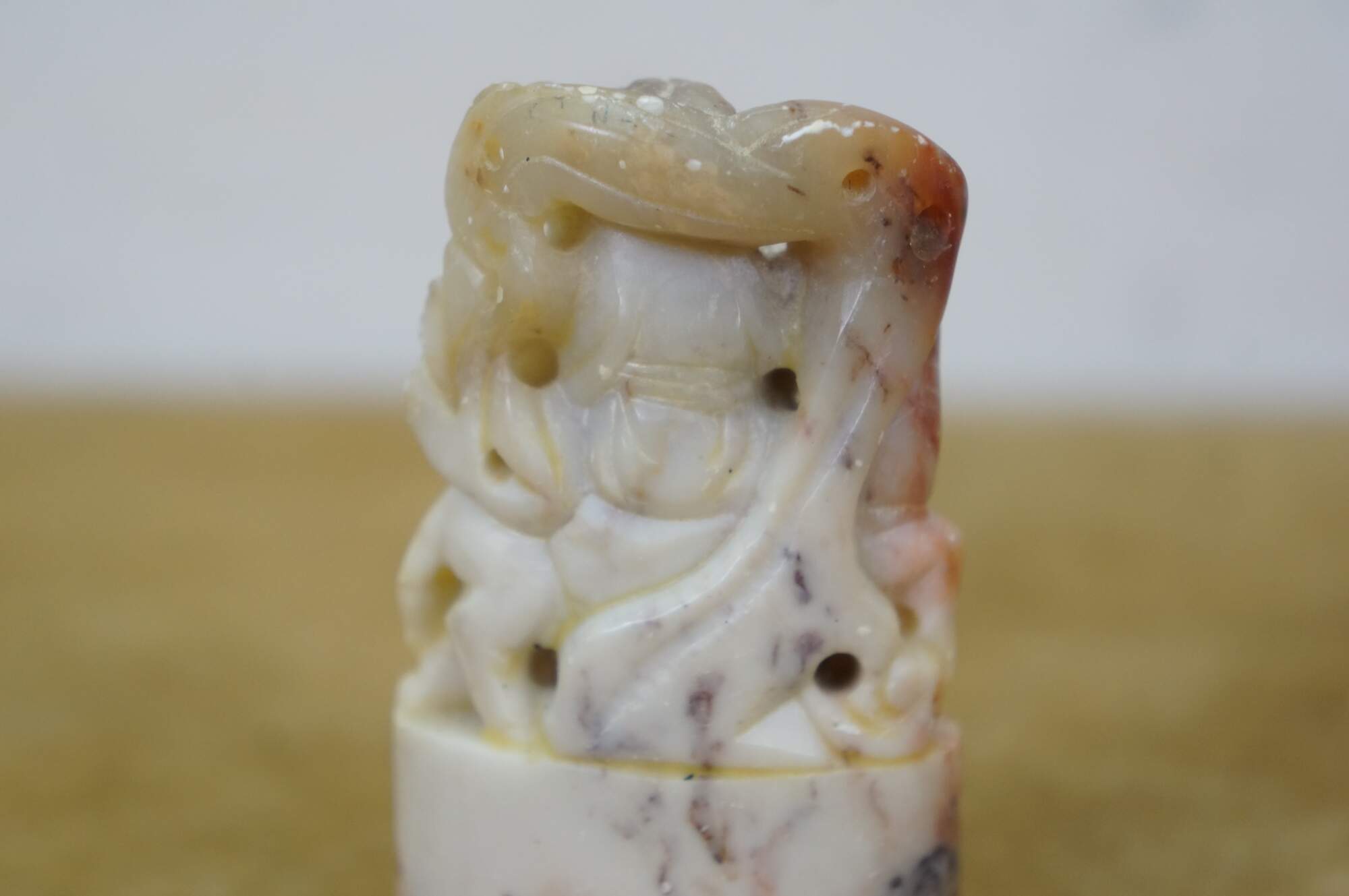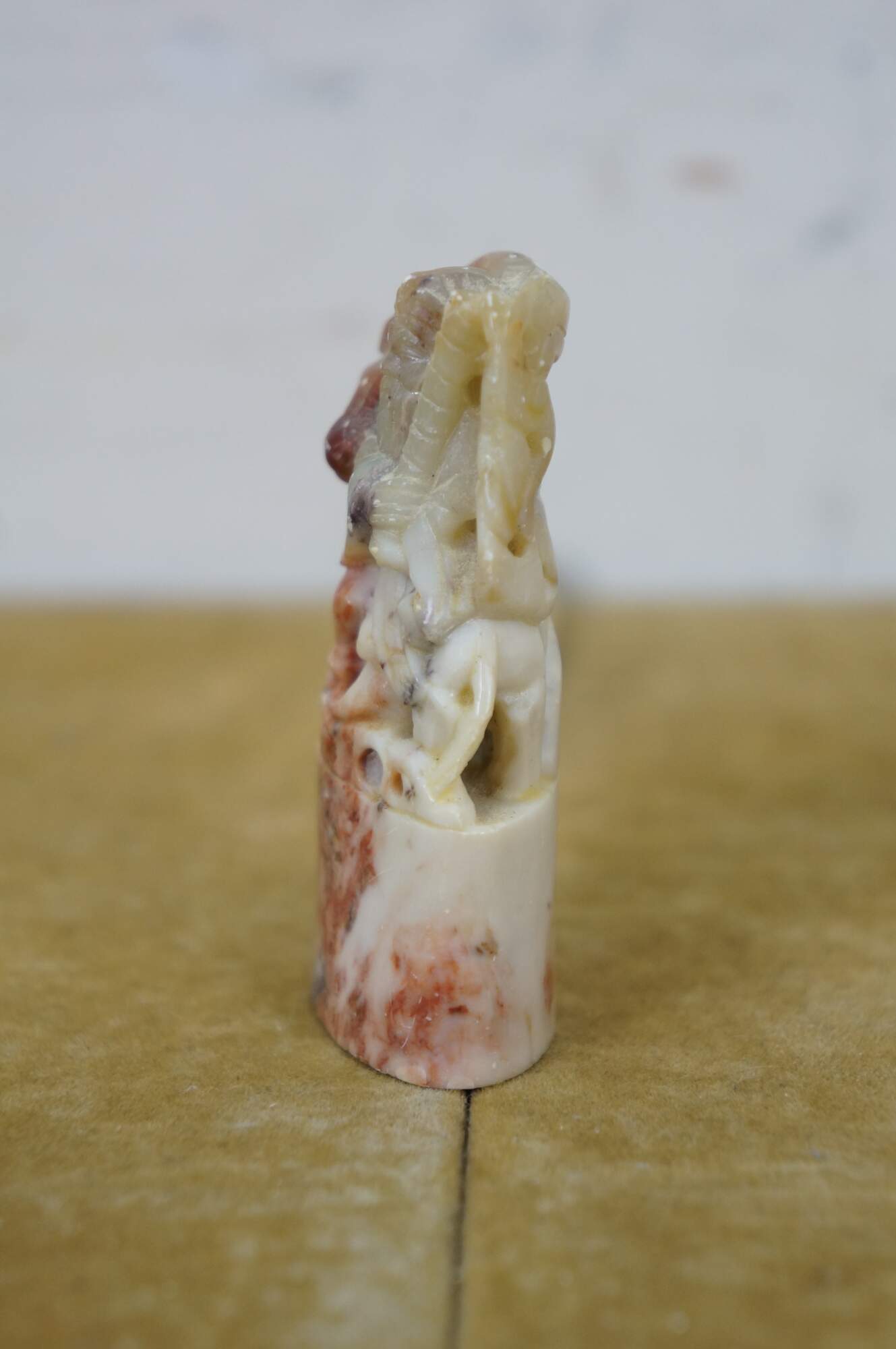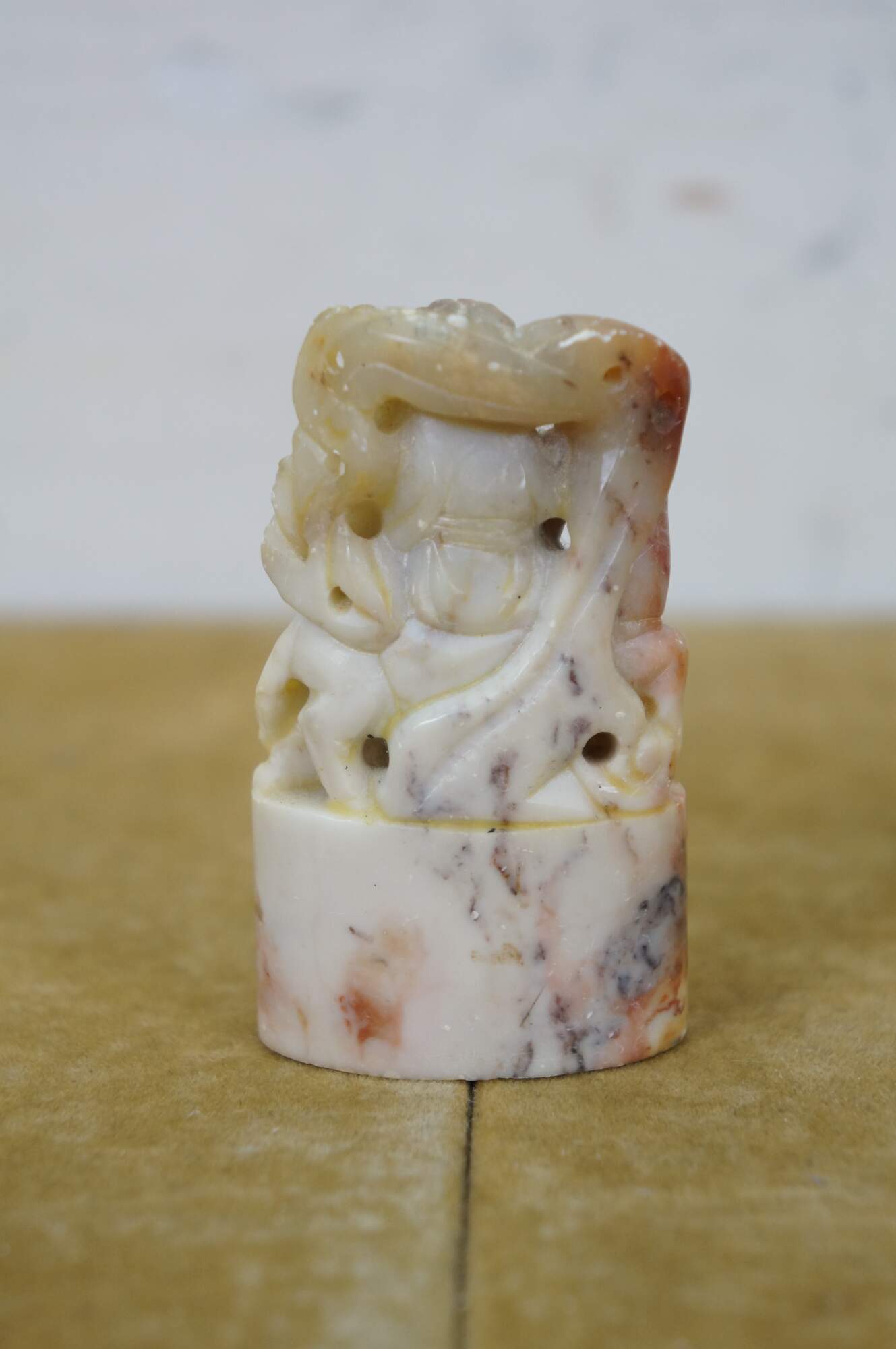 Vintage Chinese soapstone signature seal. Made of mottles red and white soapstone, carved in the shape of a man with a beard, holding a staff, seated on a horse. Base is oval shaped with two lines of engraved characters.