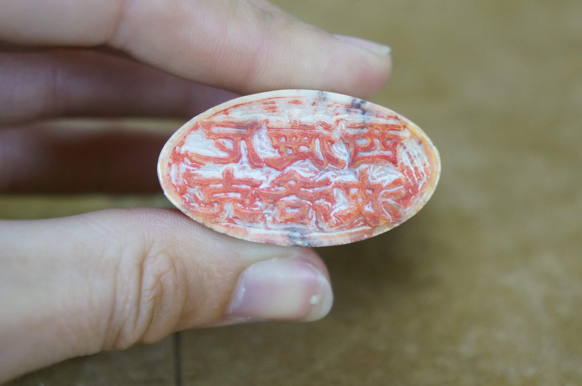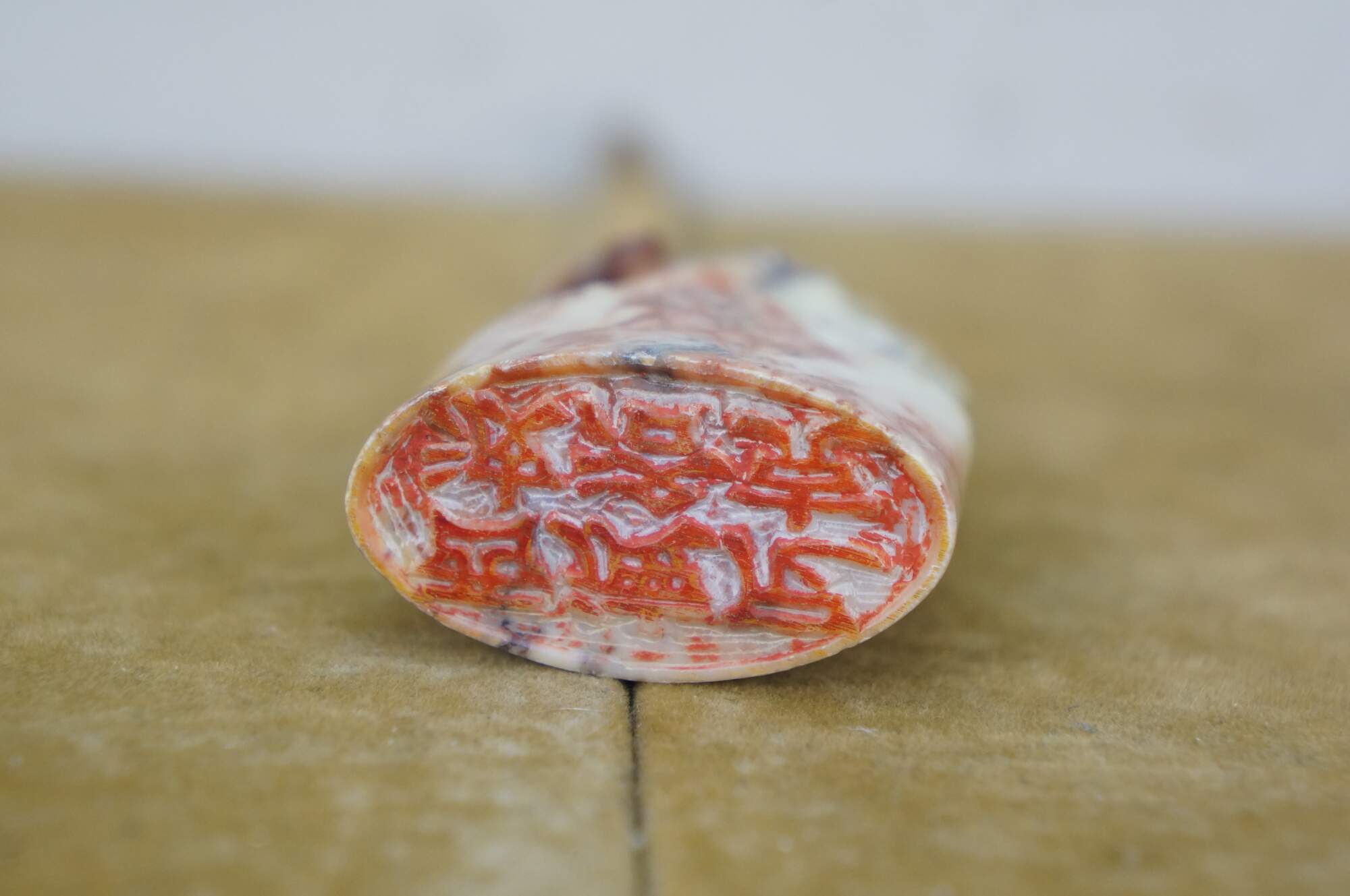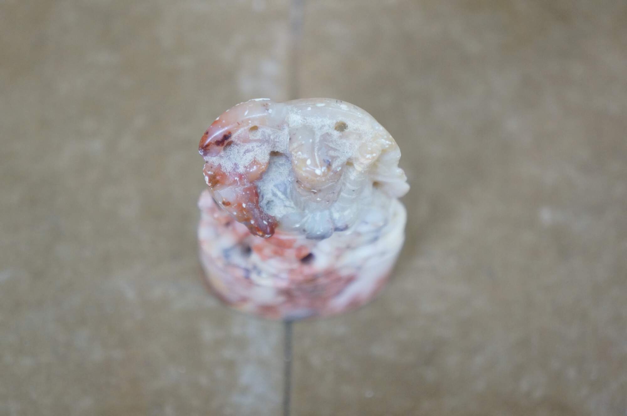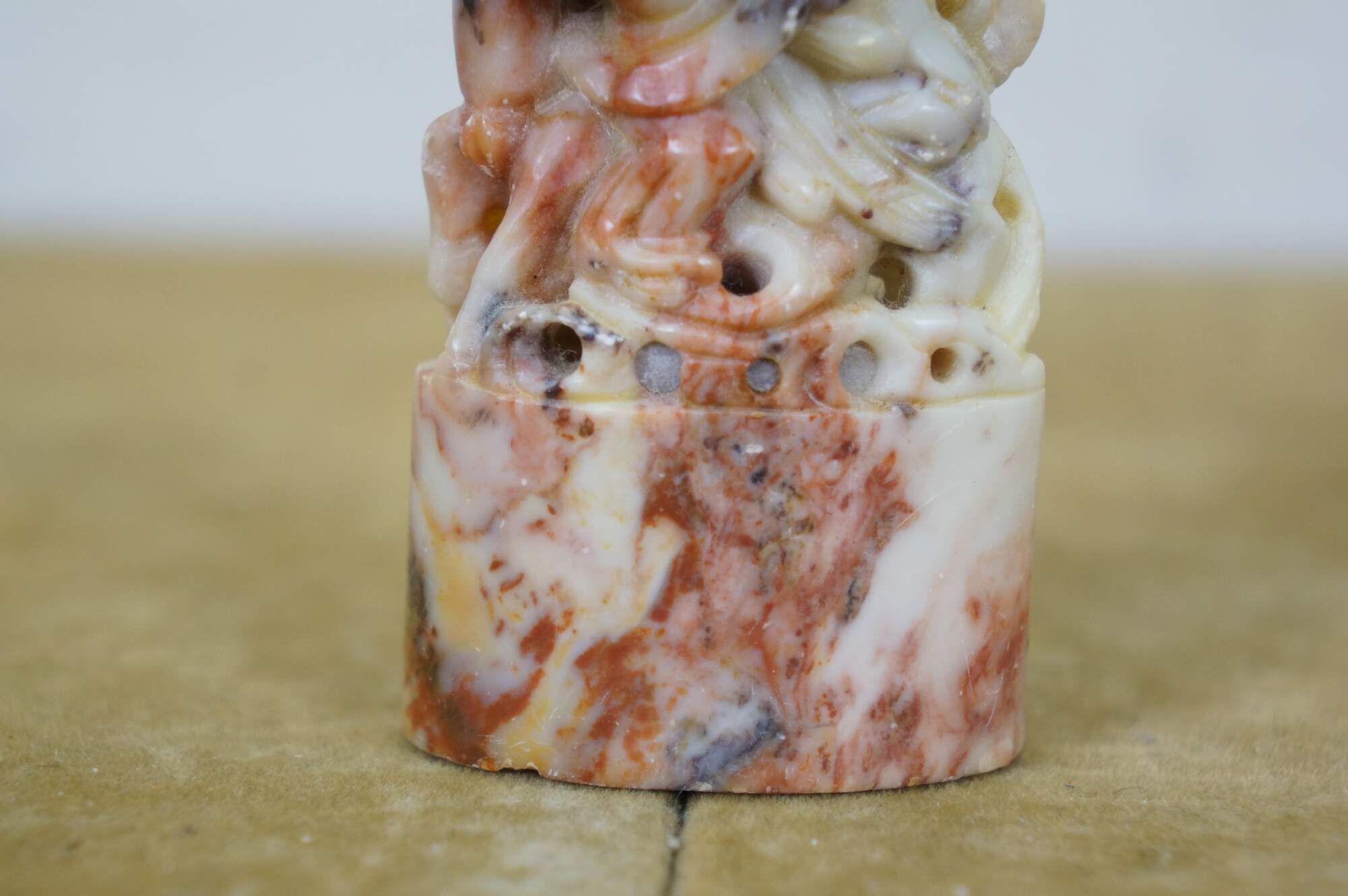 Vintage Chinese soapstone signature seal. Made of mottles red and white soapstone, carved in the shape of a man with a beard, holding a staff, seated on a horse. Base is oval shaped with two lines of engraved characters.