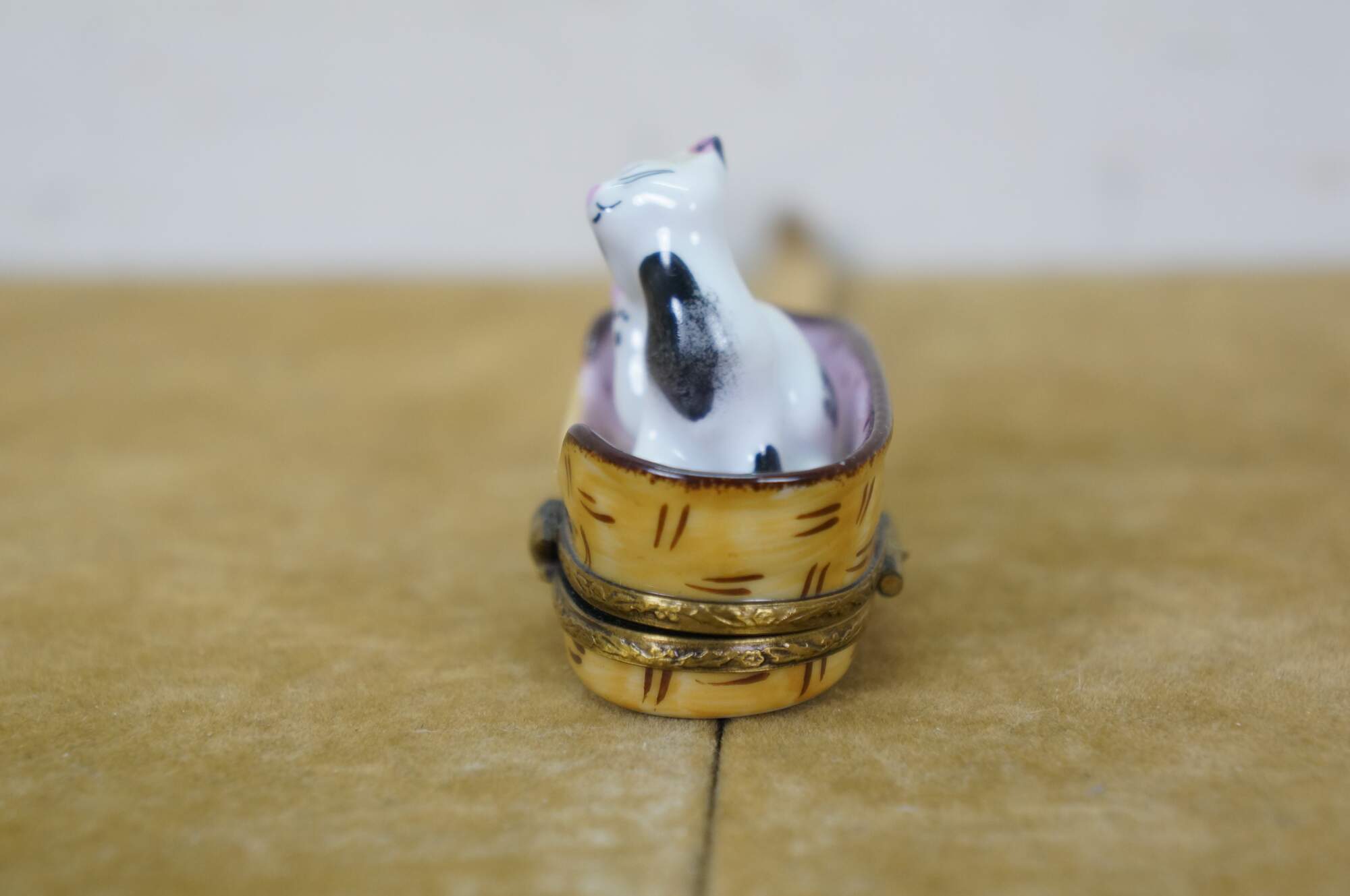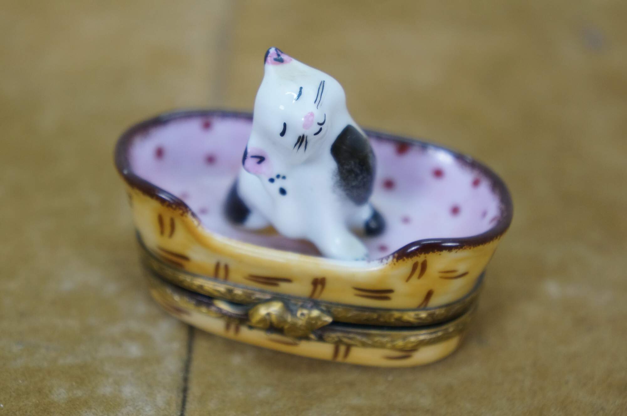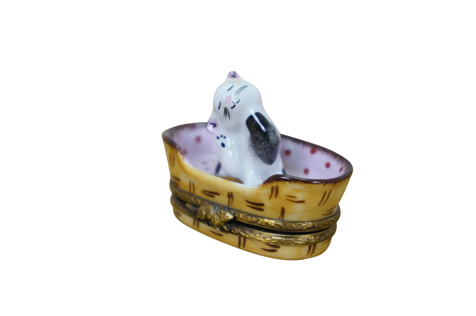 Late 20th century Limoges porcelain trinket / keepsake box in the shape of a black and white kitten scratching its ear, seated in a pink polka dot lined cat basket. Basket hinges at the base with foliate brass bands and a mouse shaped clasp. Ball of yarn painted inside. Peint main - Limoges France - GR.