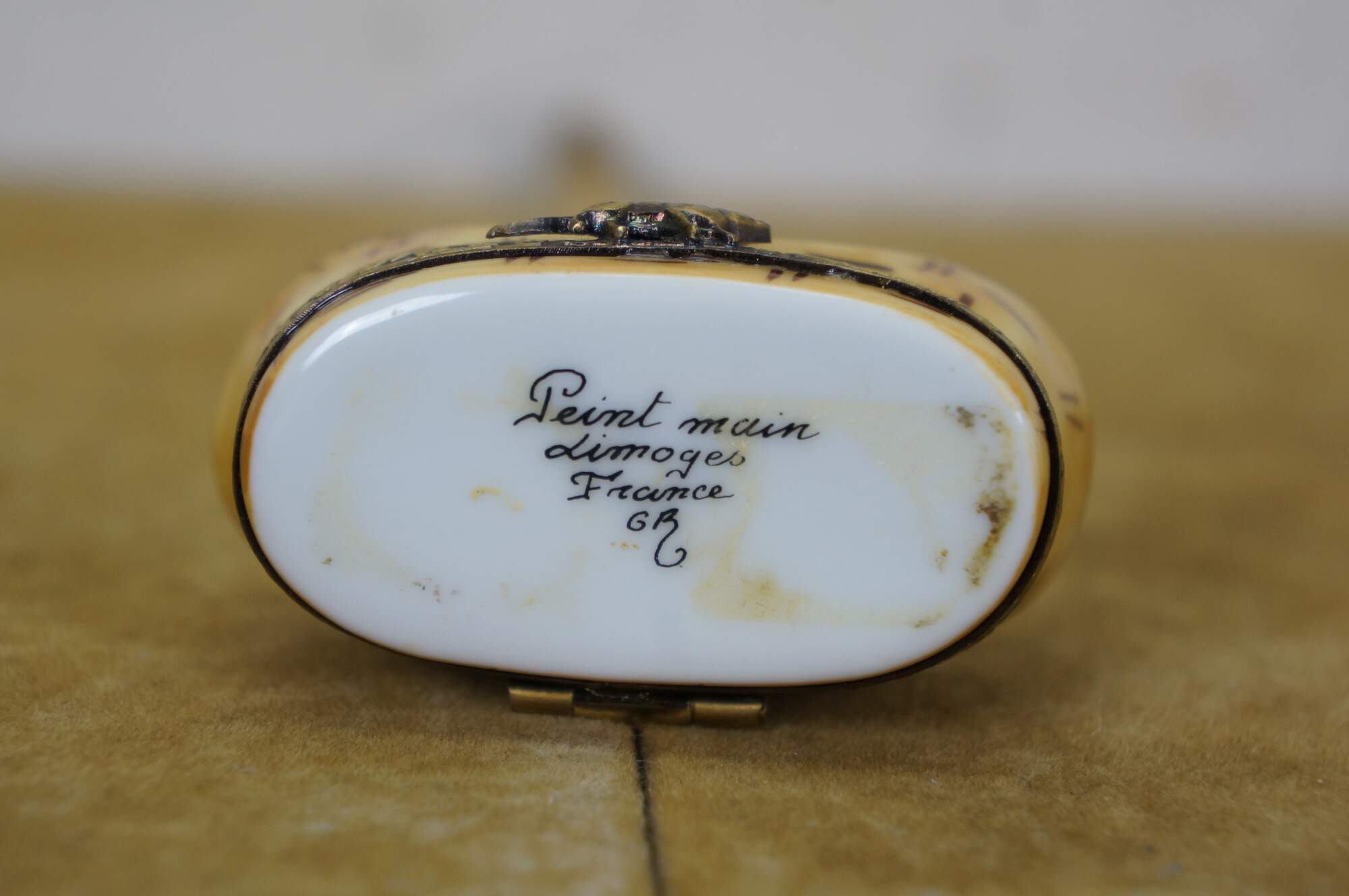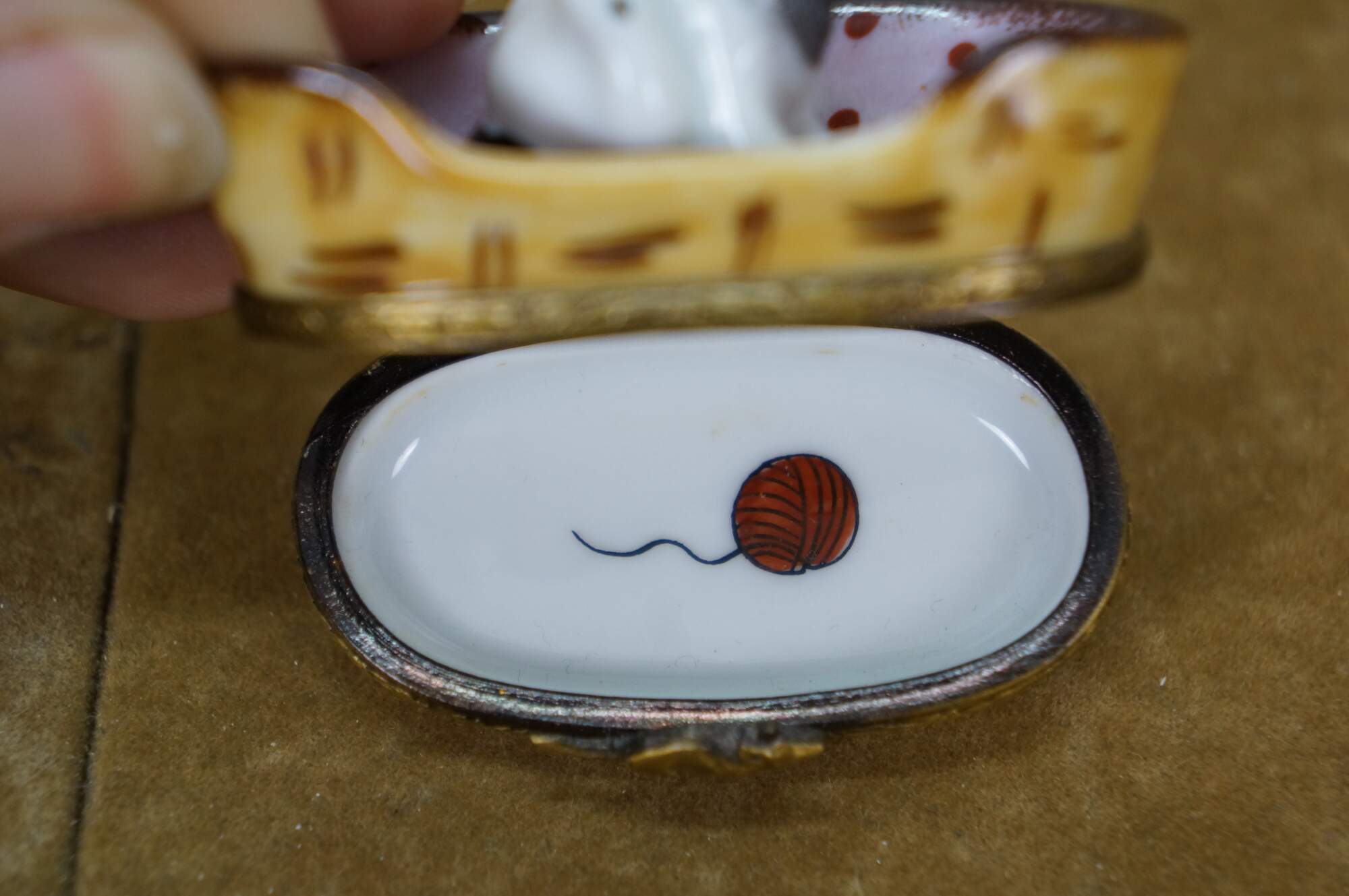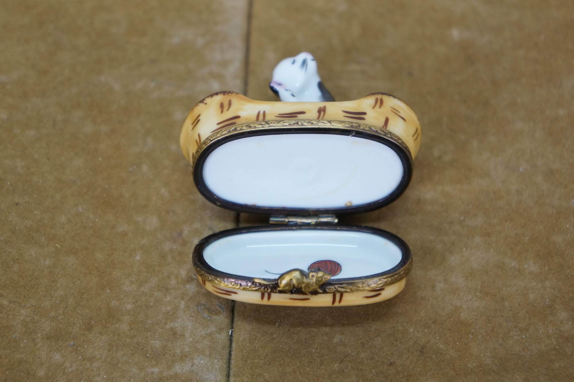 Late 20th century Limoges porcelain trinket / keepsake box in the shape of a black and white kitten scratching its ear, seated in a pink polka dot lined cat basket. Basket hinges at the base with foliate brass bands and a mouse shaped clasp. Ball of yarn painted inside. Peint main - Limoges France - GR.