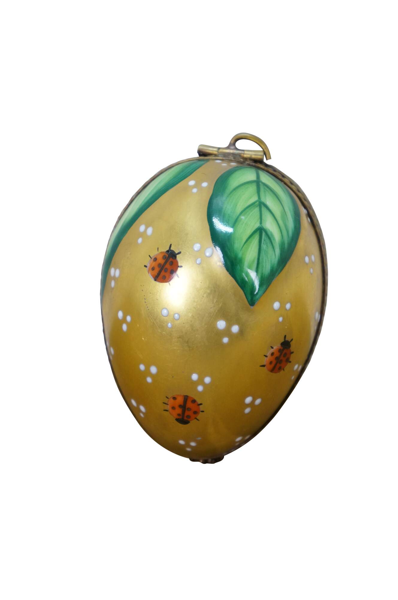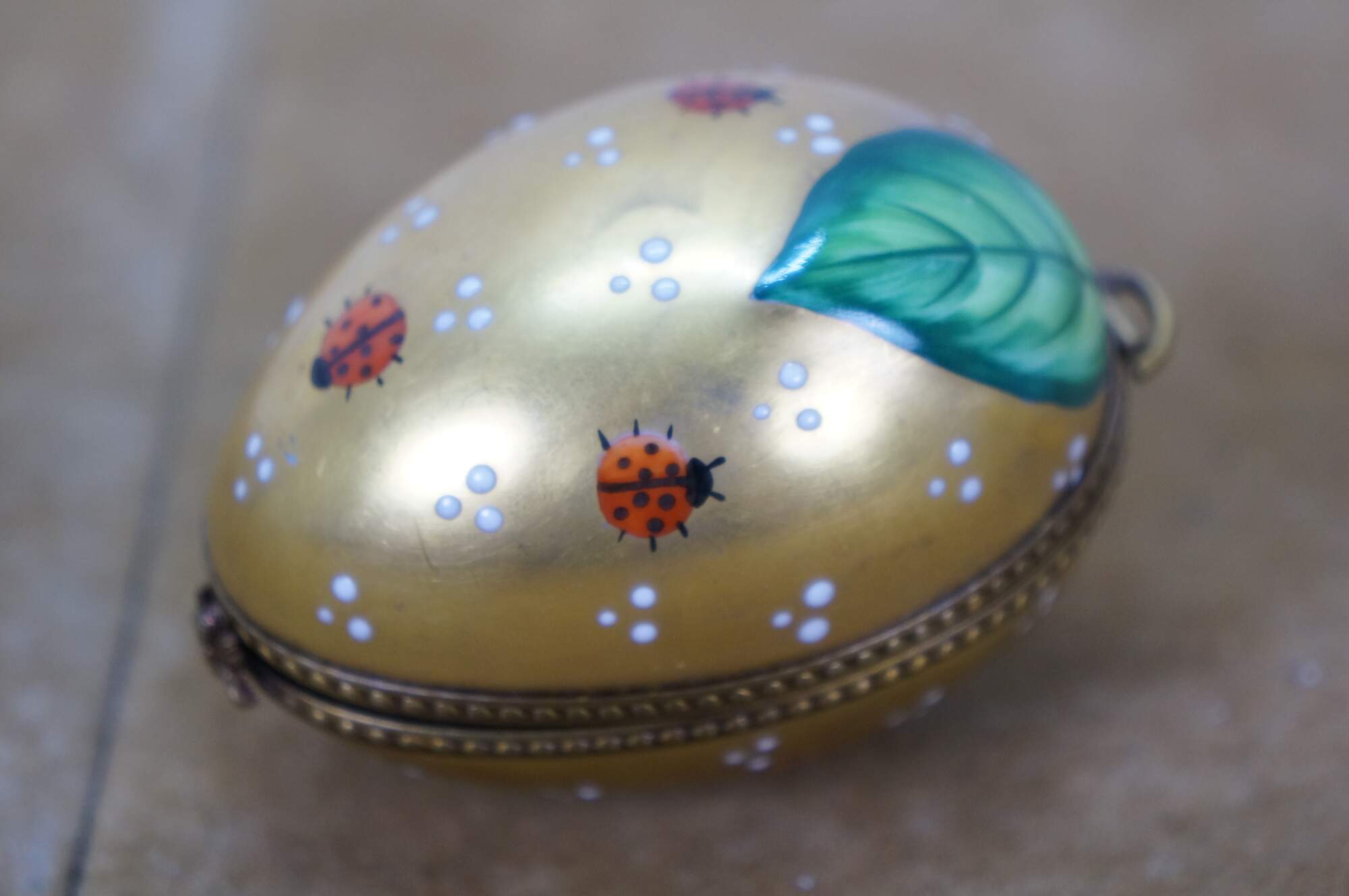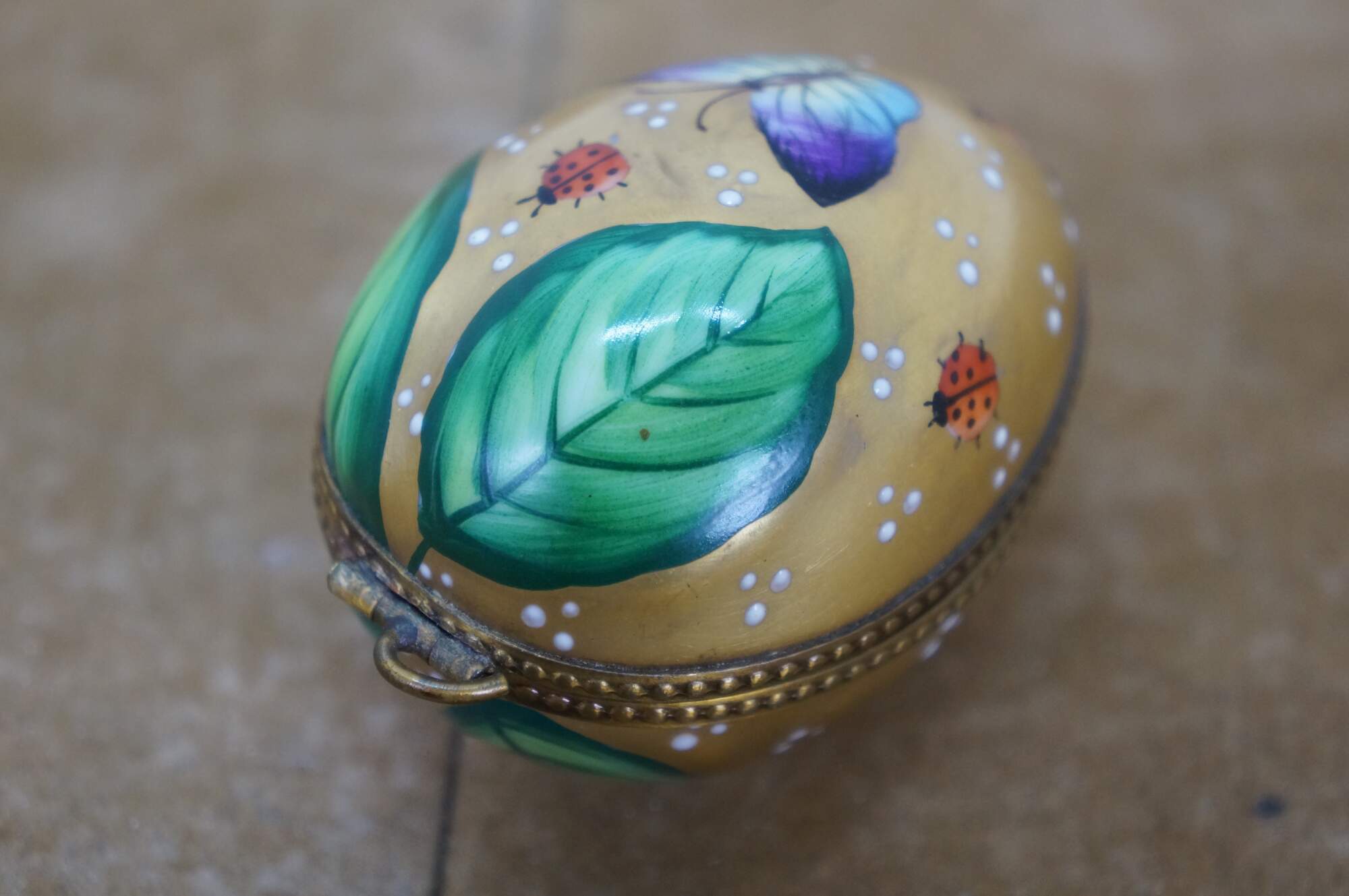 Late 20th century Limoges porcelain trinket / keepsake box in the shape of an egg, hand painted in gold with greens leaves, a purple and blue butterfly, and red ladybugs. Hinges longways at the middle with eaded brass bans and a bee shaped clasp. Limoges France - Peint Main P.V.