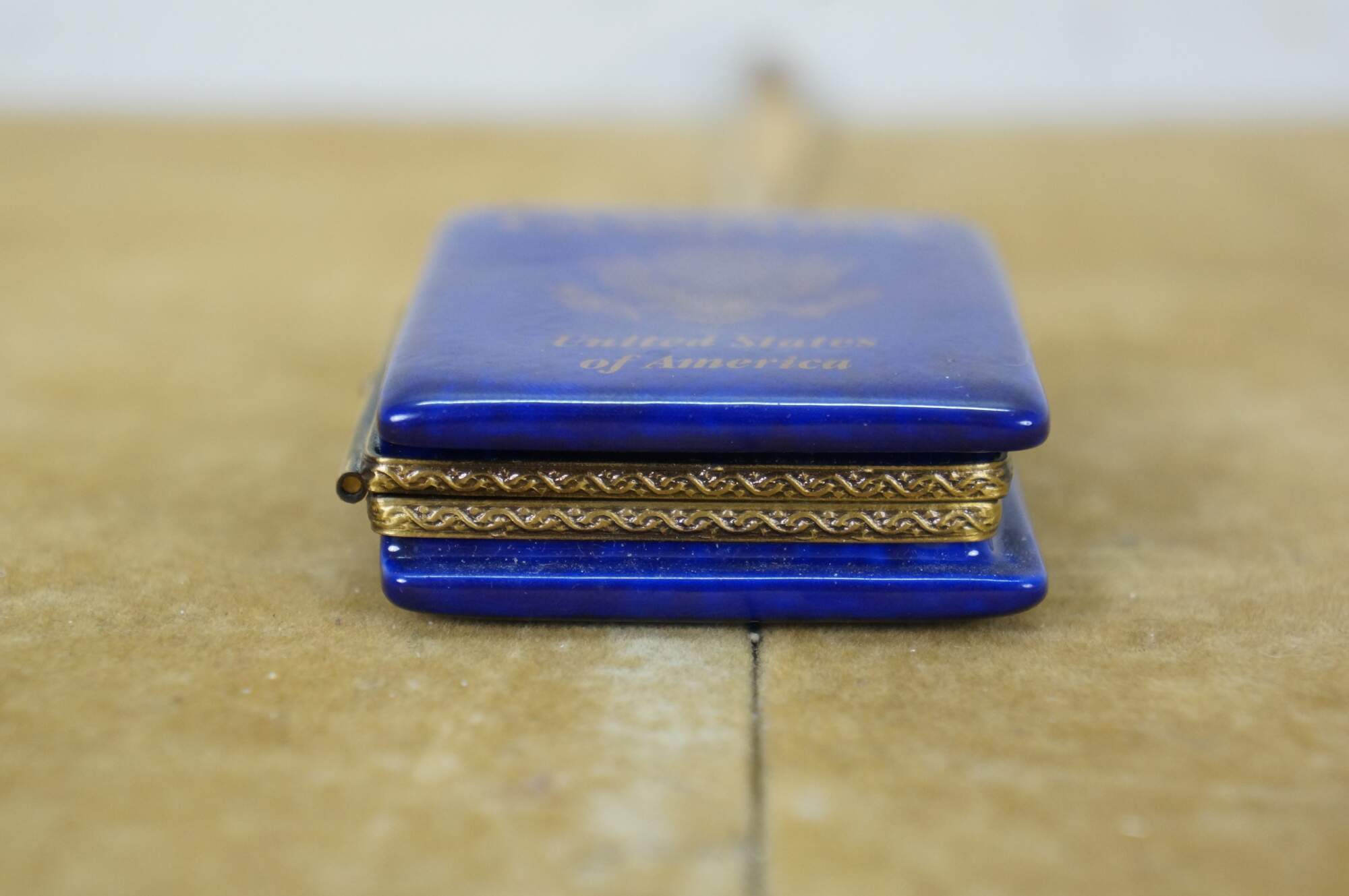 Late 20th century Elda Creations limited edition hand painted Limoges porcelain trinket / keepsake box in the shape of a blue and gold United States passport book with a miniature "Love from France" postcard inside. Hinges like a book with twisted vine bands and bow shaped clasp. Elda Creations - Peint a la Main - Limoges France - 339/750.