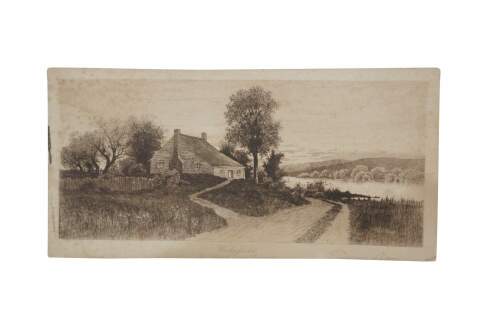 Late 19th century black and white etching titled Wakefield: Birthplace of George Washington by Ernest C Rost. Landscape featuring a small clapboard house at the edge of a river. Pencil signed, lower right. Paper on Cardwtock; un-framed.