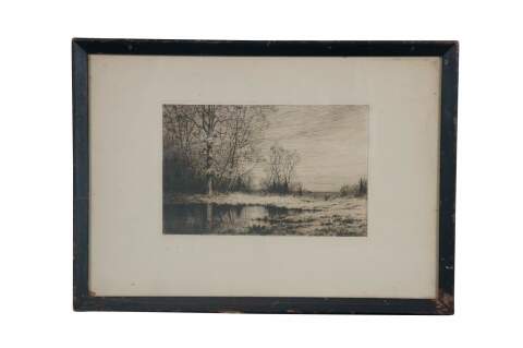 Late 19th century black and white etching titled "The Last Walk in Autumn" by Henry Farrer. Country landscape featuring a figure approaching a pond at the edge of the woods. Black beveled wood frame; no mat.