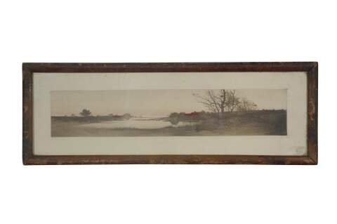Late 19th century Ernest C Rost panormaic country landscape etching featuring red roofed barns / farmhouses around a pond / lake. Copyrighted by Radtke, Lauckner & Co, New York, 1890. Wood Frame; no mat.
