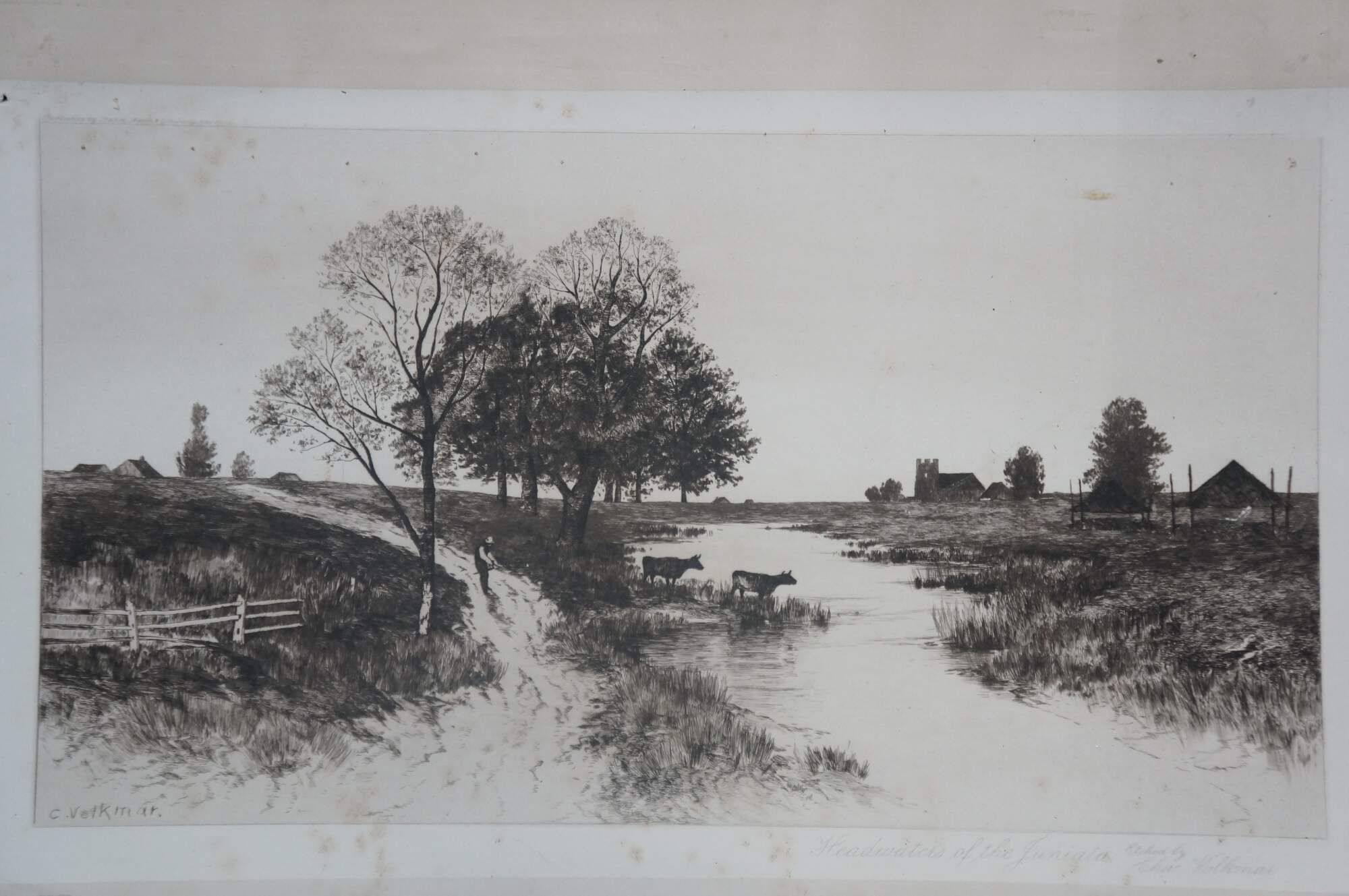 Late 19th century black and white etching titled "Headwaters of the Juniata" by Charles Volkmar. Country landscape with cottages and a pair of cows in a river. Signed in plate C. Volkmar, lower left. Published by Fishel, Adler & Schwartz, New York. Title and "Etched by Chas. Volkmar" printed, lower right. Paper on cardstock; un-framed.
