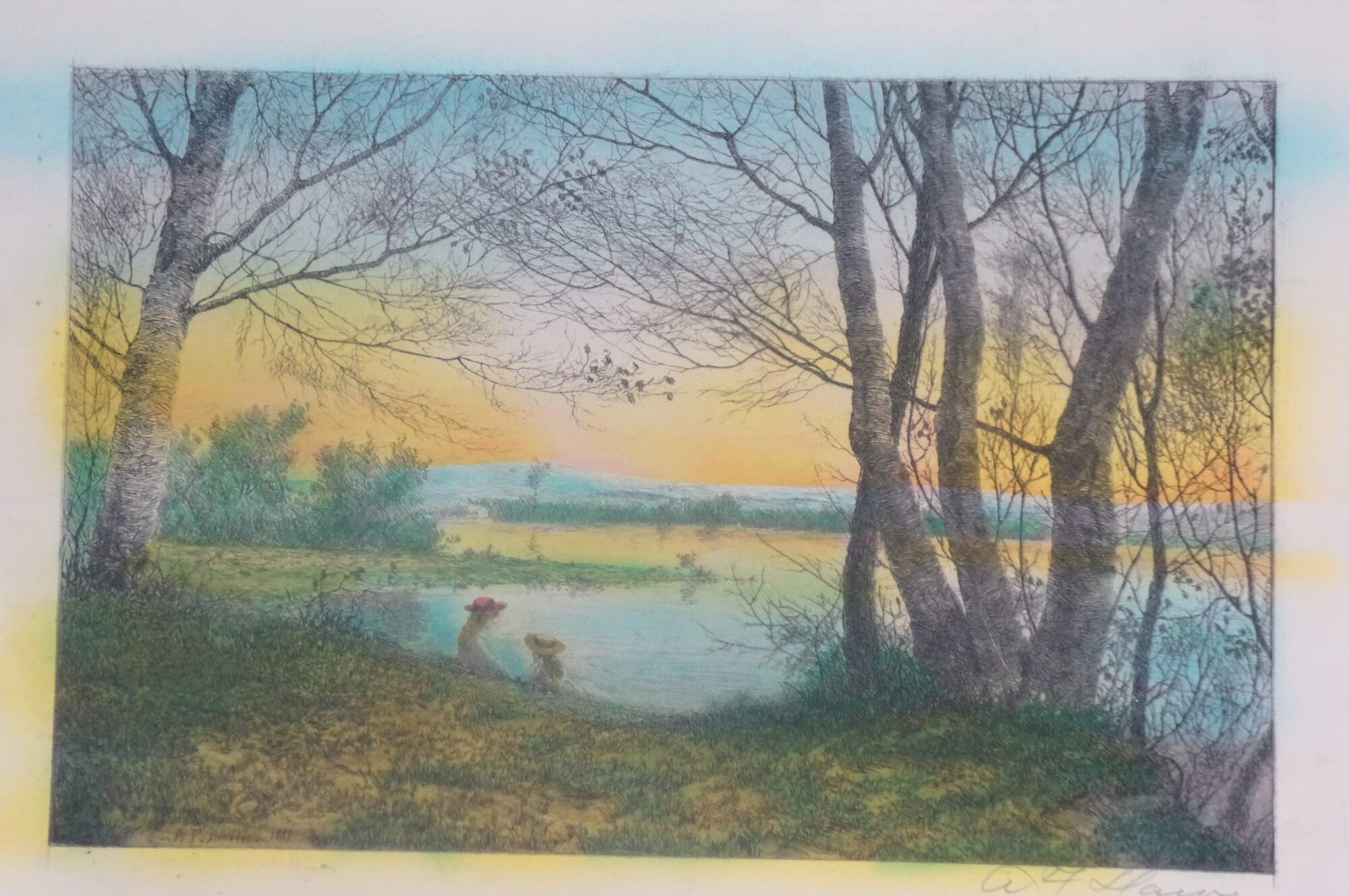 Late 19th century hand colored etching titled "On the River Bank" by Arthur Fuller Davis. Landscape showing a pair of young girls seated on a hill above a lake / river. Signed in plate A.F. Davis 1889, lower left. Pencil signed, lower right. "No. 434 On the River Bank, Etchg. by A.F. Davis" printed, lower right edge. Paper; un-framed.