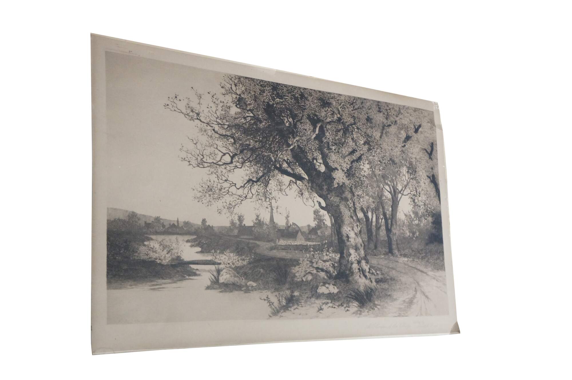 Late 19th century black and white etching titled "A Glimpse of the Village" by Ernest C Rost. Landscape of a road along a river, leading into a country village, dominated by a large, gnarled old tree. Copyright 1890 by Fishel, Adler & Scwartz, New York. Signed in plate E.C. Rost 1890. Title and "Etched by Ernest C Rost" printed, lower right. Paper on cardstock; un-framed.