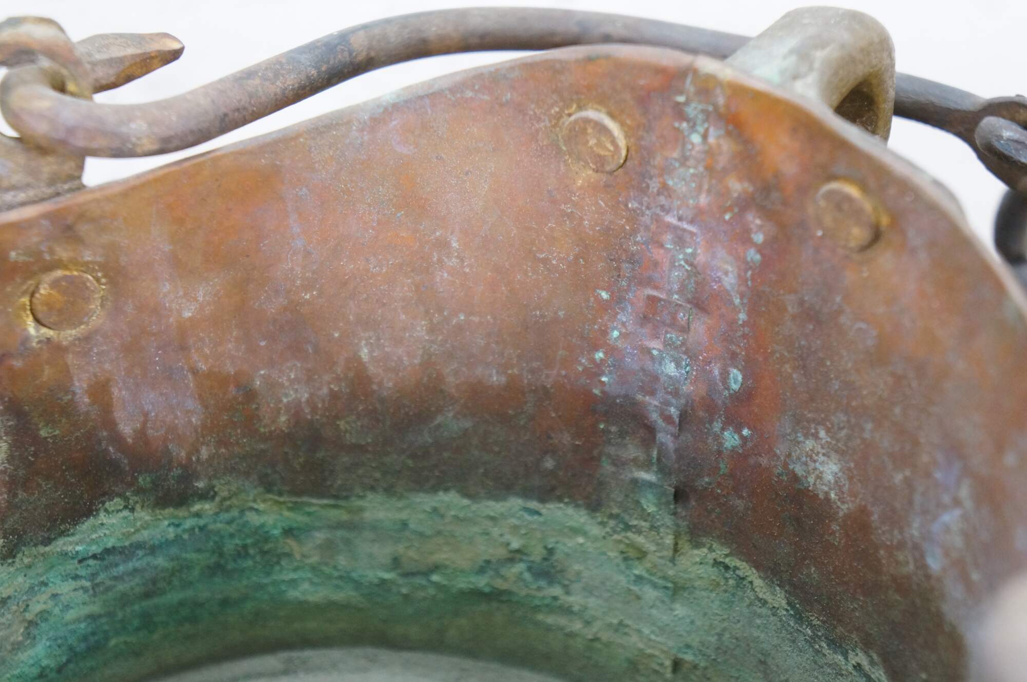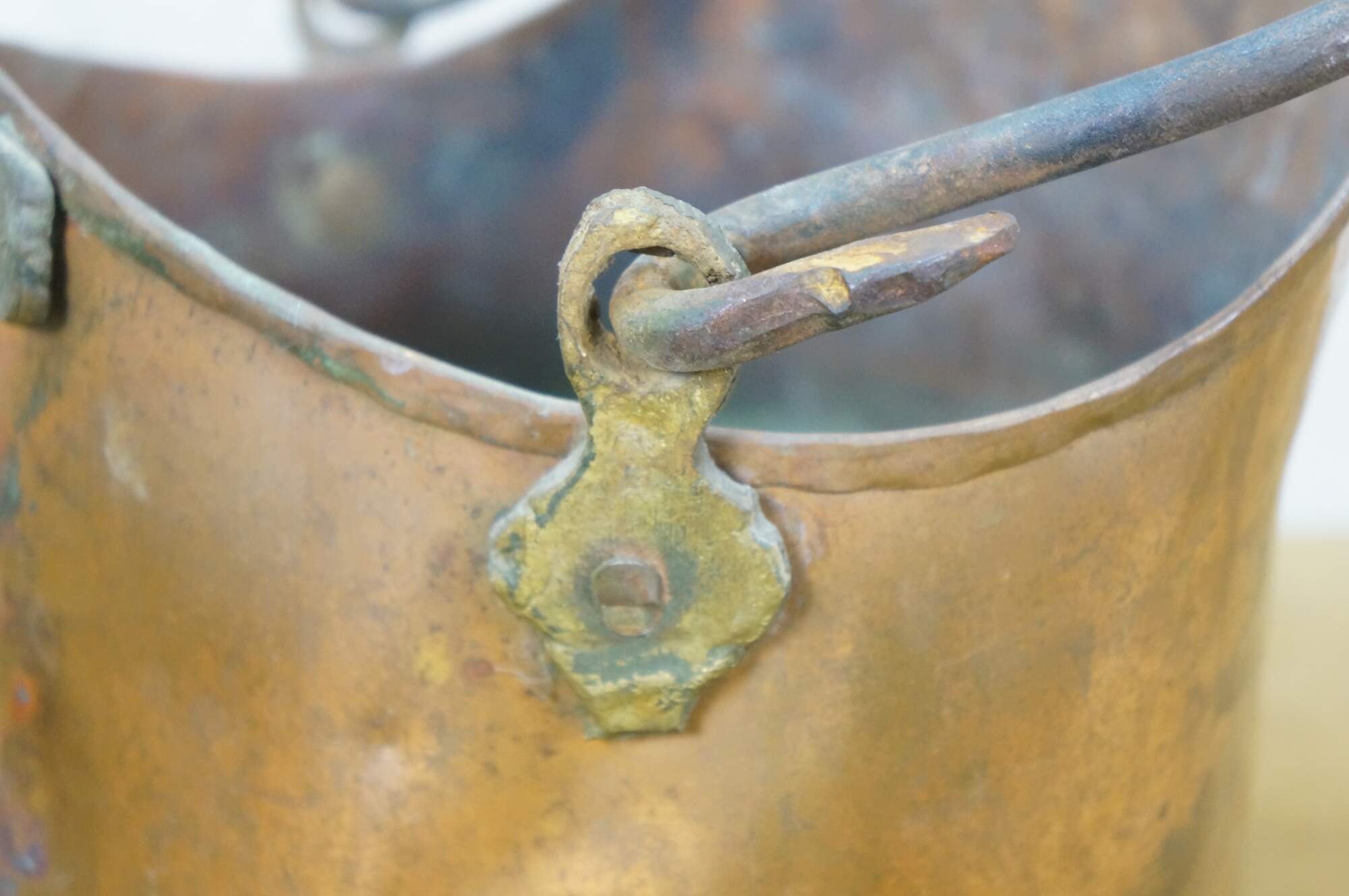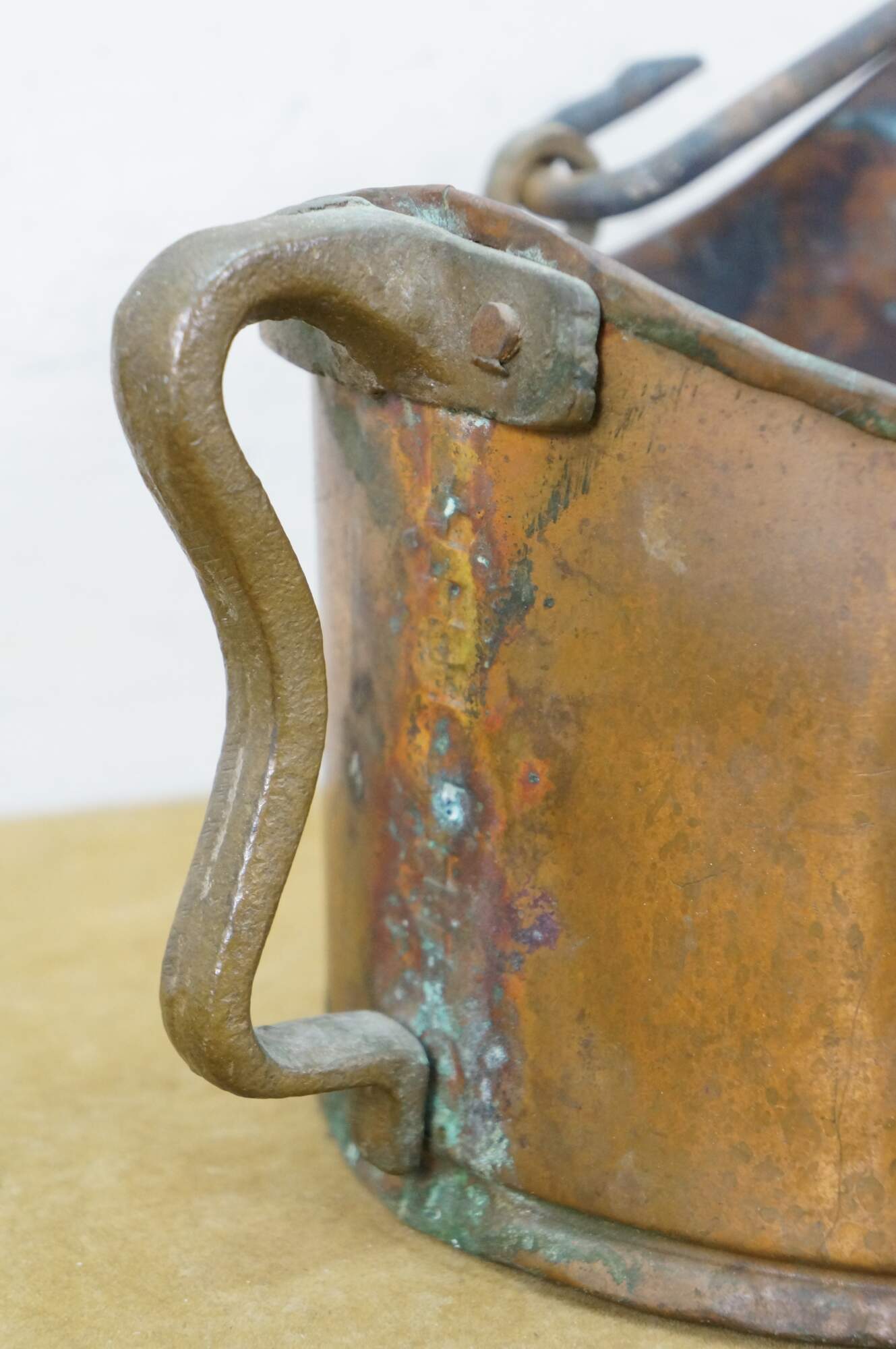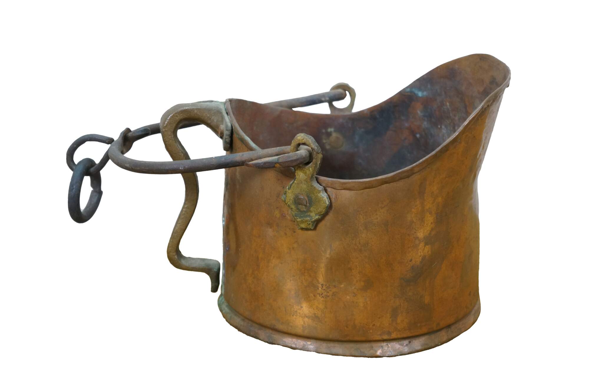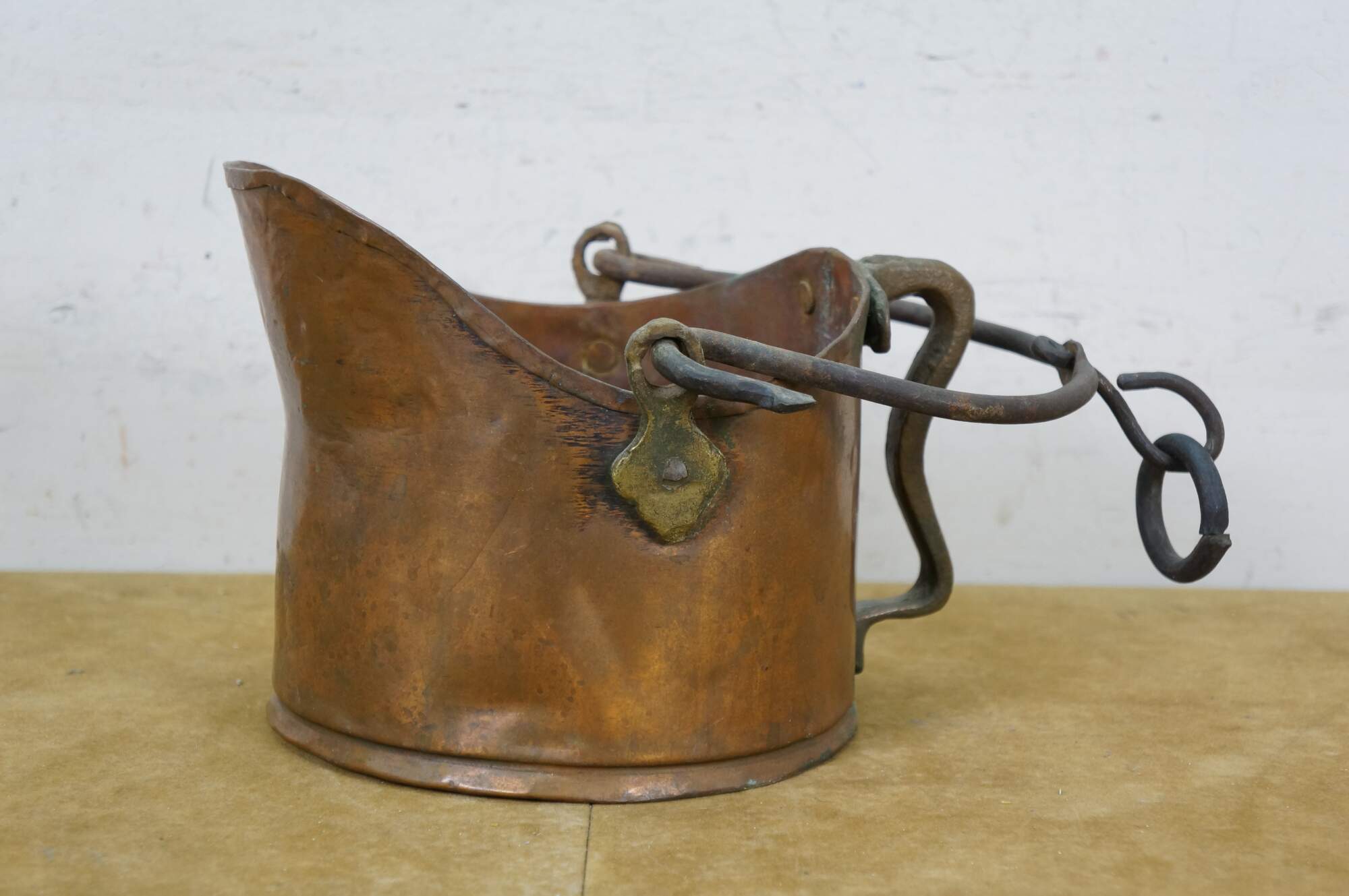 Antique dovetailed copper hanging coal scuttle / bucket with broad pour spout shaped lip, iron rattail bail handle and oxbow shaped brass handle on the back.