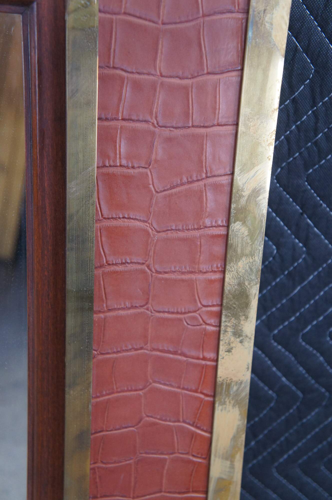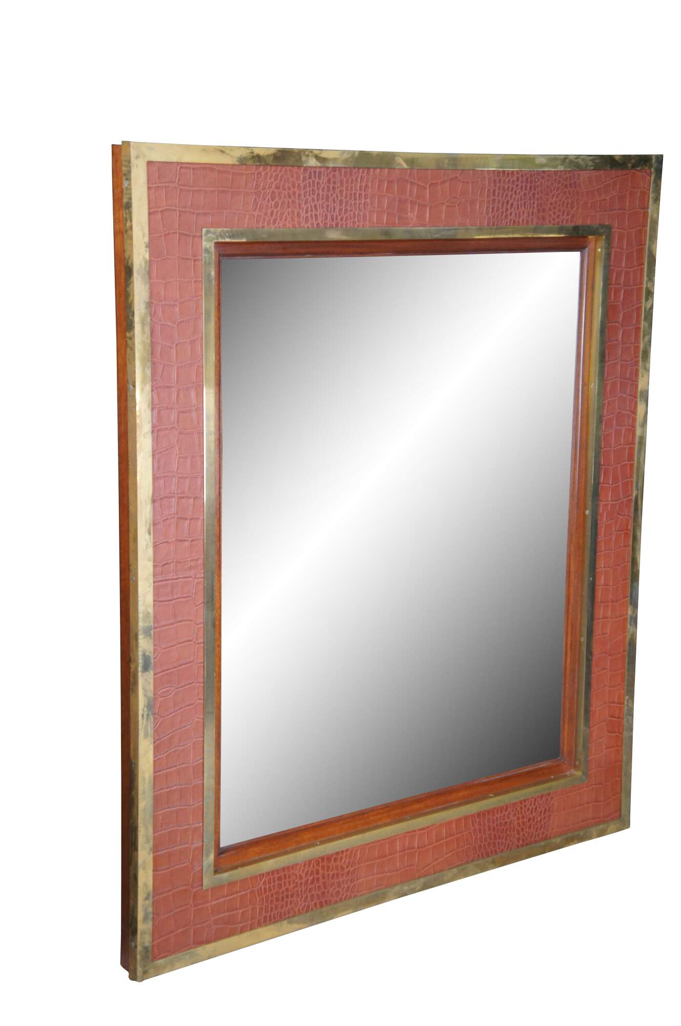 A very large and impressive Ralph Lauren / Polo mirror. Made of mahogany featuring equestrian inspired design with faux alligator / crocodile embossed leather framed in heavy brass banding. Made in the Philippines.