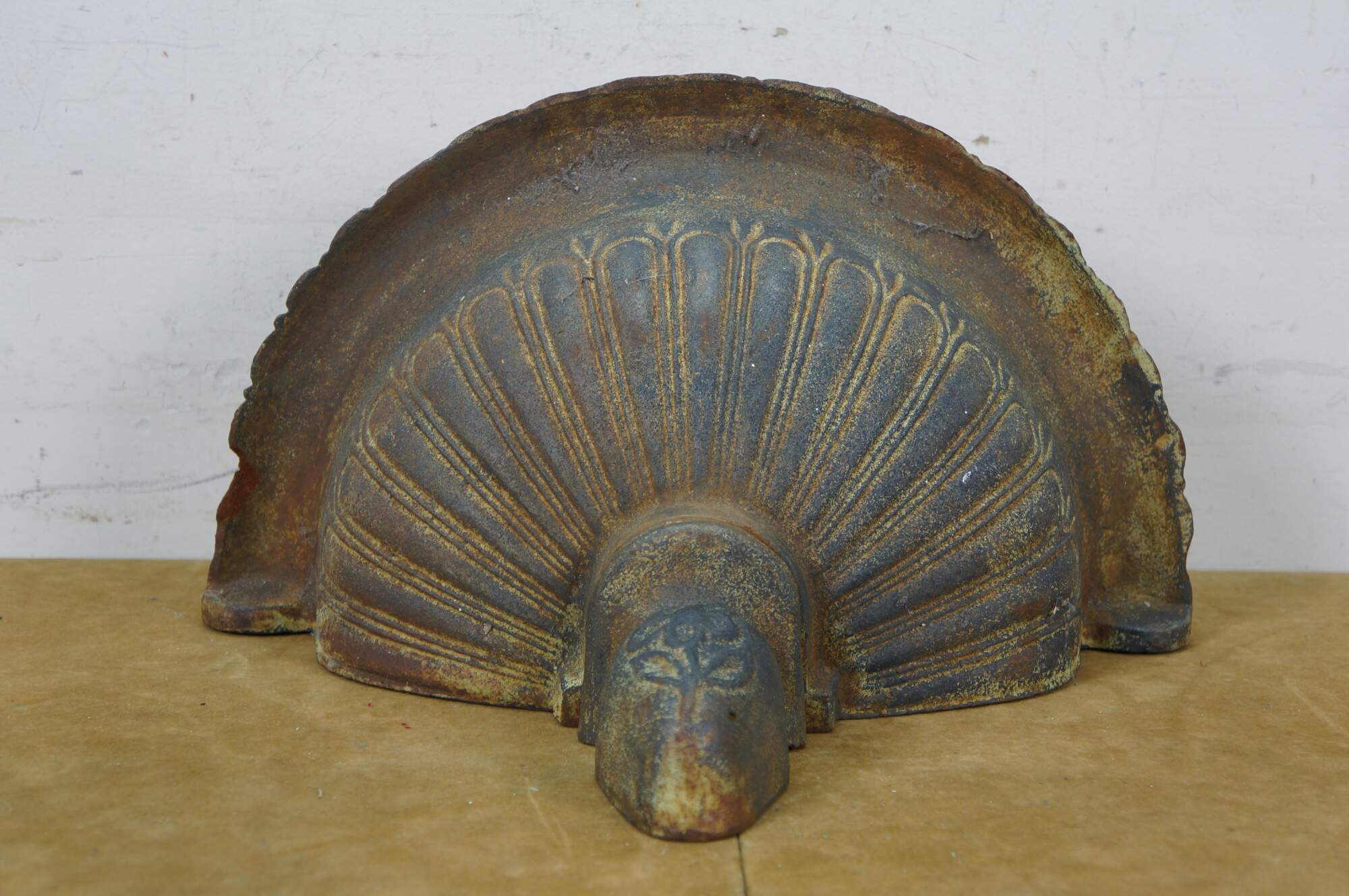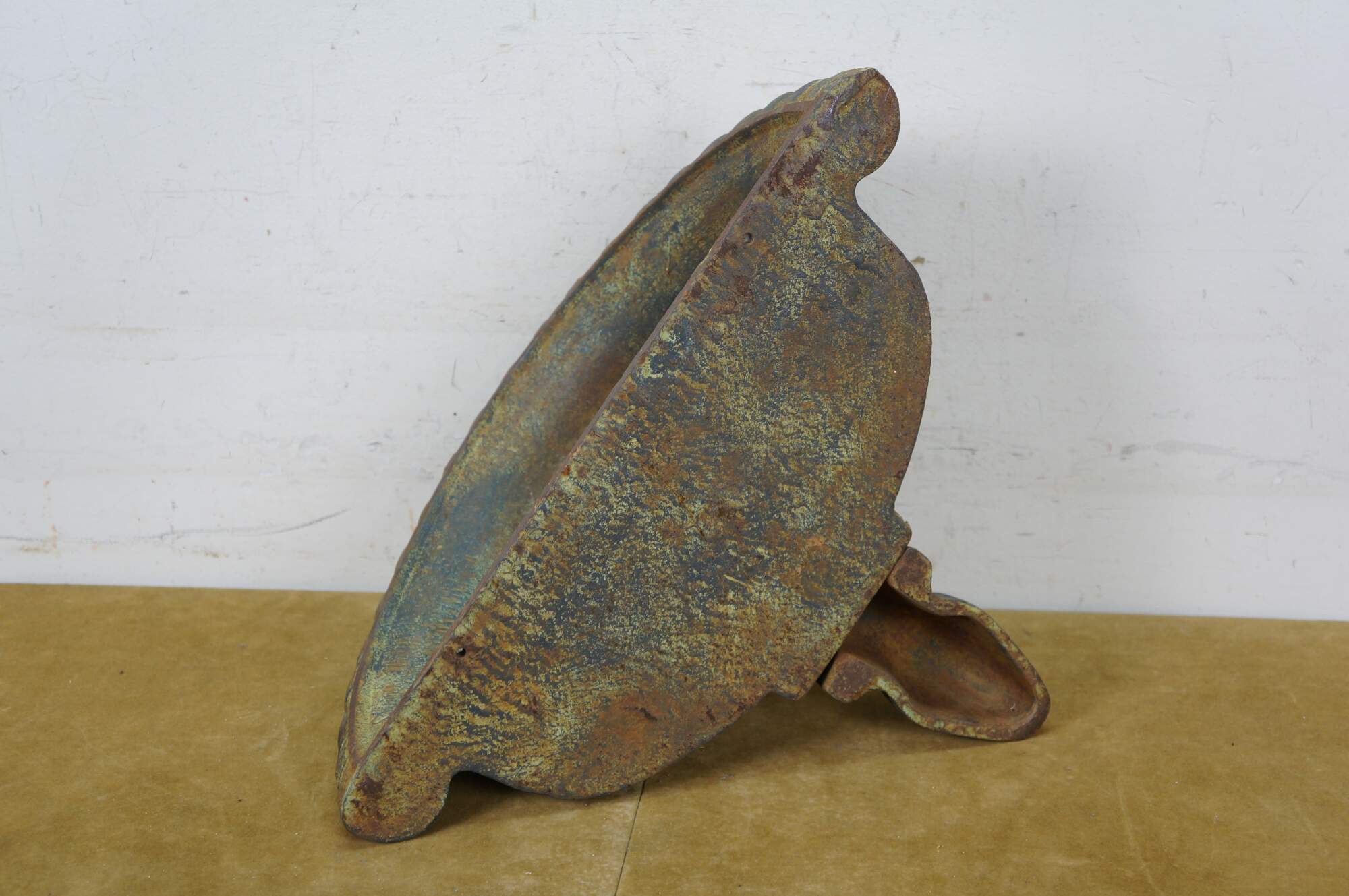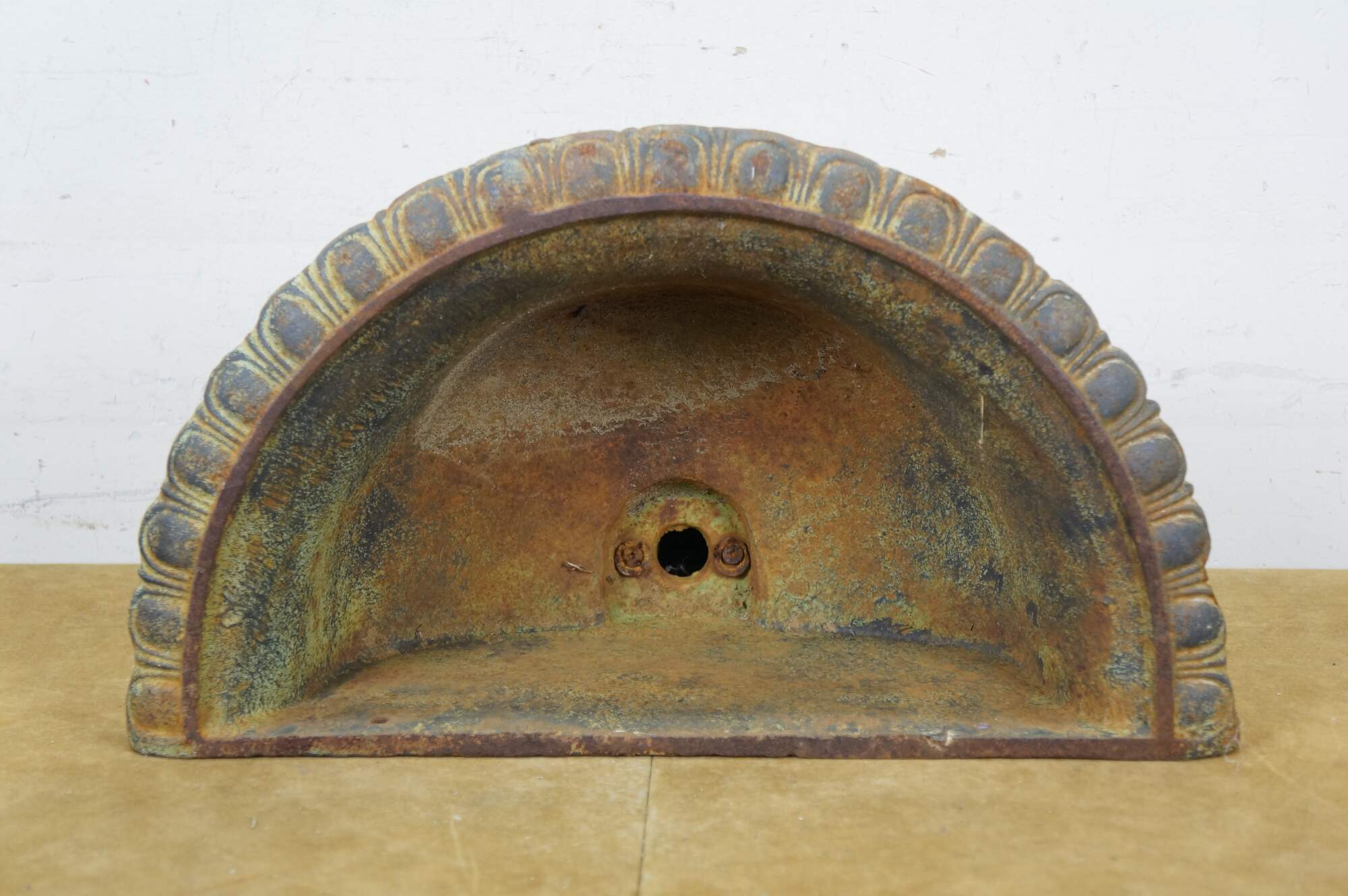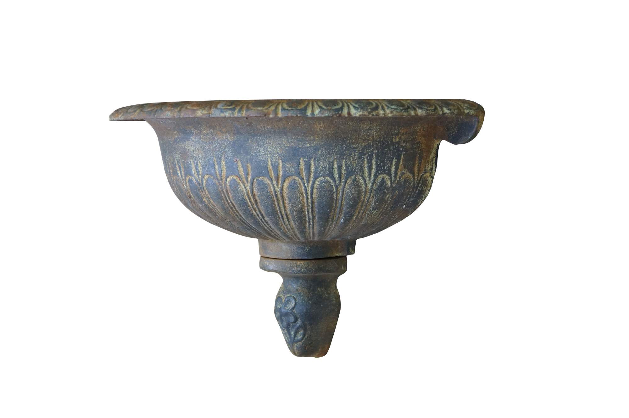 Vintage cast iron wall hanging fountain bowl / planter / garden urn. Demilune / half round shape with fluted Neoclassical styling and a flower on the drop finial.
