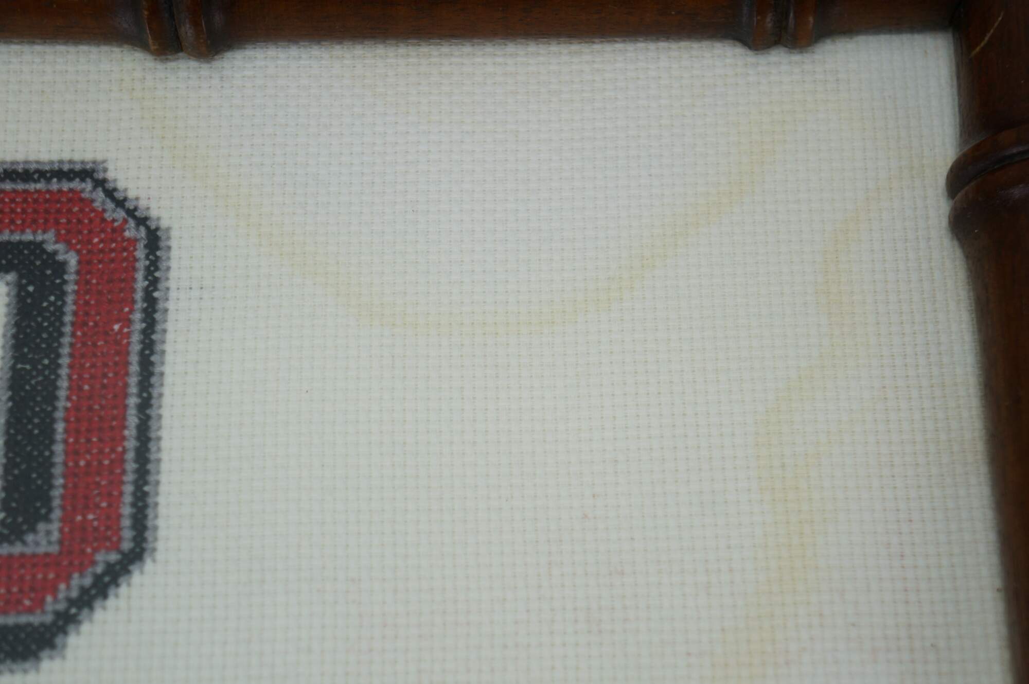 Late 20th century wooden vanity / bar tray featuring a carved faux bamboo wood frame and pair of turned brass handles. Glass topped center has an insert showing a cross stitch design of The Ohio State University logo and buckeye leaves.