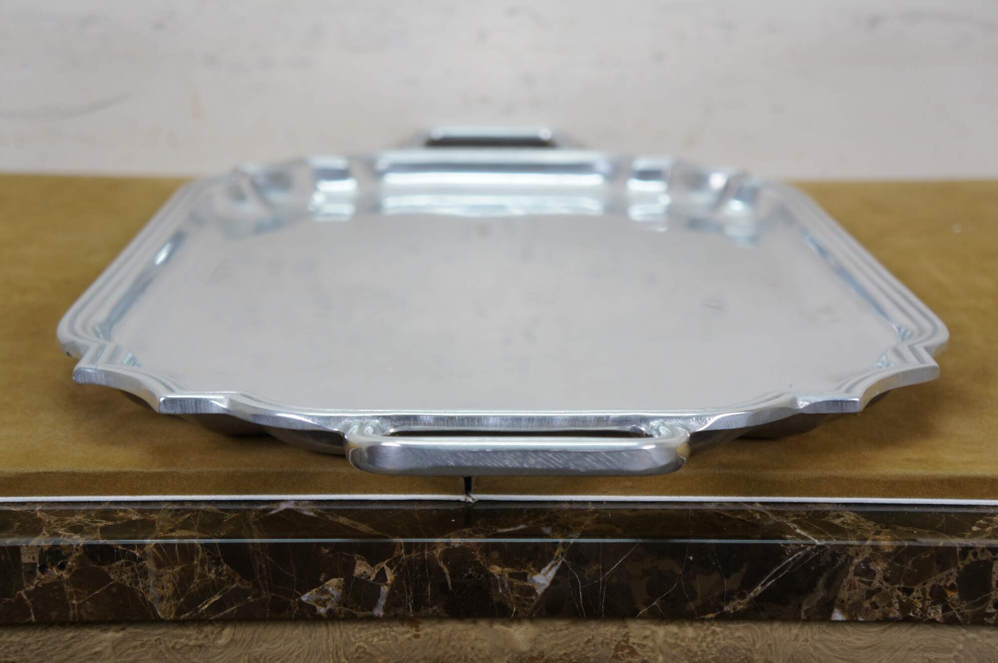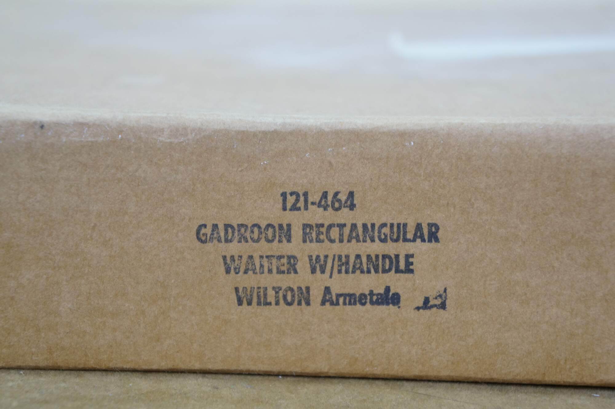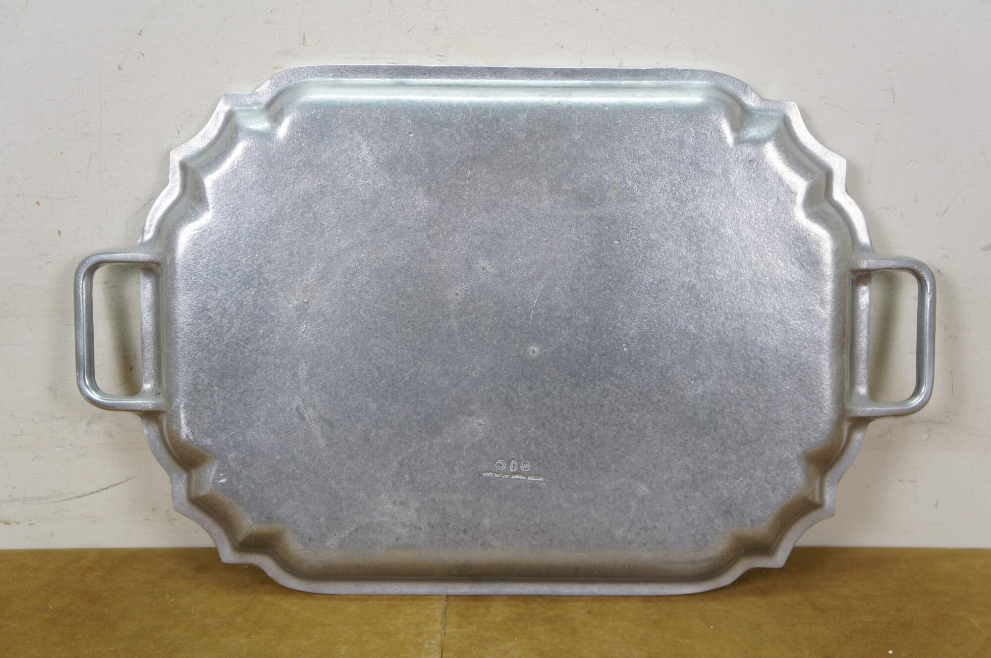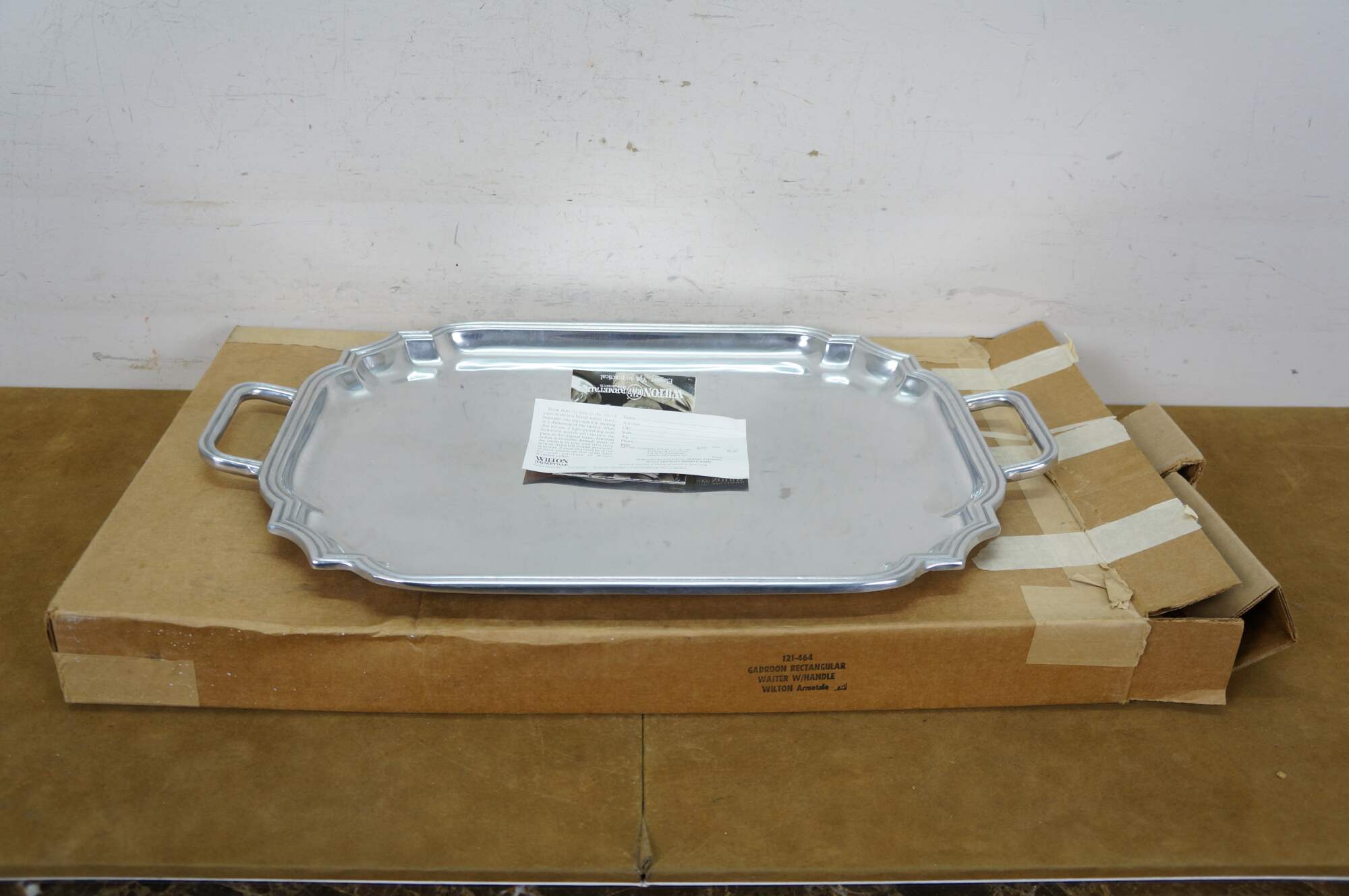 Vintage Wilton Armetale pewter holloware rectangular waiter / serving / tea tray, number 121-464, with scalloped cut corners, two handles, and gadroon edging. Includes original box & insert. Discontinued. Produced between 2001-2010.