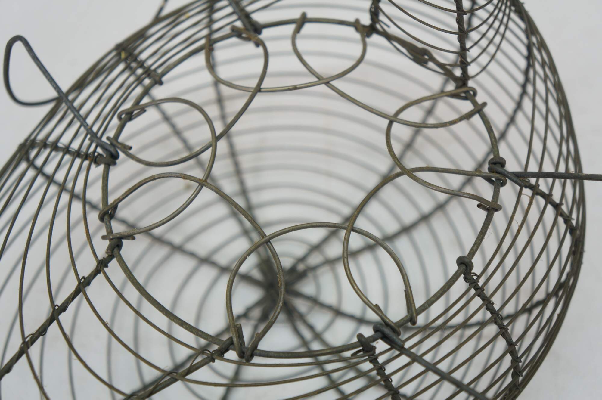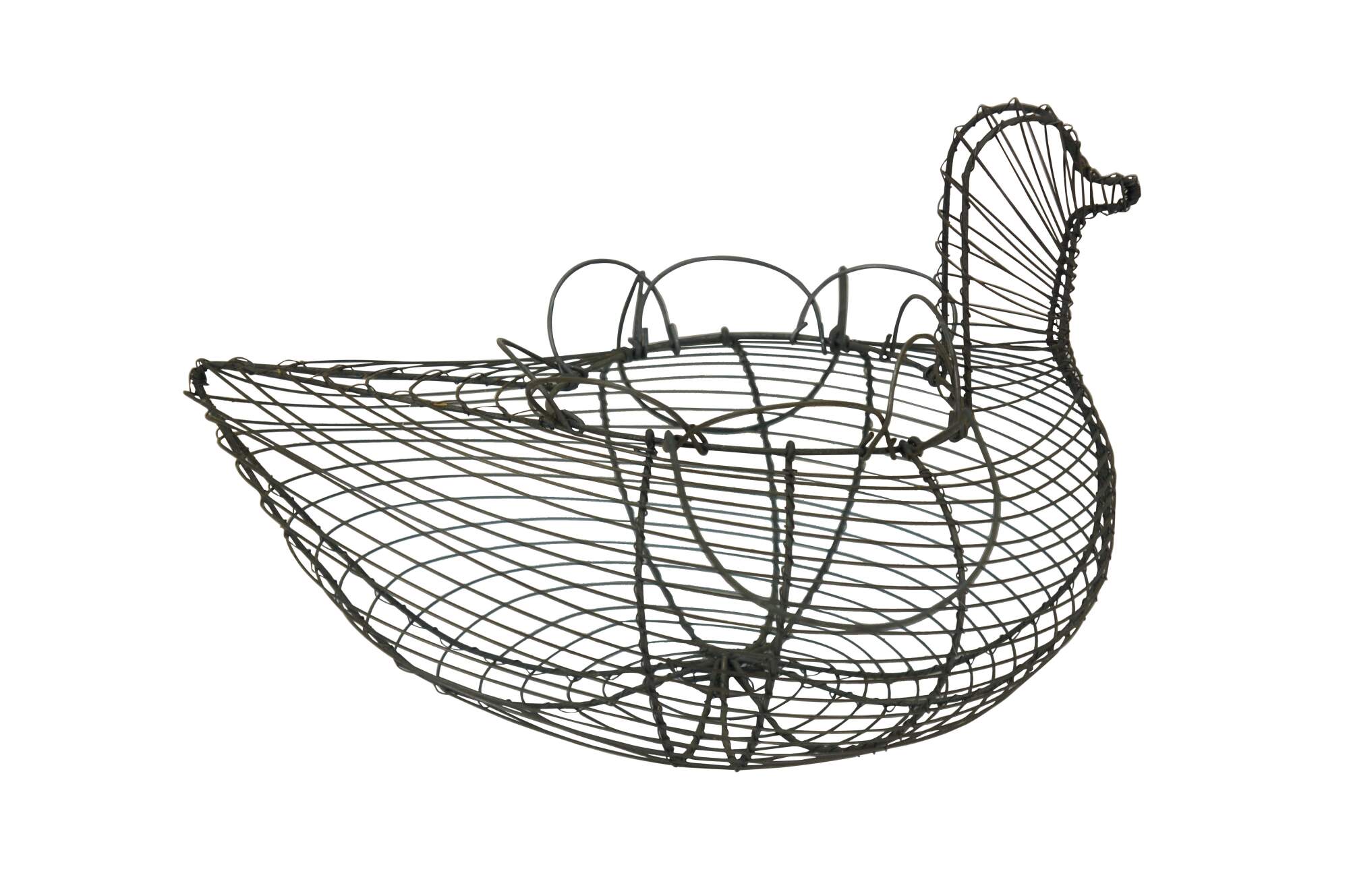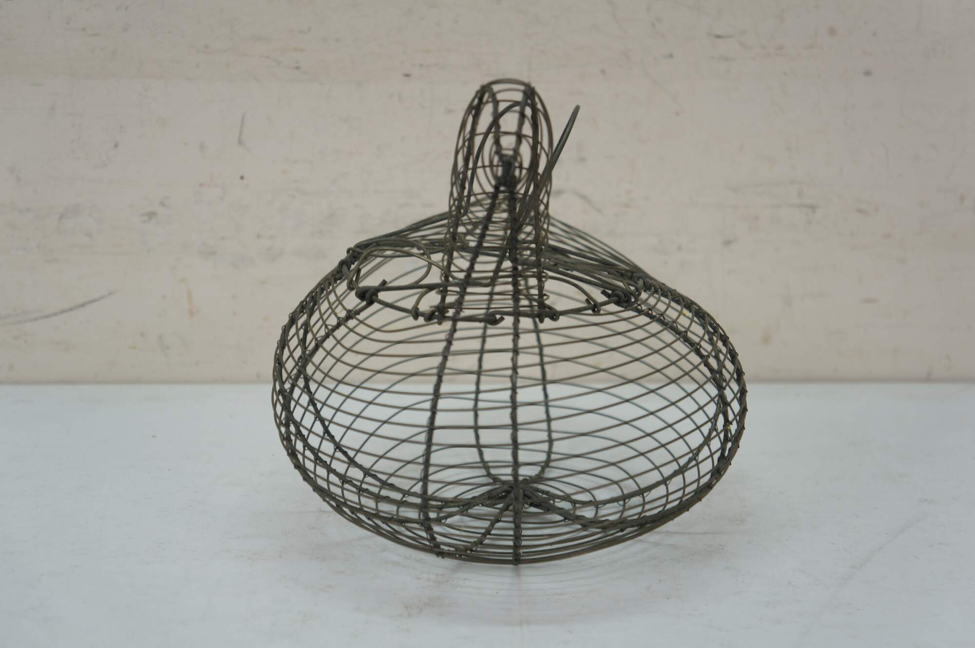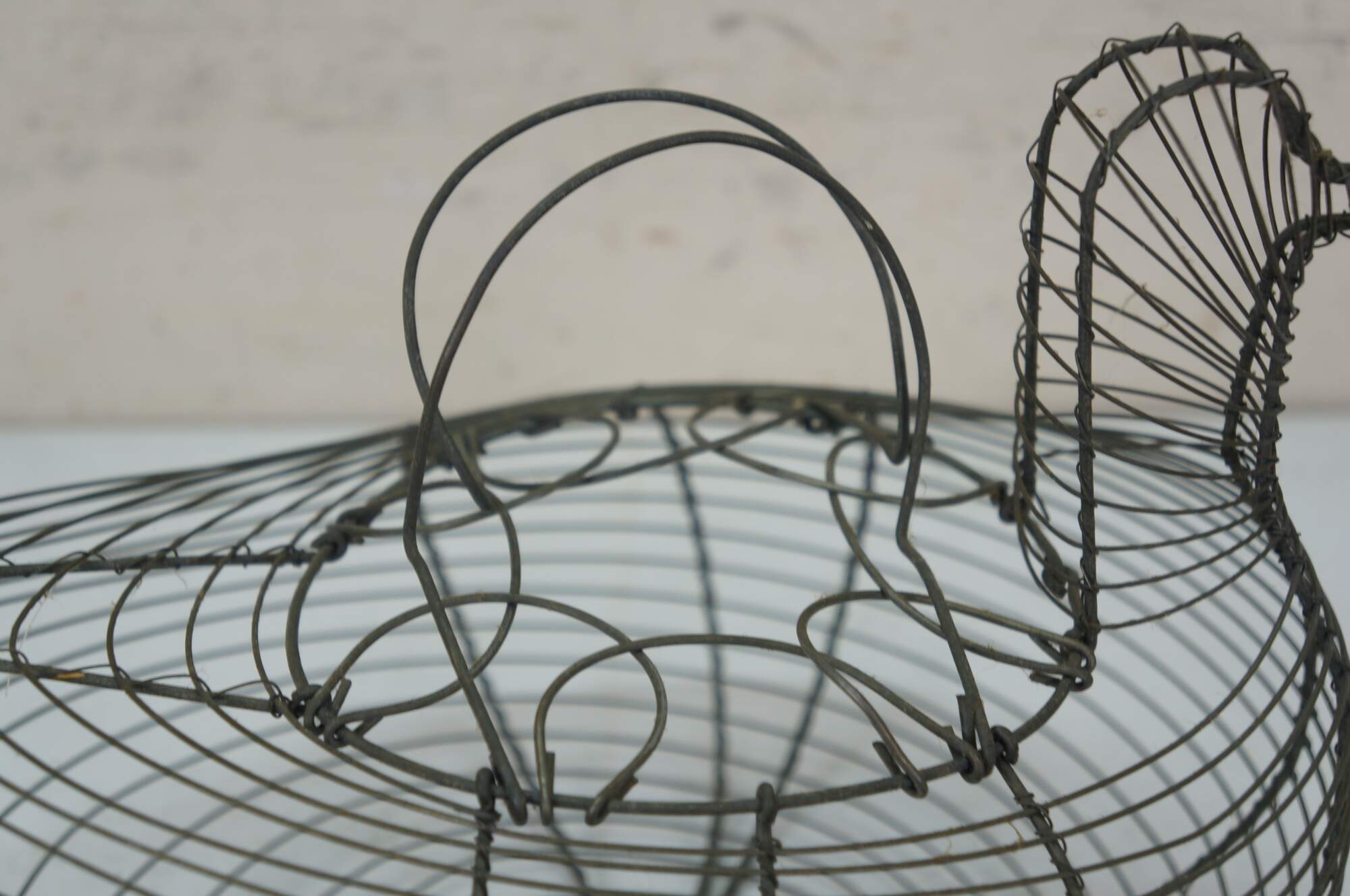 Vintage 20th century wire egg gathering basket in the shape of a hen / chicken with two arched handles and scalloped loop closure over the opening.