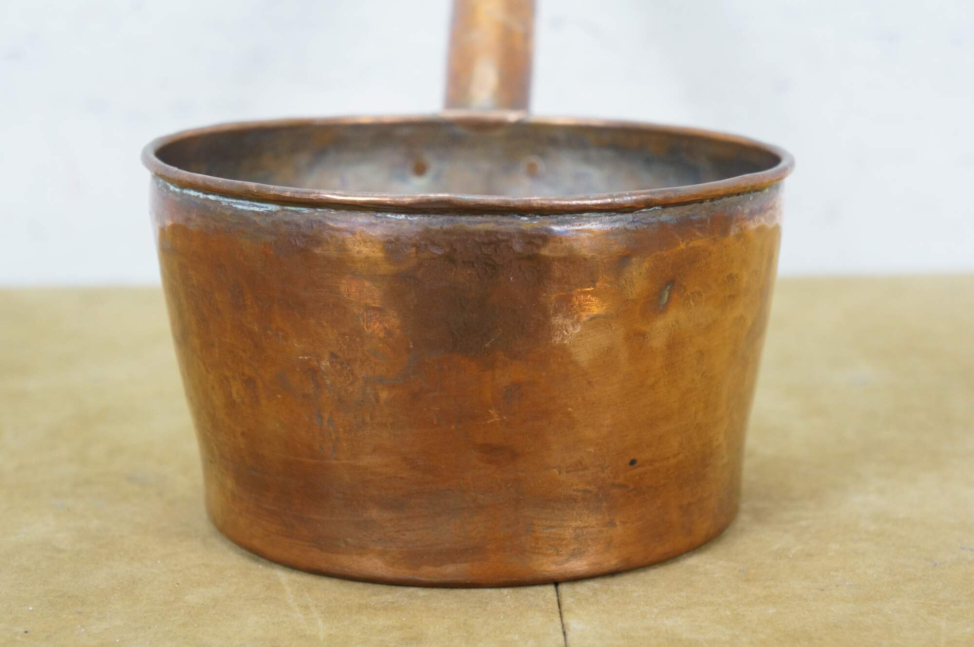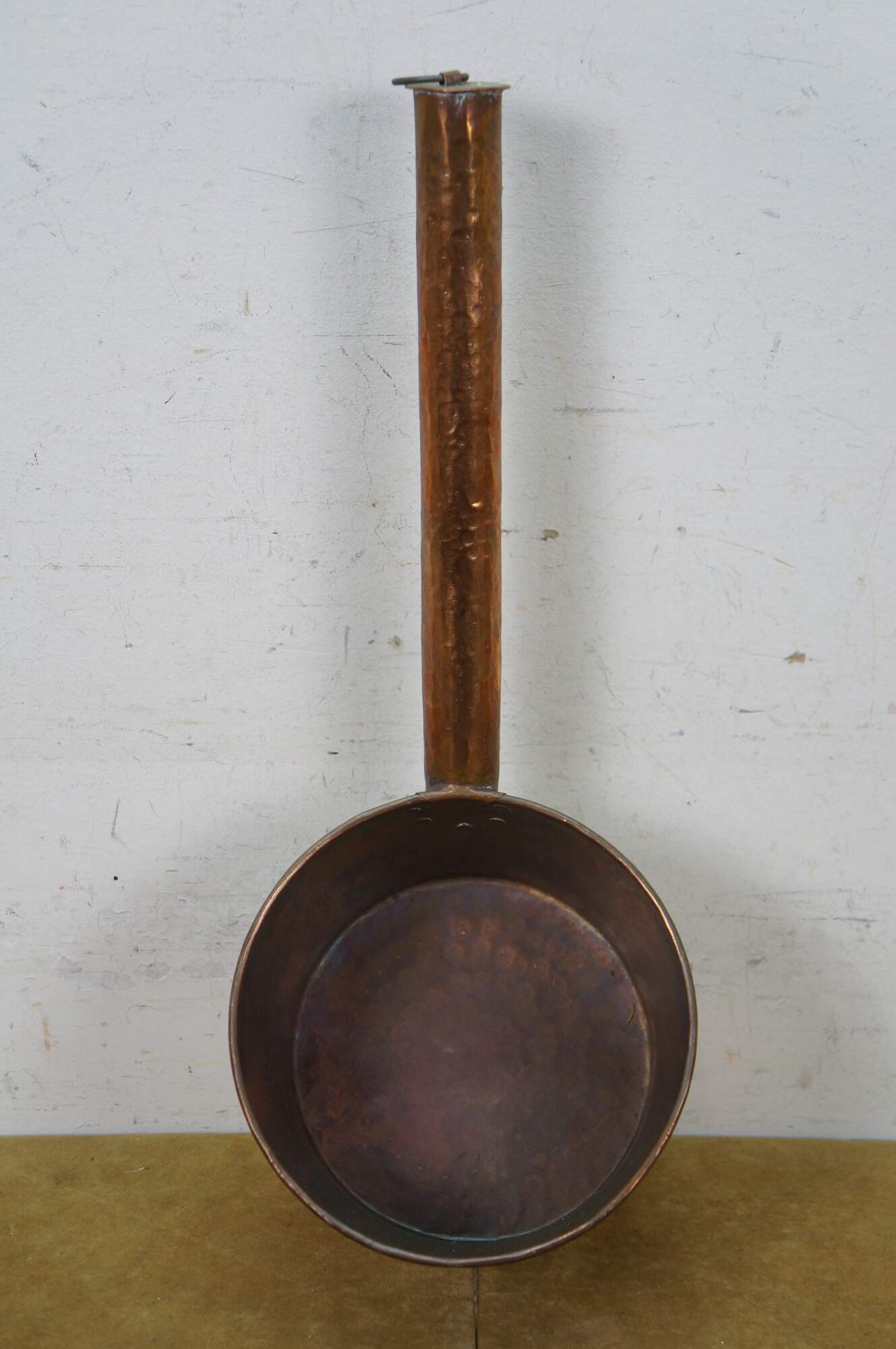 Antique French hammered copper sauce pan with long, hollow, dovetailed handle, capped with brass and a hanging ring.
