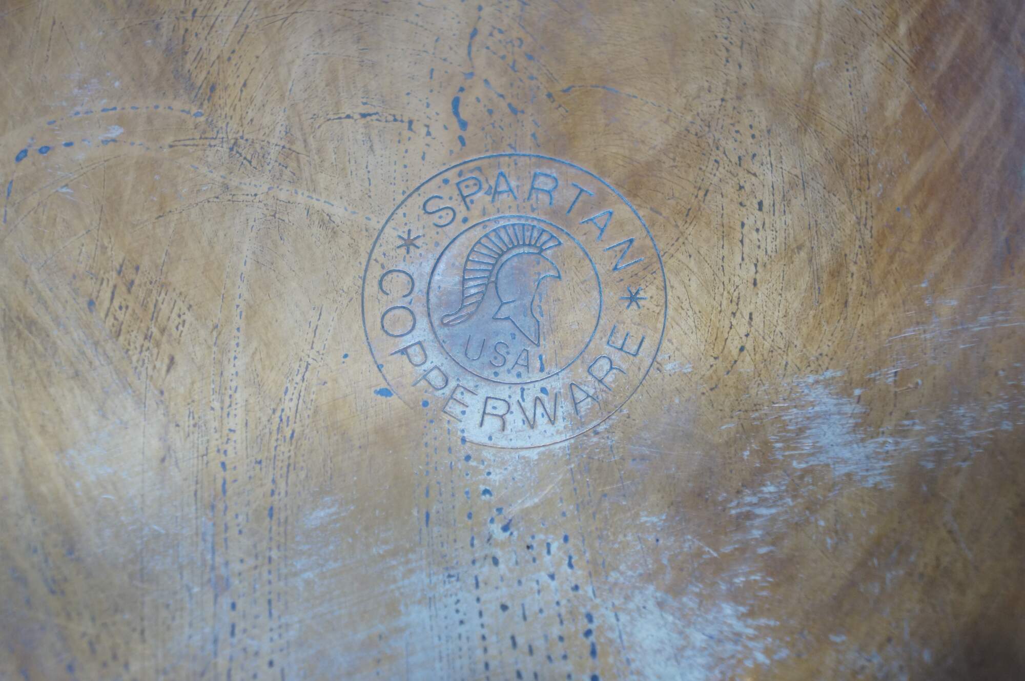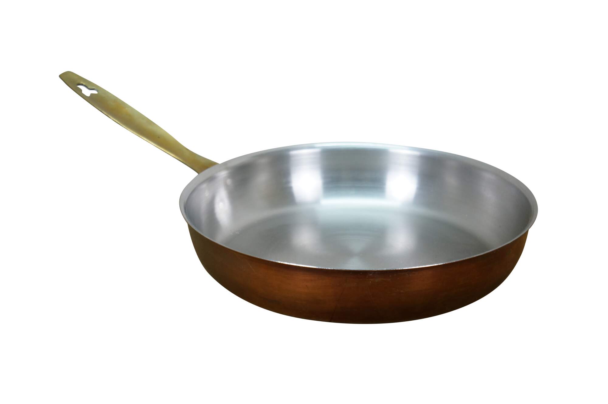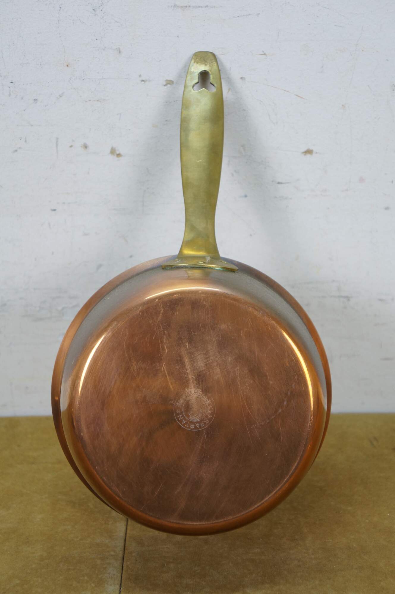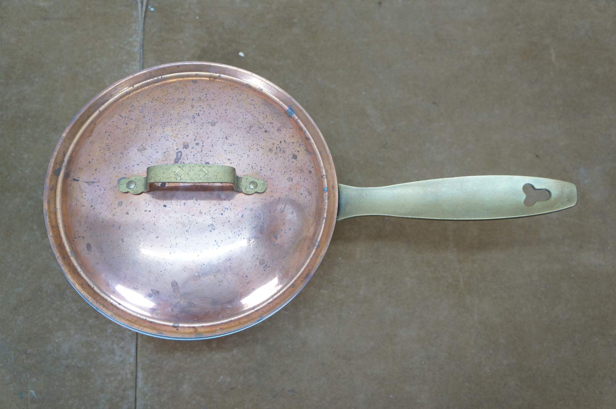 Pair of late 20th century copper pans by Spartan Copperware. Includes one saute / frying pan and one sauce pan with lid. Brass handles.