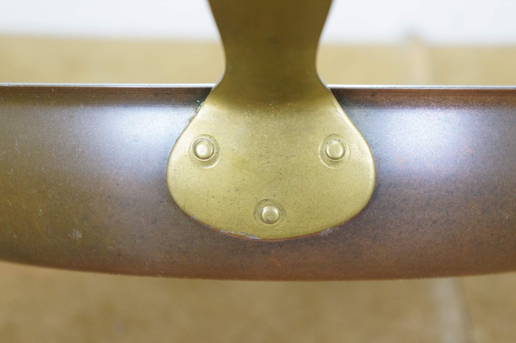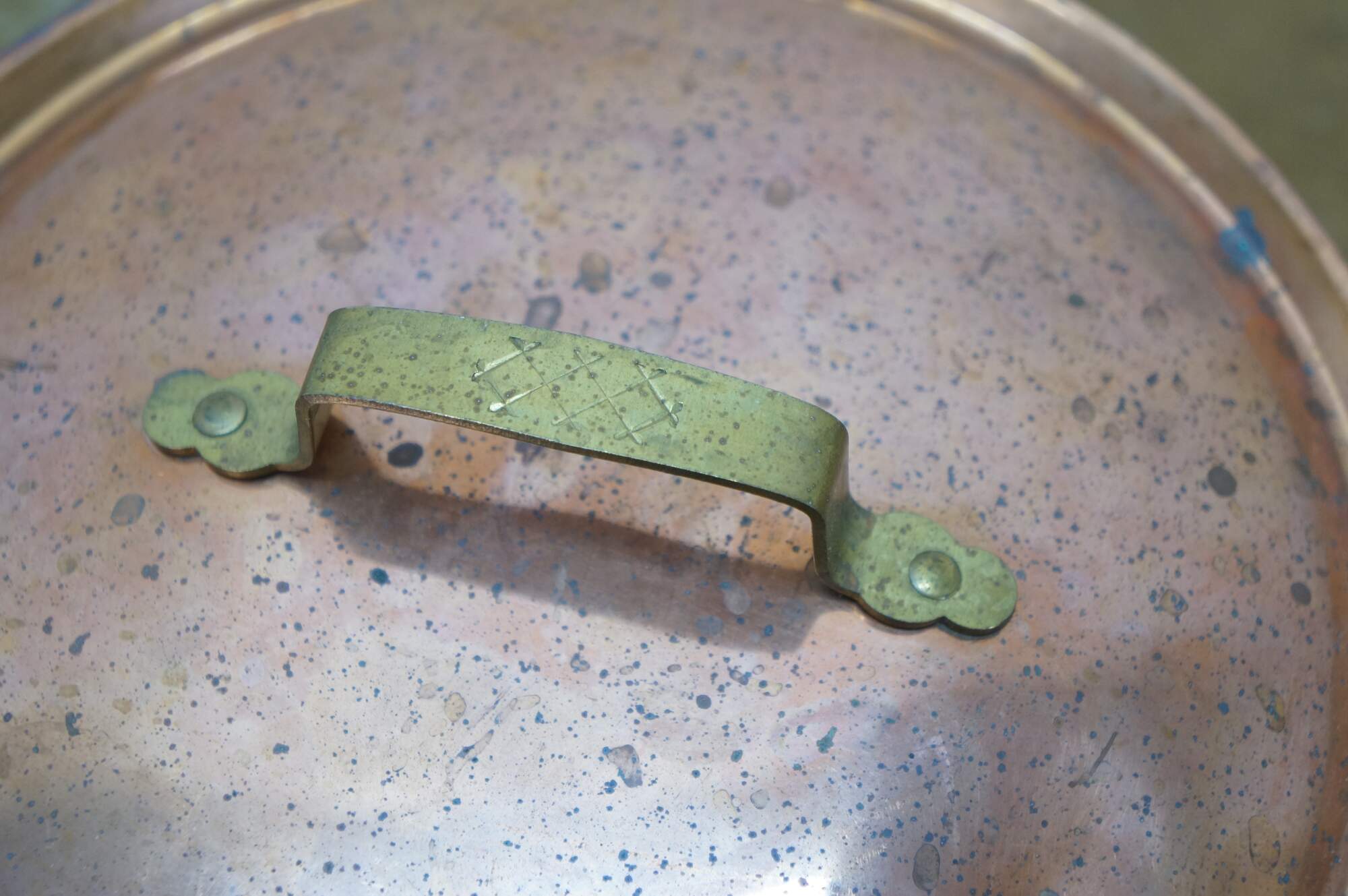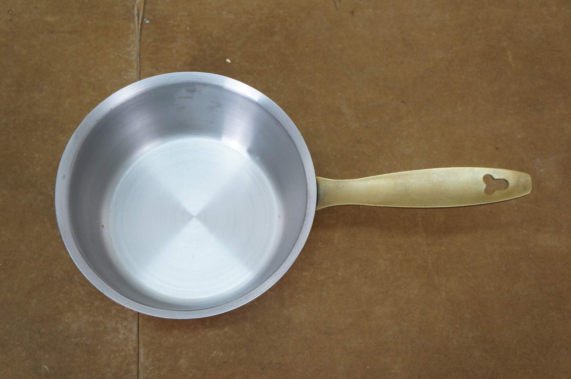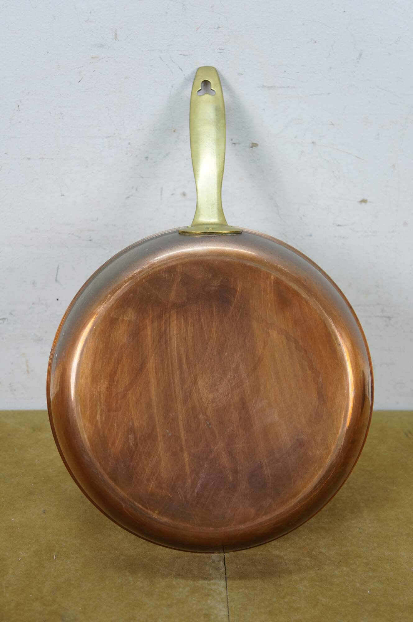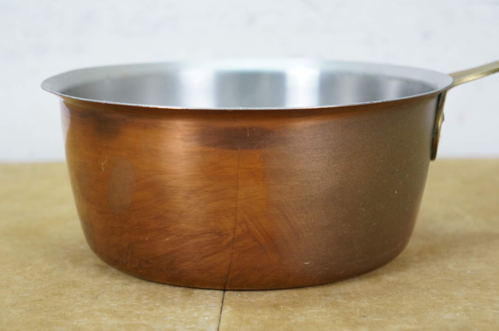 Pair of late 20th century copper pans by Spartan Copperware. Includes one saute / frying pan and one sauce pan with lid. Brass handles.