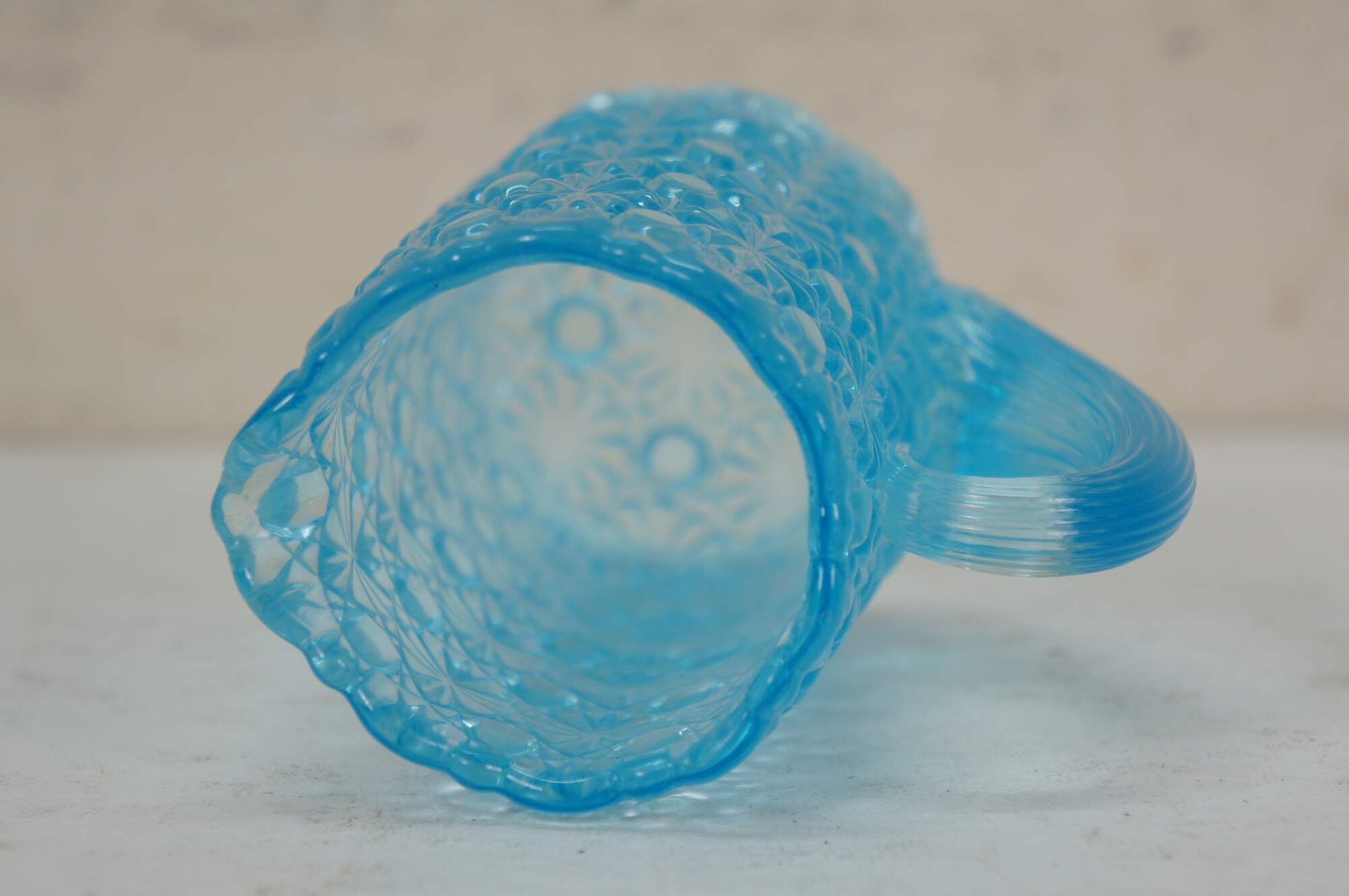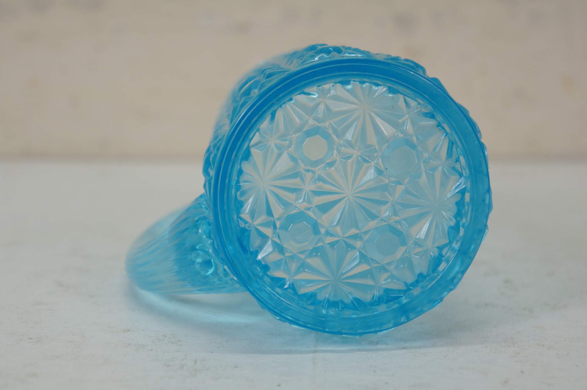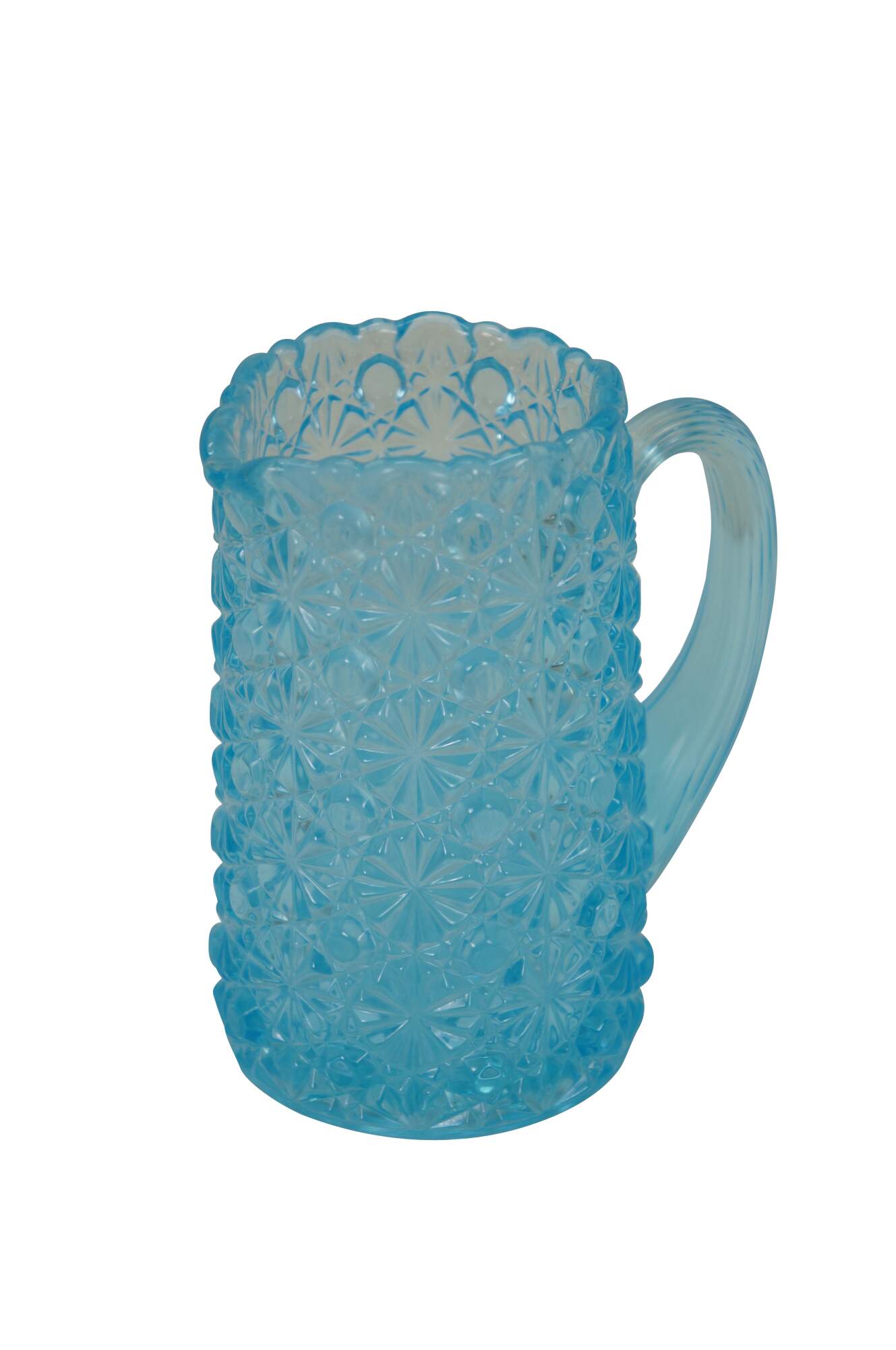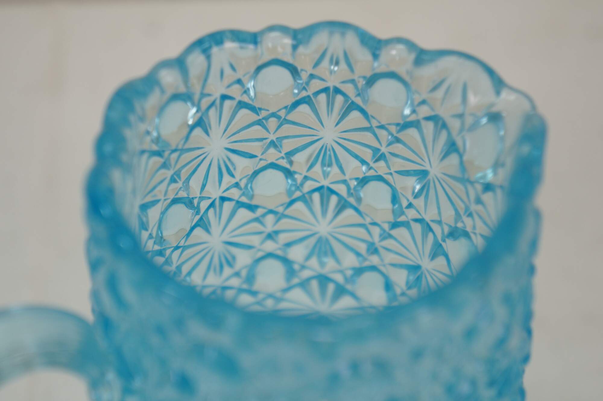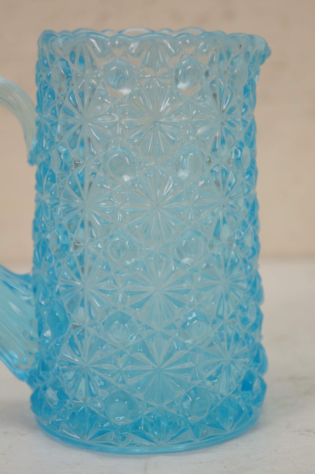 Early 20th century pressed glass cream pitcher - light blue glass pressed throughout with a daisy and button pattern and grooved handle. Attributed to Fenton.