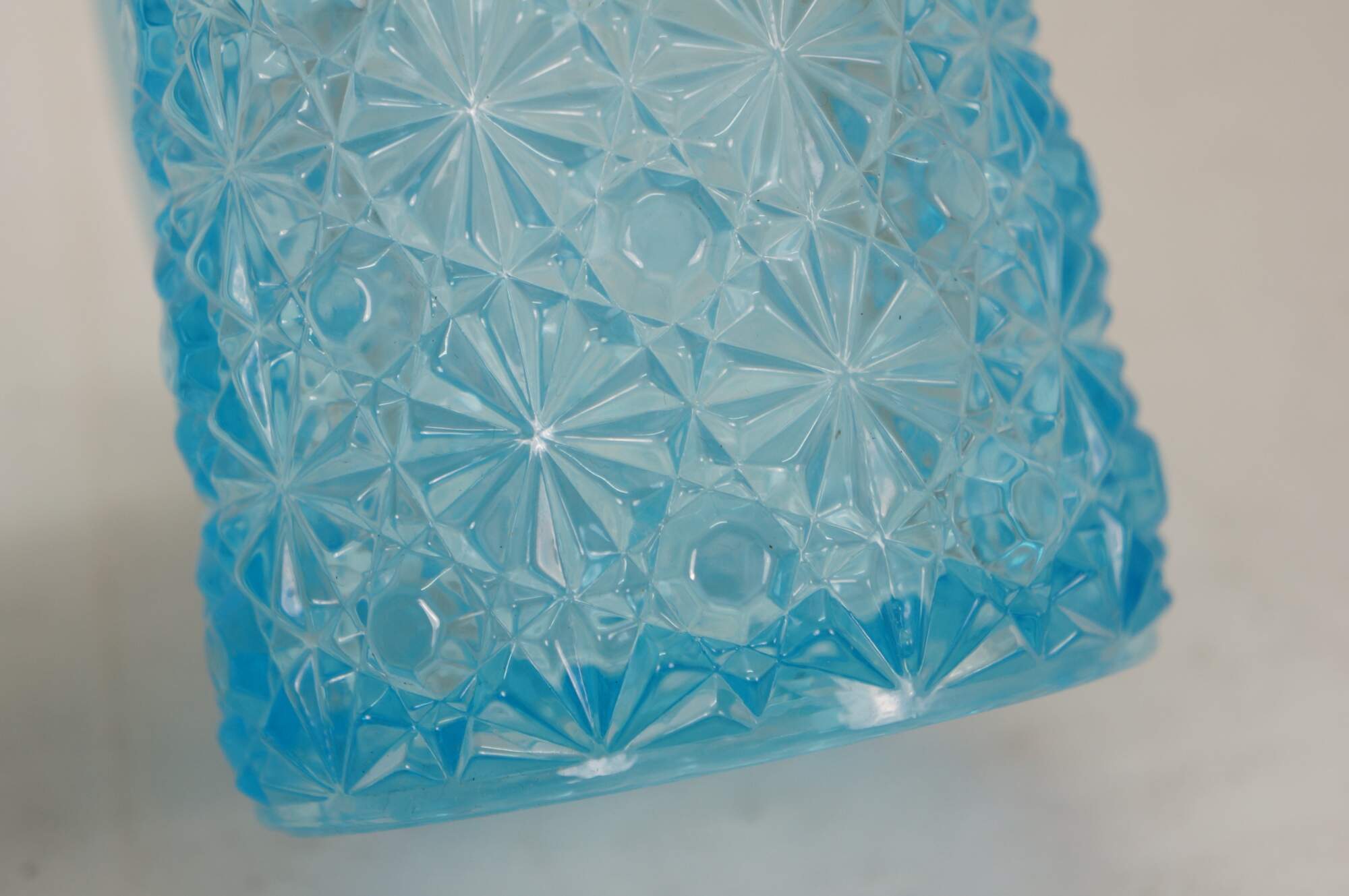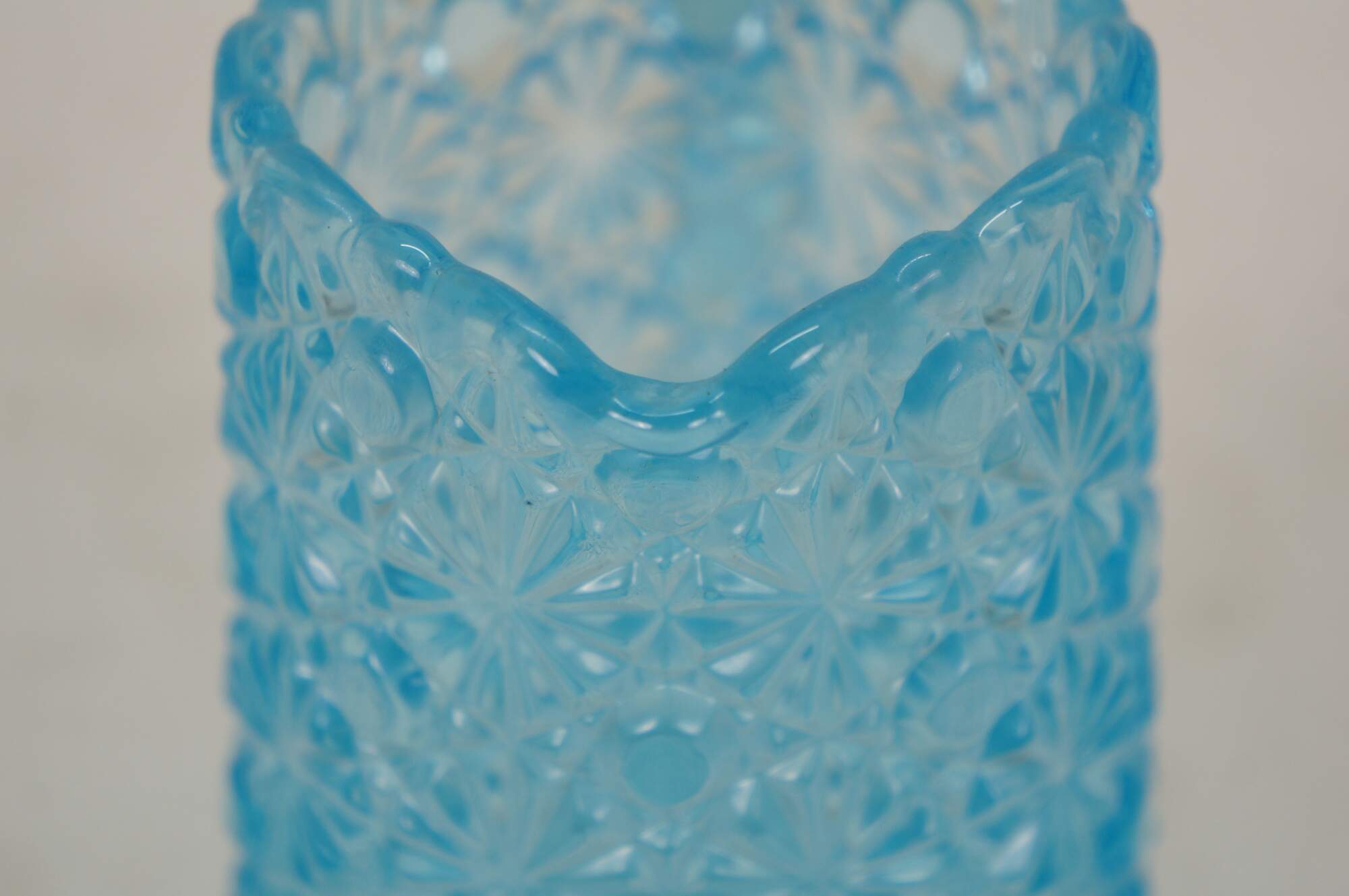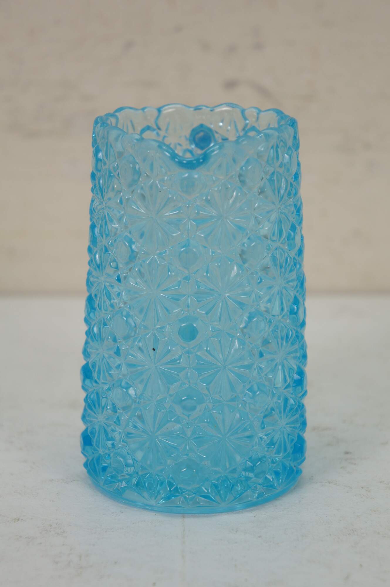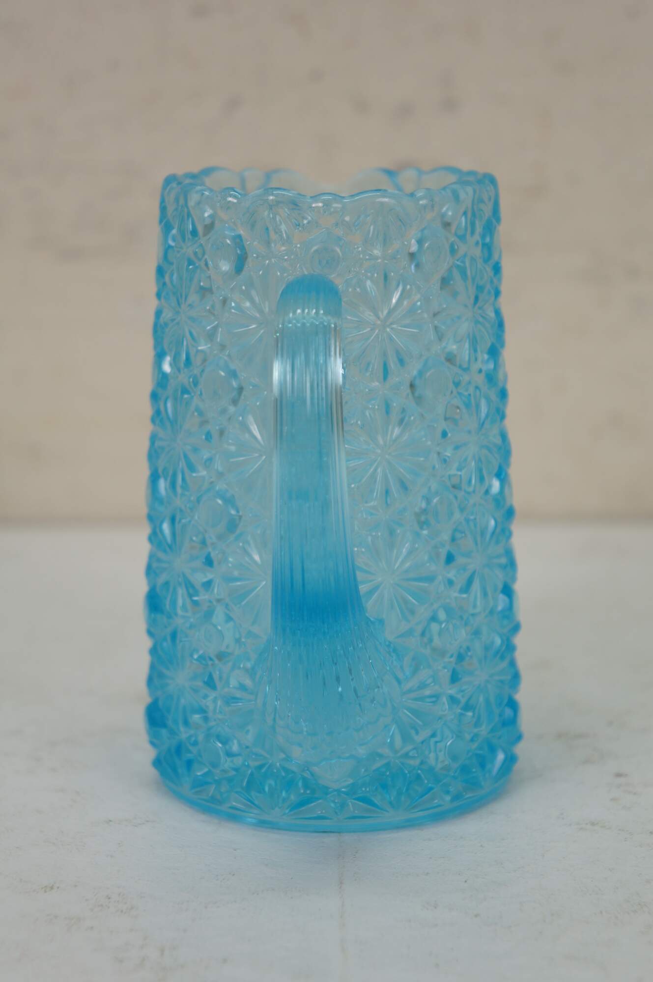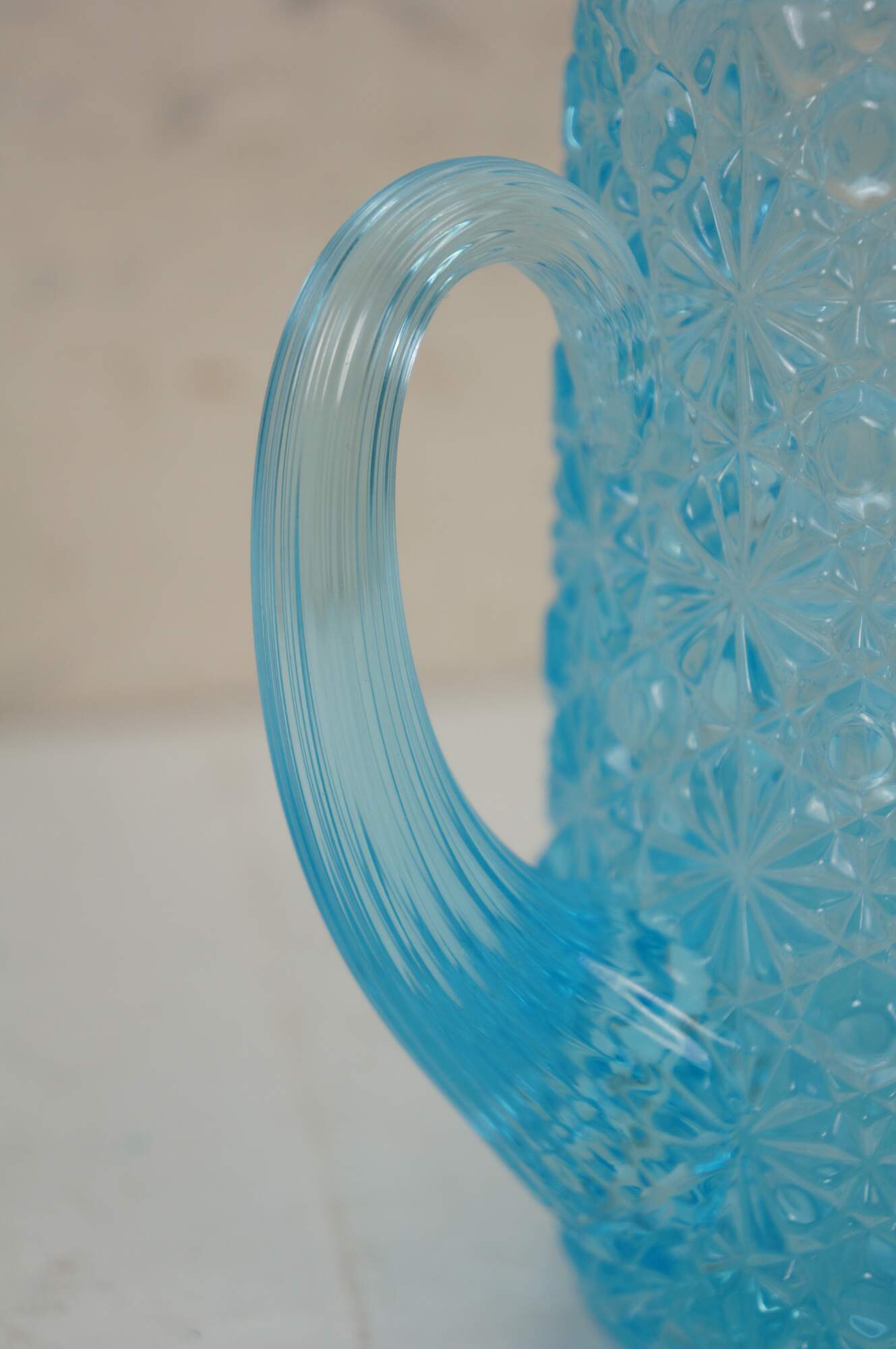 Early 20th century pressed glass cream pitcher - light blue glass pressed throughout with a daisy and button pattern and grooved handle. Attributed to Fenton.