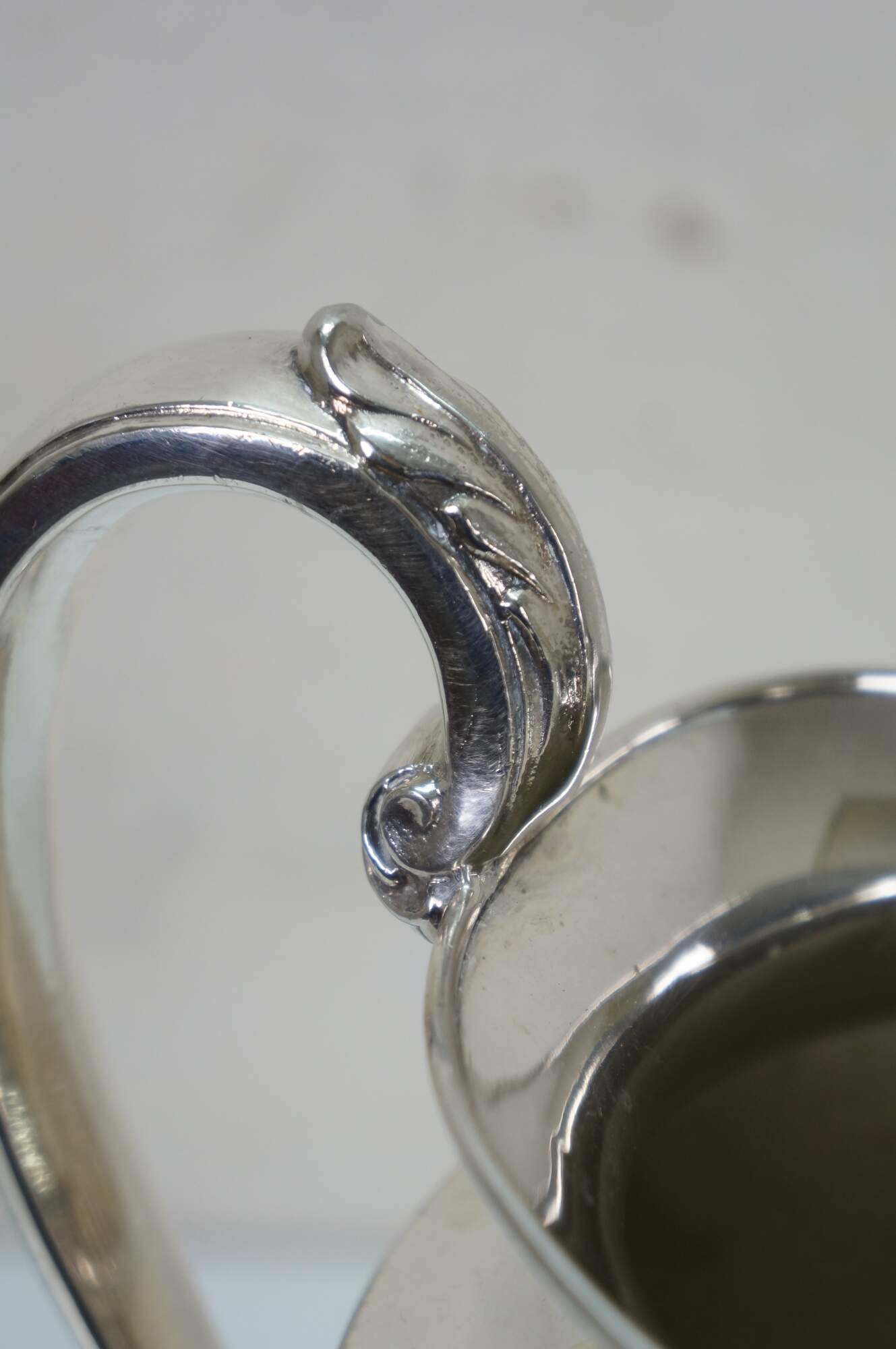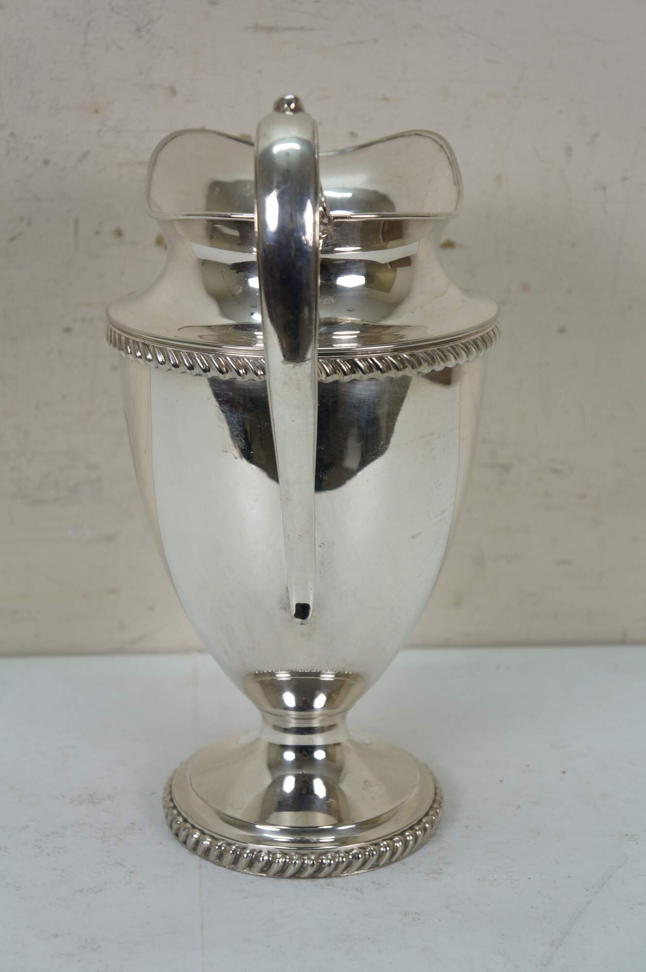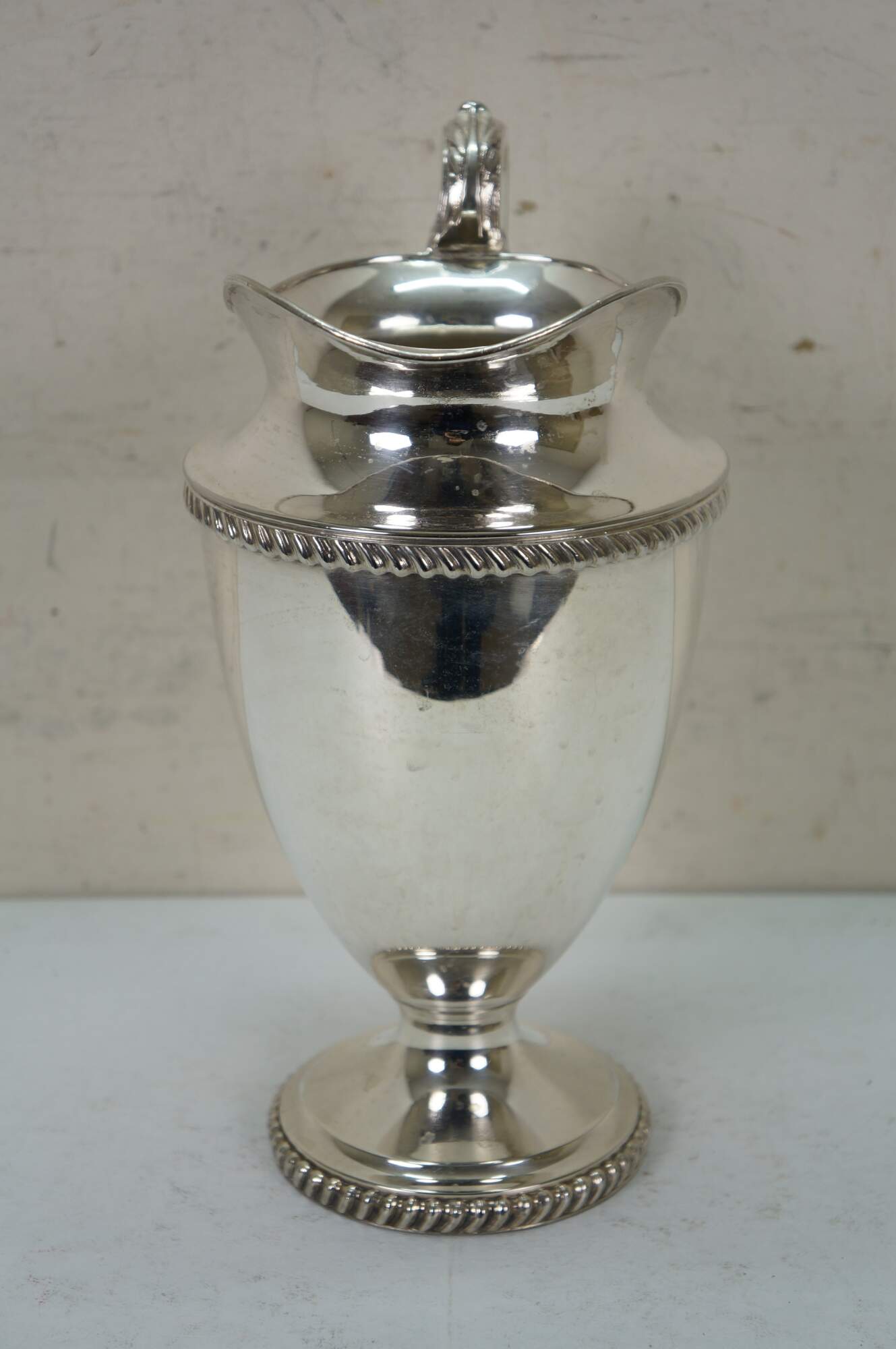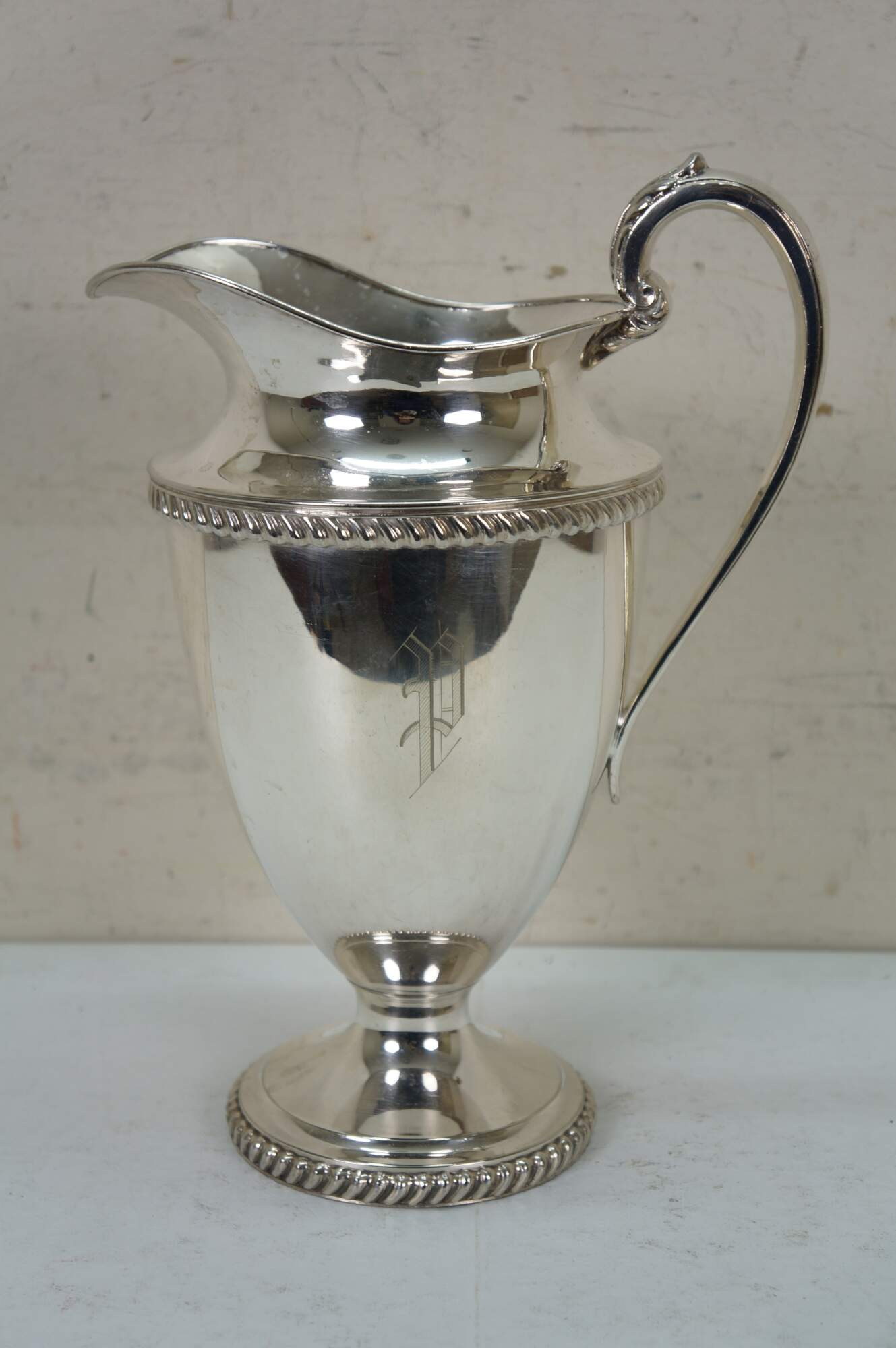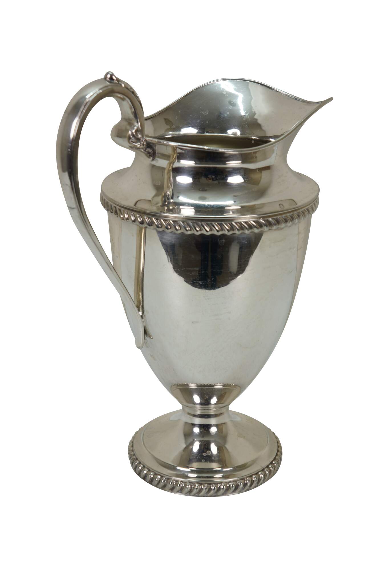 Mid 20th century Friedman Silver Company number 3153 silverplated water pitcher / jug. 5 Pint Capacity. Neoclassical trophy urn shape with rope twist accents and leaf on the handle. Monogrammed with the initial P.