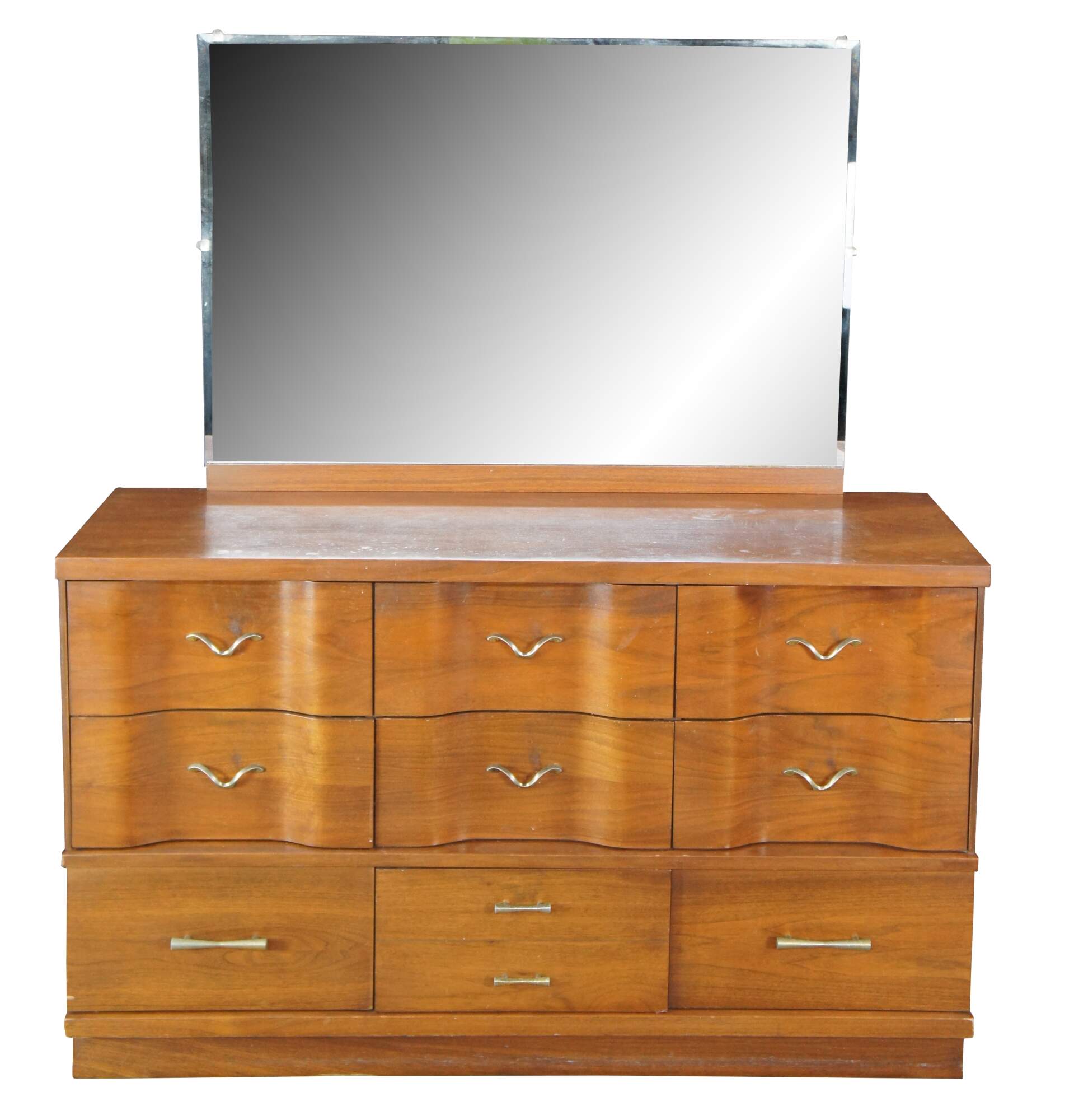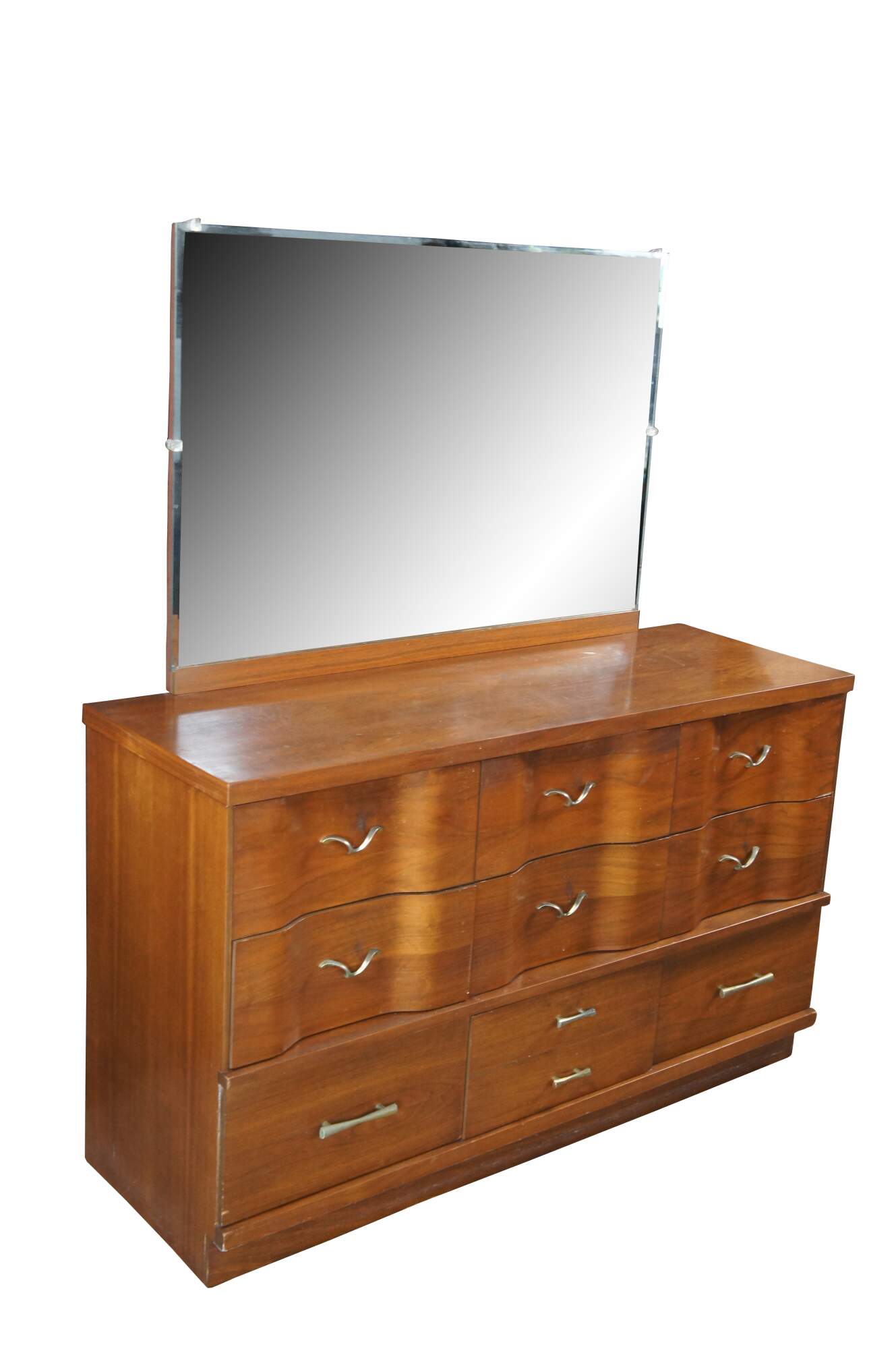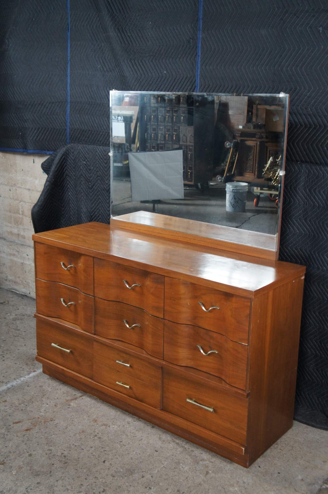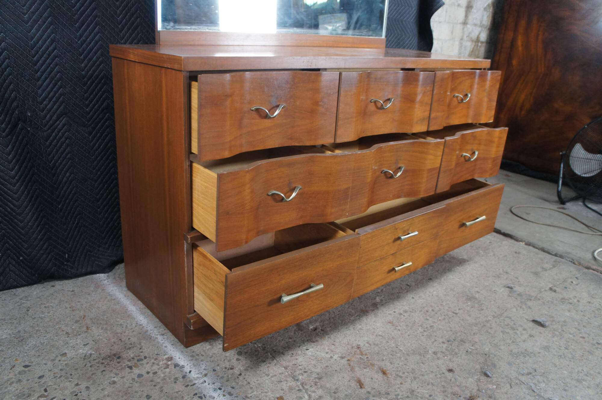 Mid century modern vanity dresser. Made of walnut featuring 9 serpentine drawers and a rectangular mirror.