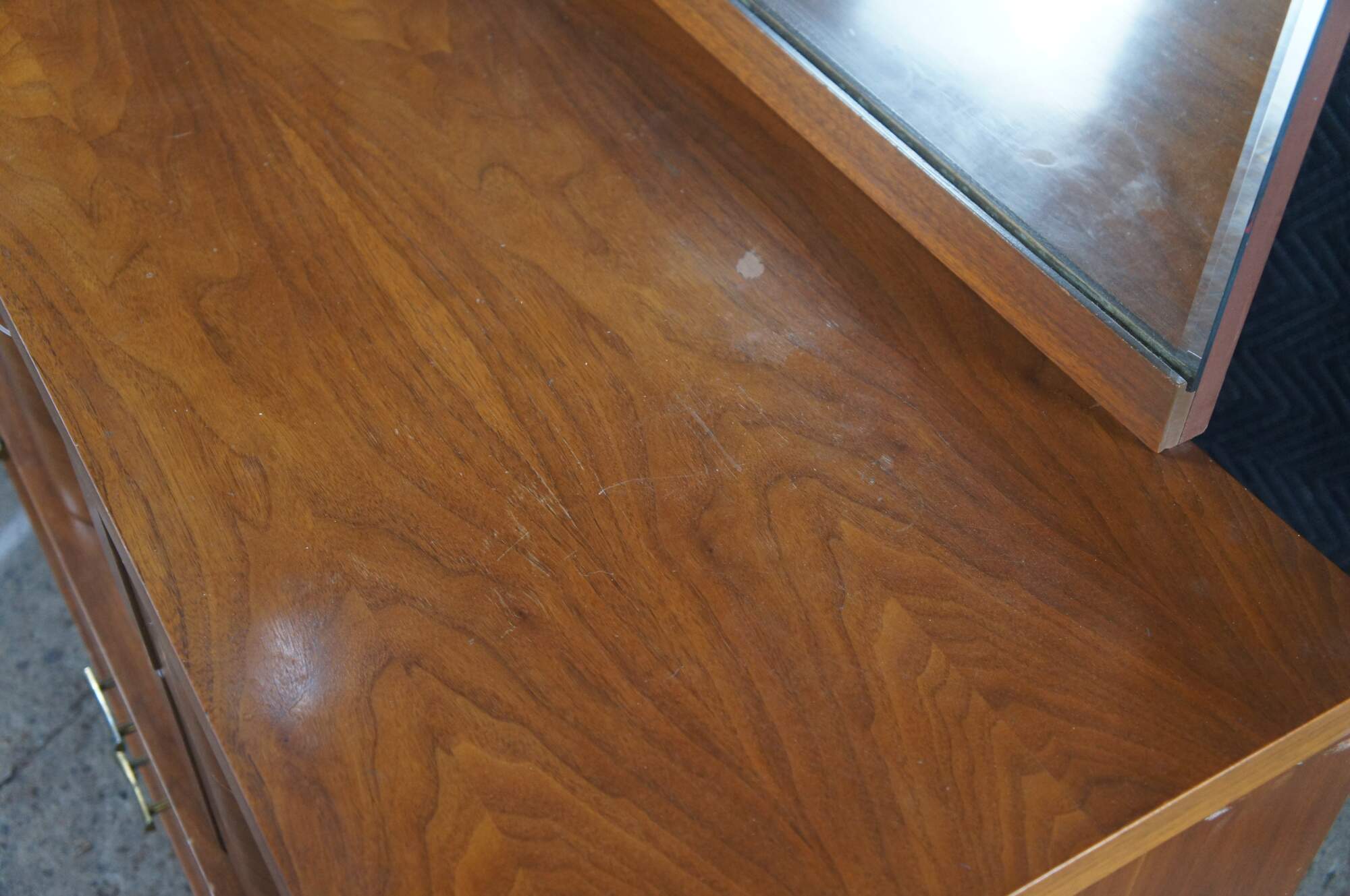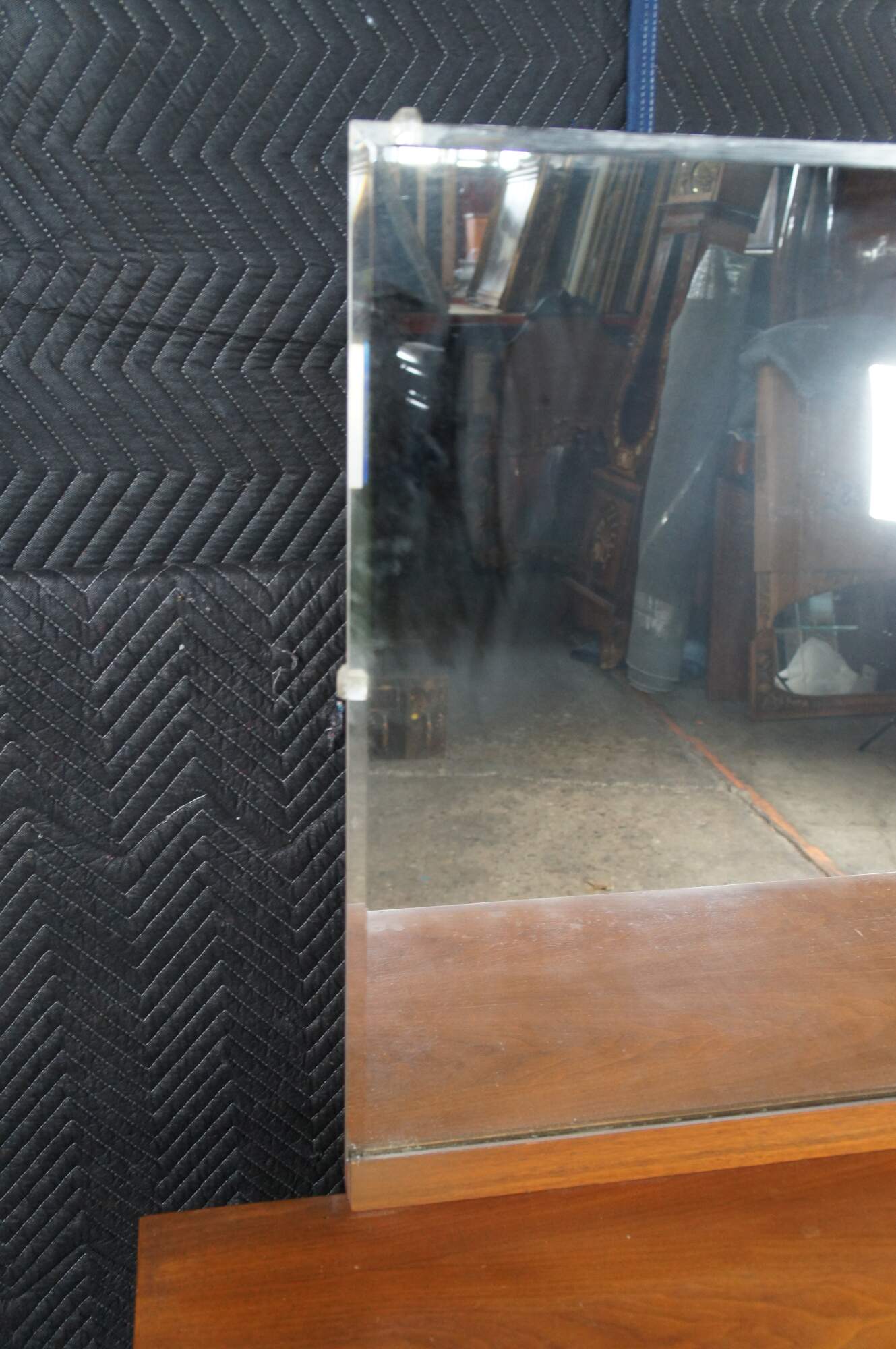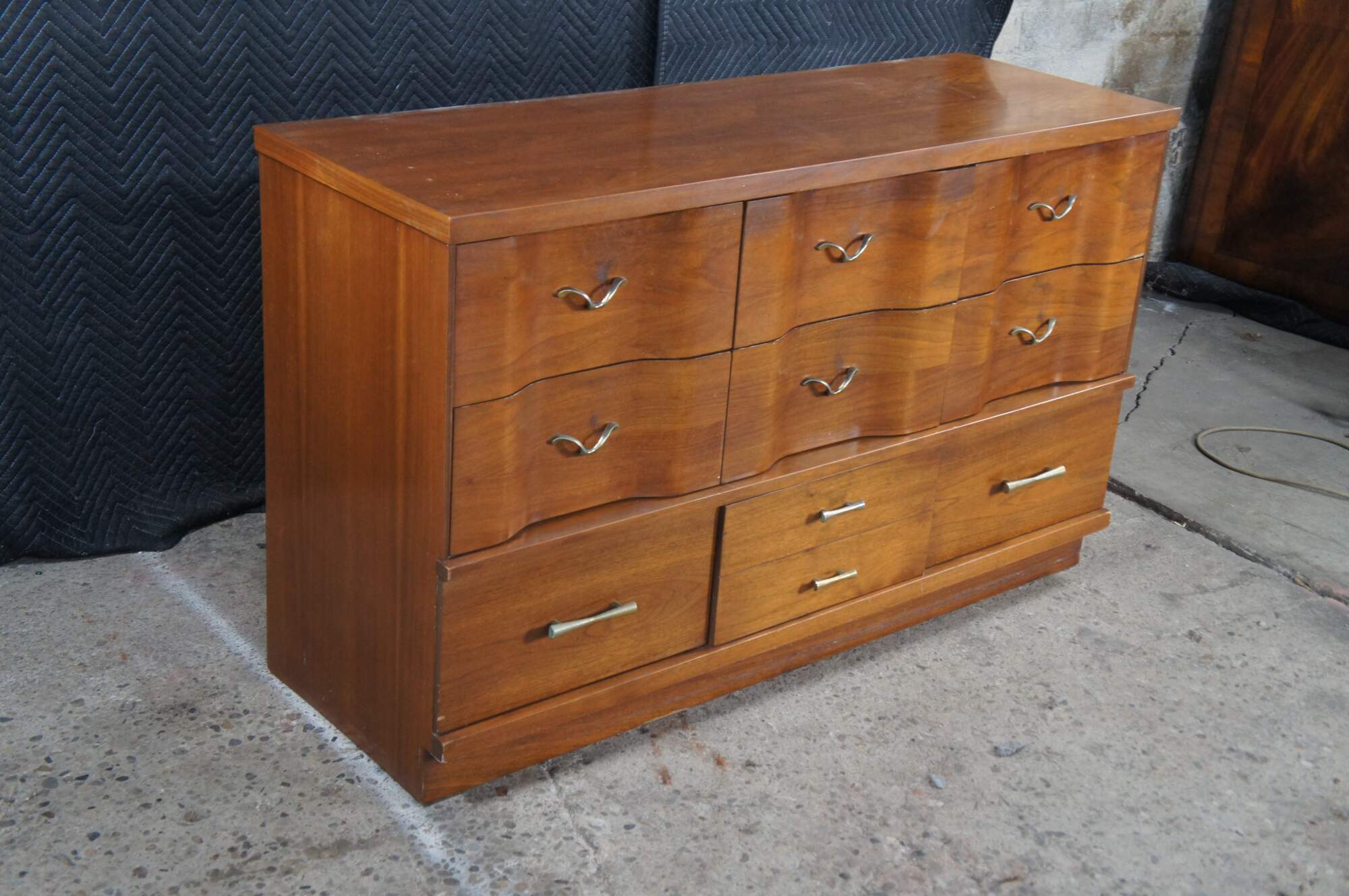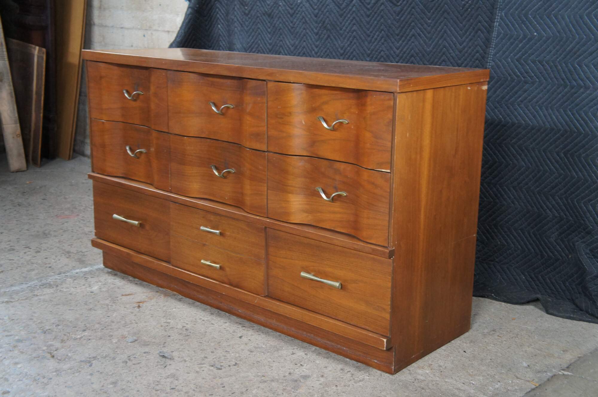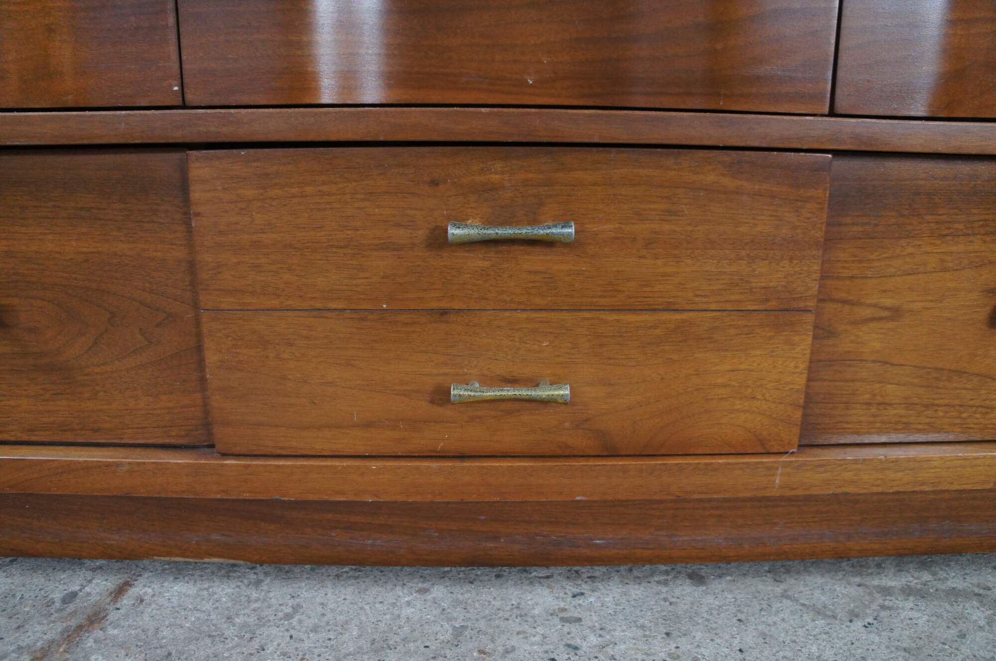 Mid century modern vanity dresser. Made of walnut featuring 9 serpentine drawers and a rectangular mirror.