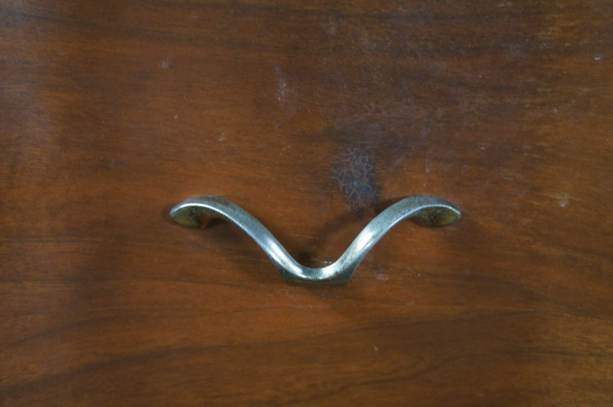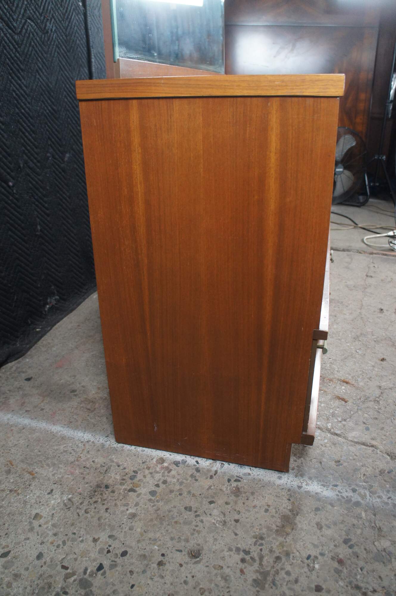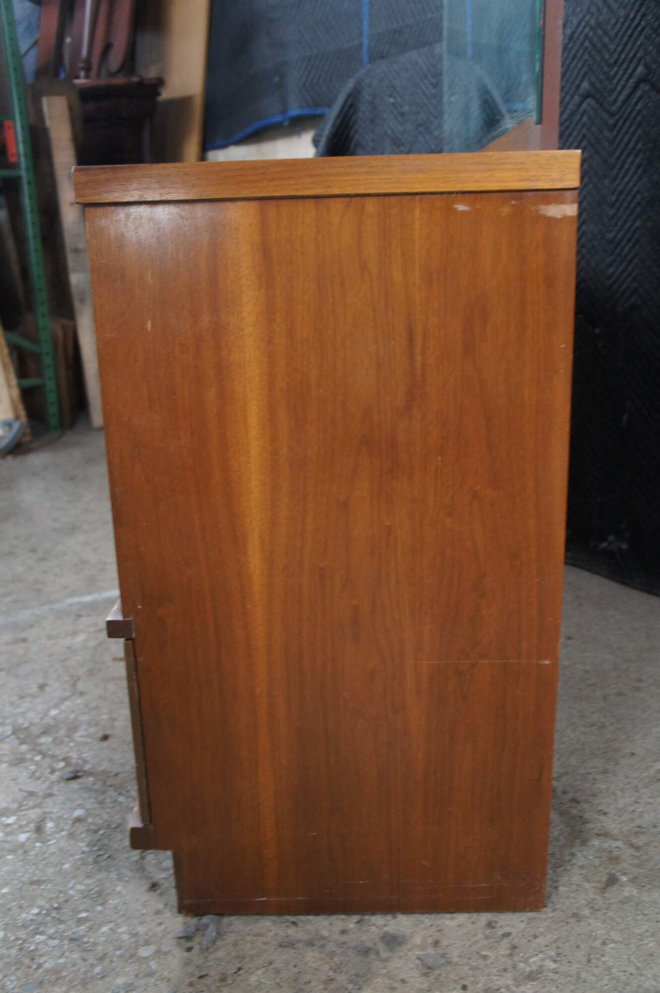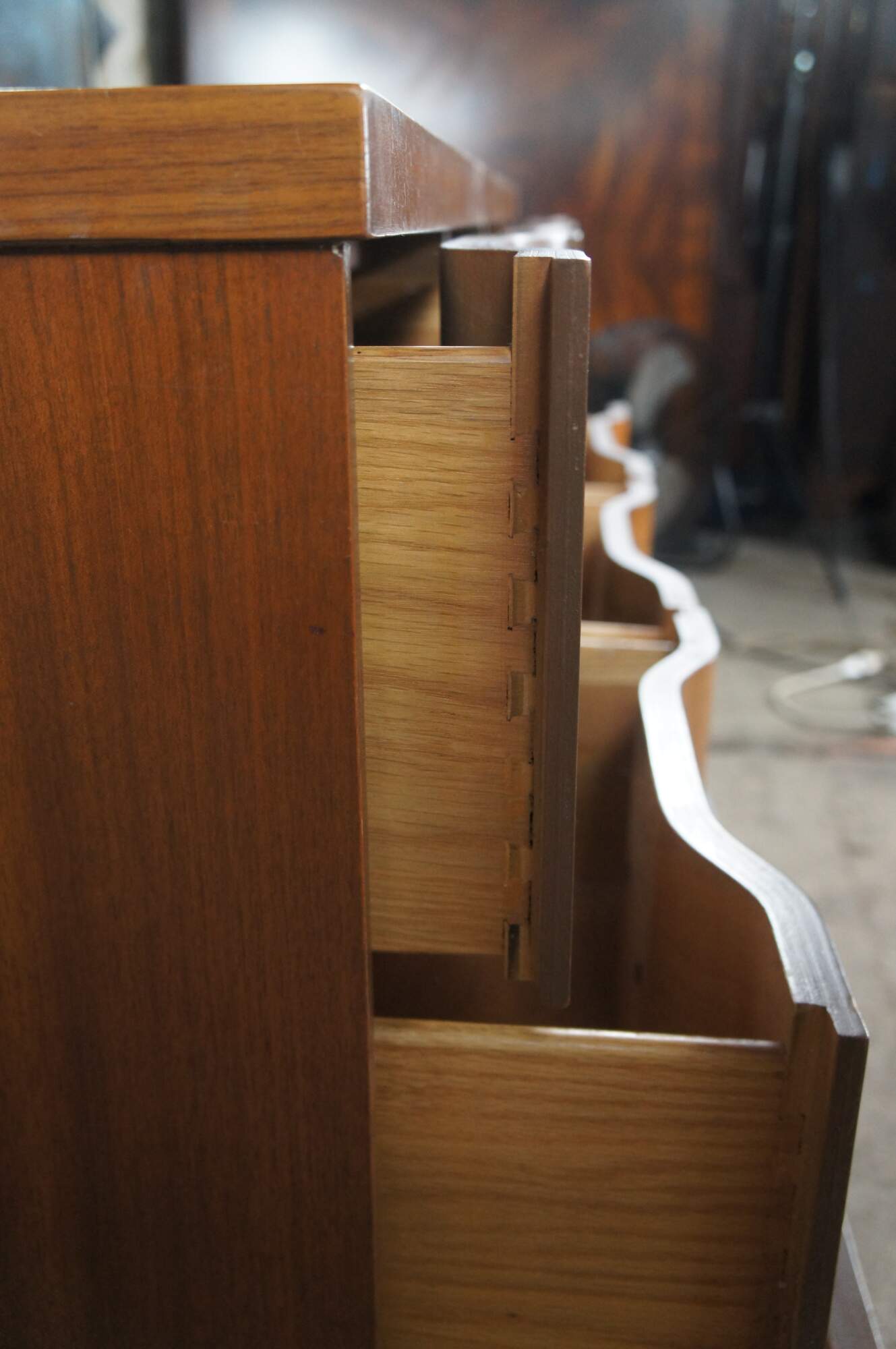 Mid century modern vanity dresser. Made of walnut featuring 9 serpentine drawers and a rectangular mirror.